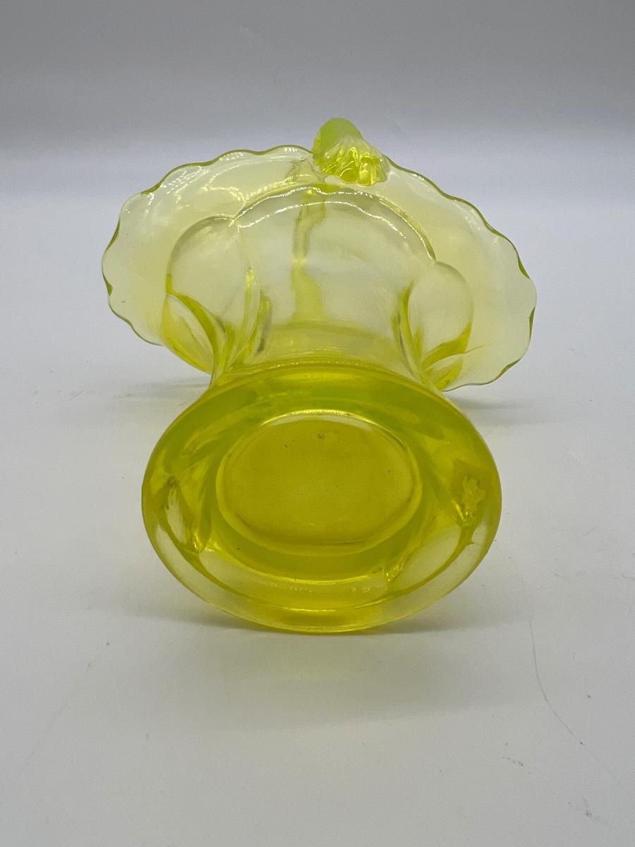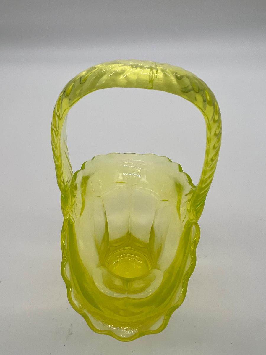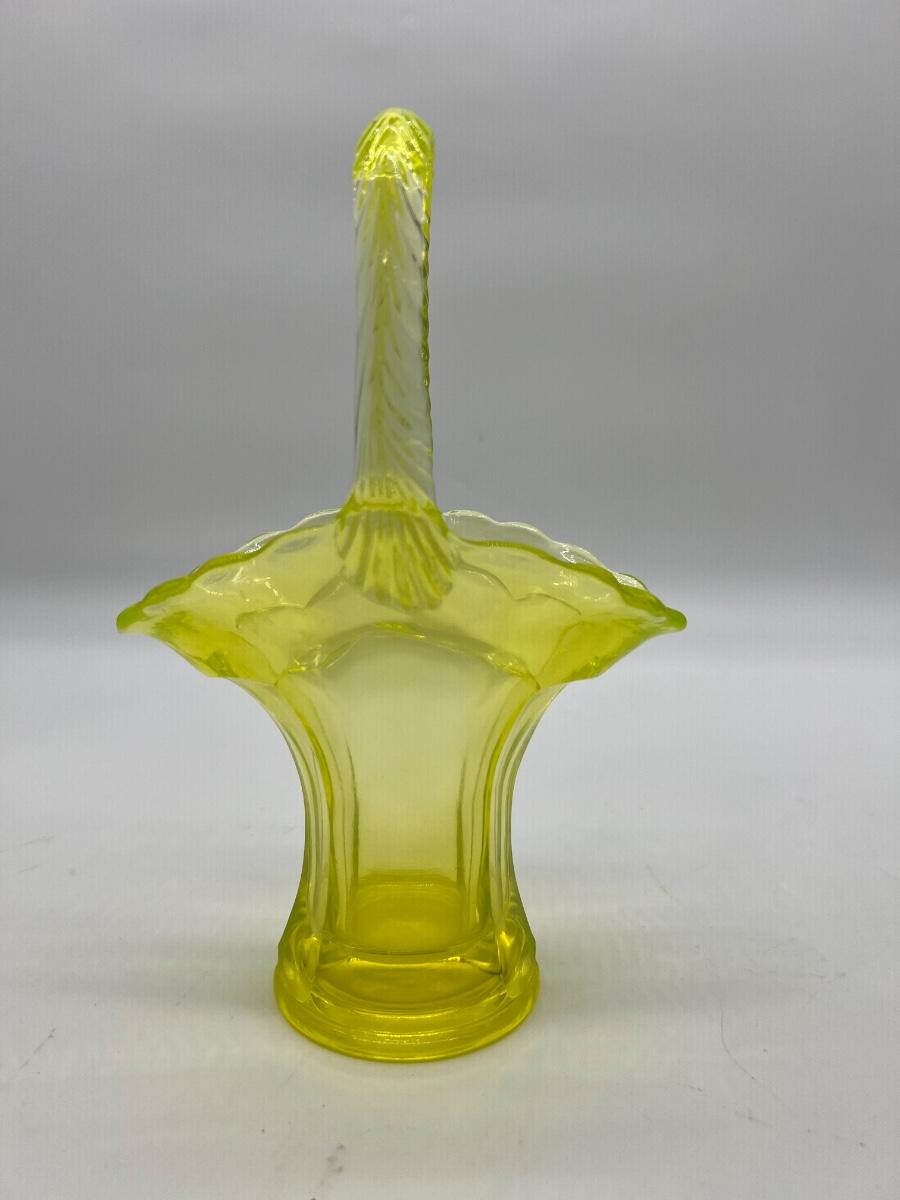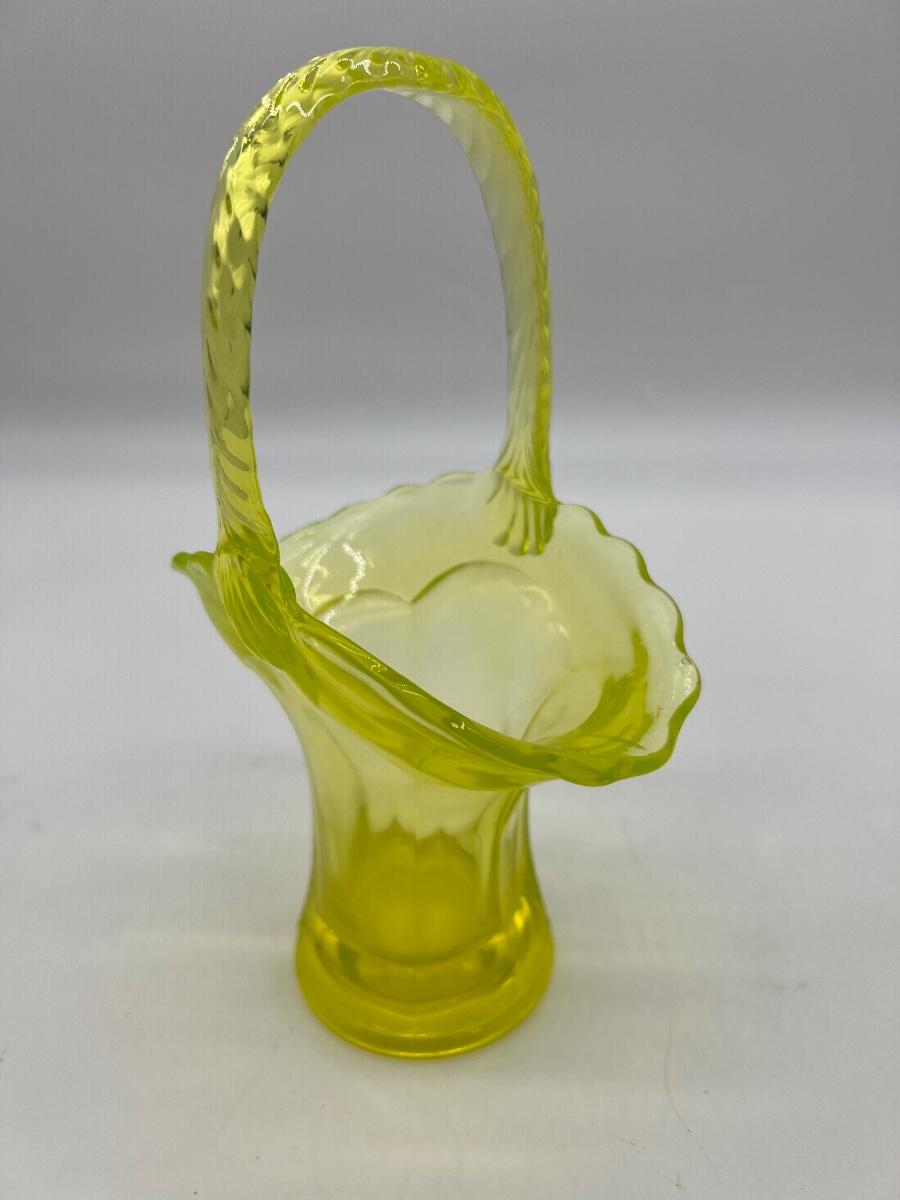 Vintage Green depression Uranium Glass Basket with handle UV Reactive measures 8 1/2 inches tall and 5 1/2 inches wide.
