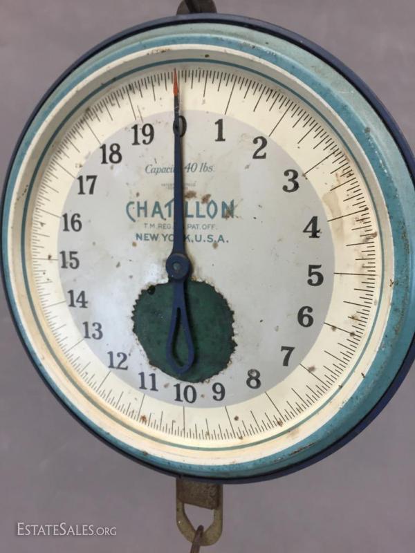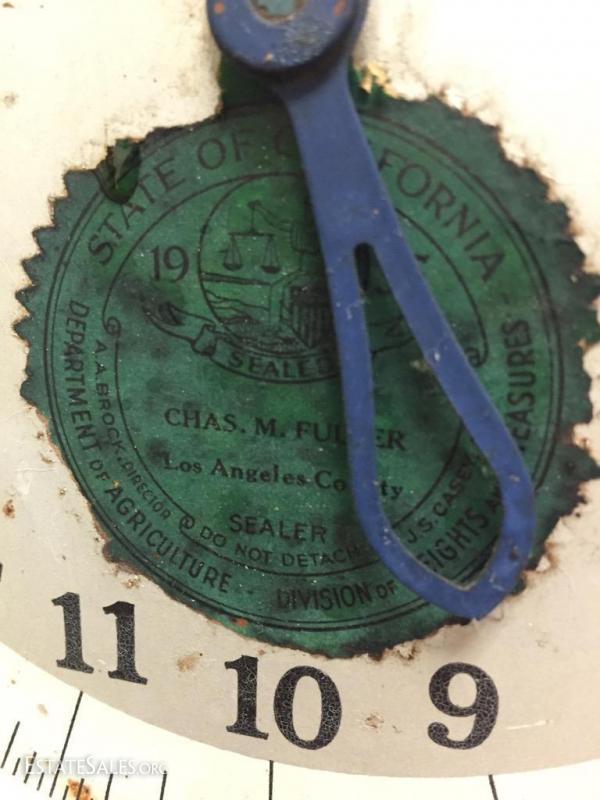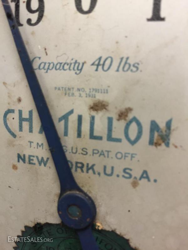 Vintage Depression-era Chantillon & Sons produce scale, w/ Department of Agriculture tag dating "1935". Hangs 22"