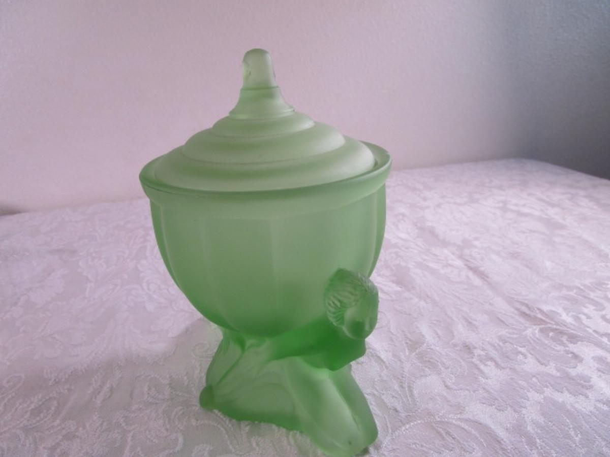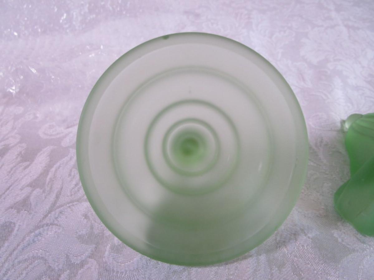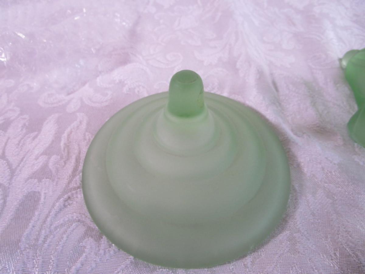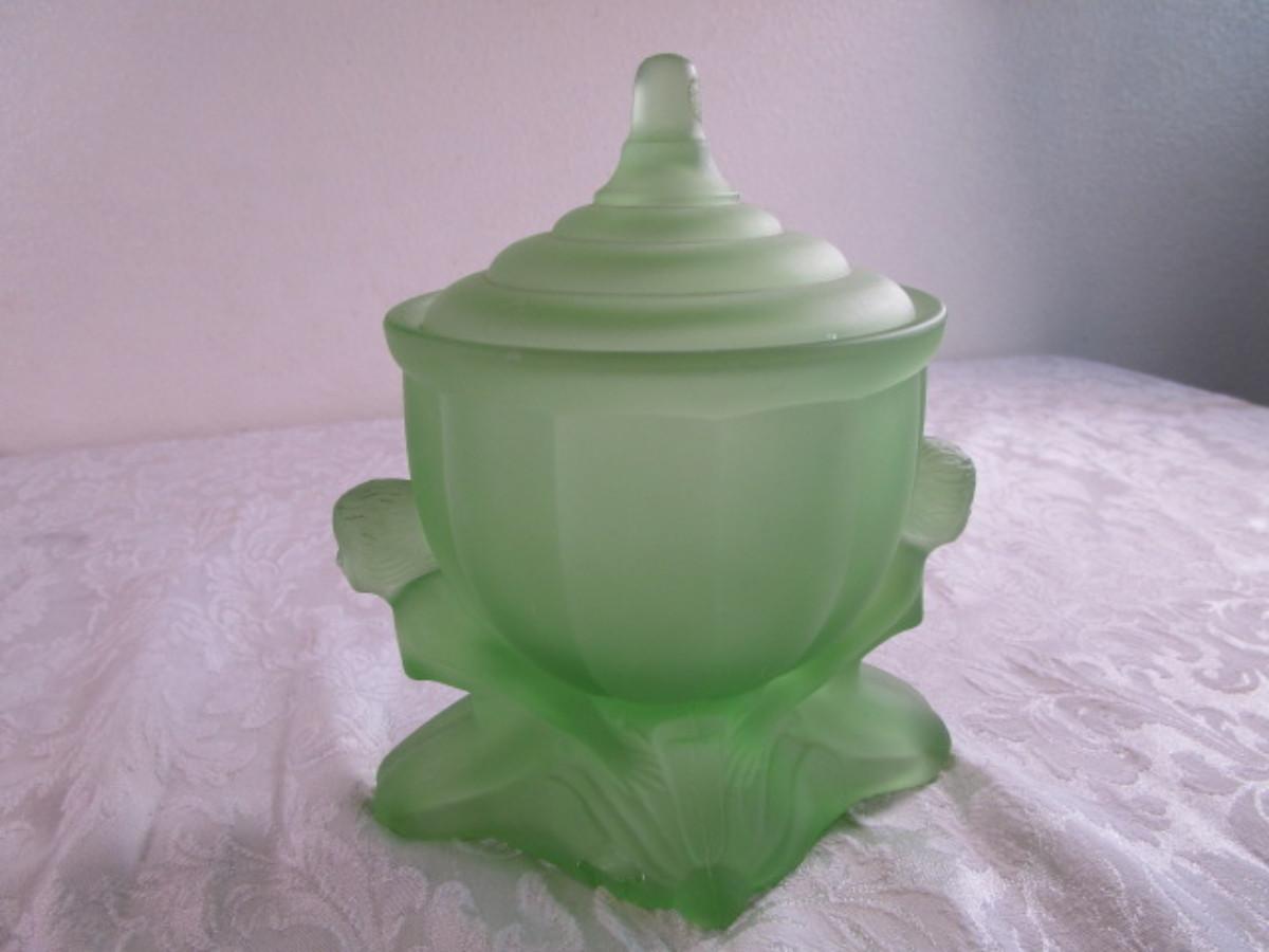 Vintage Derma Dolly Sisters powder jar, green depression satin glass