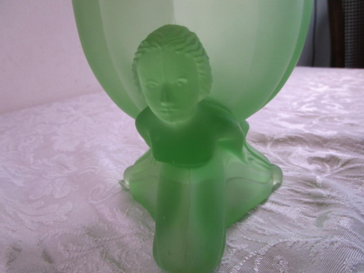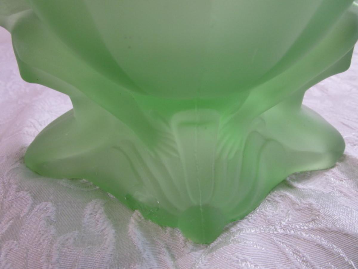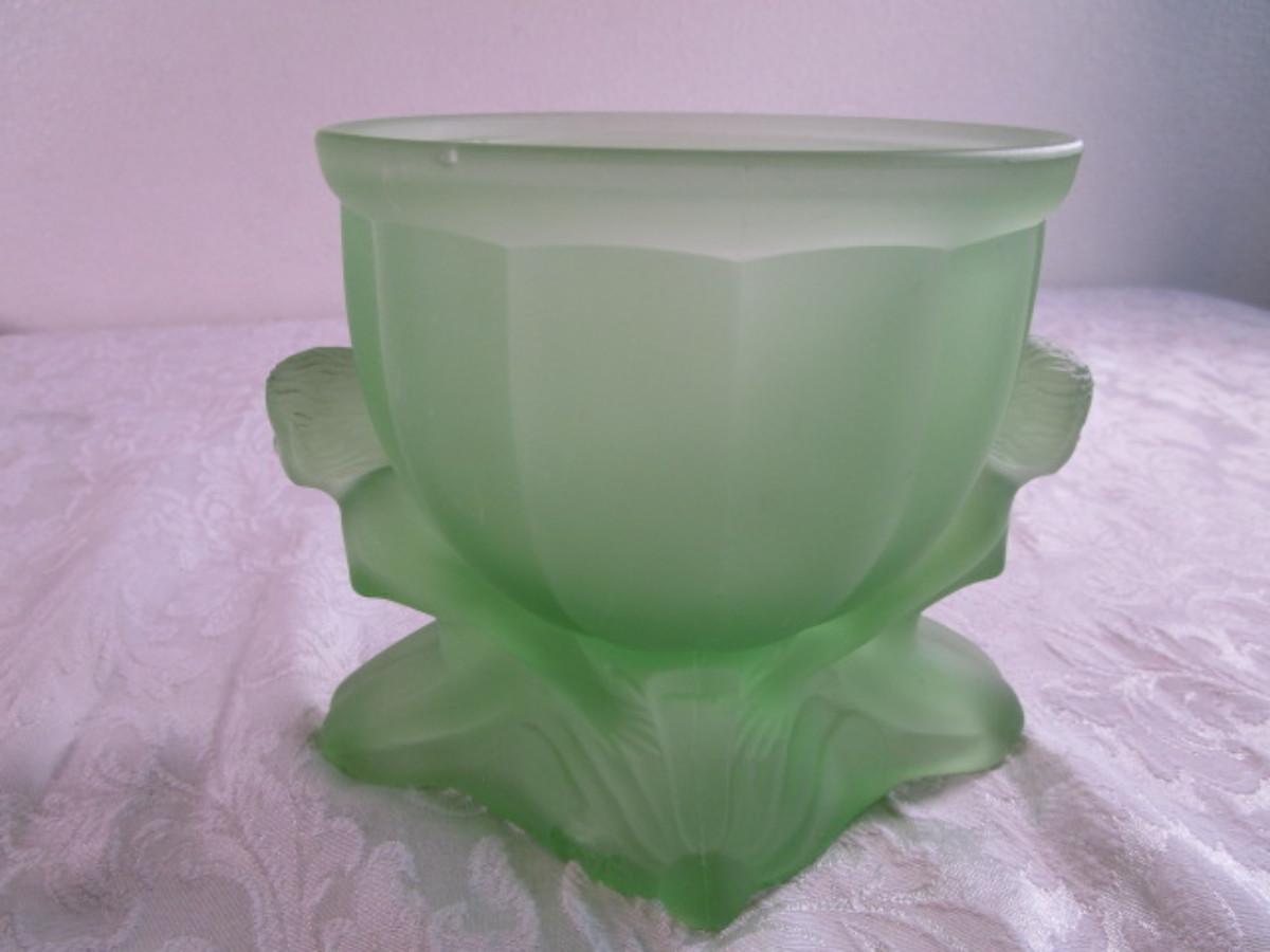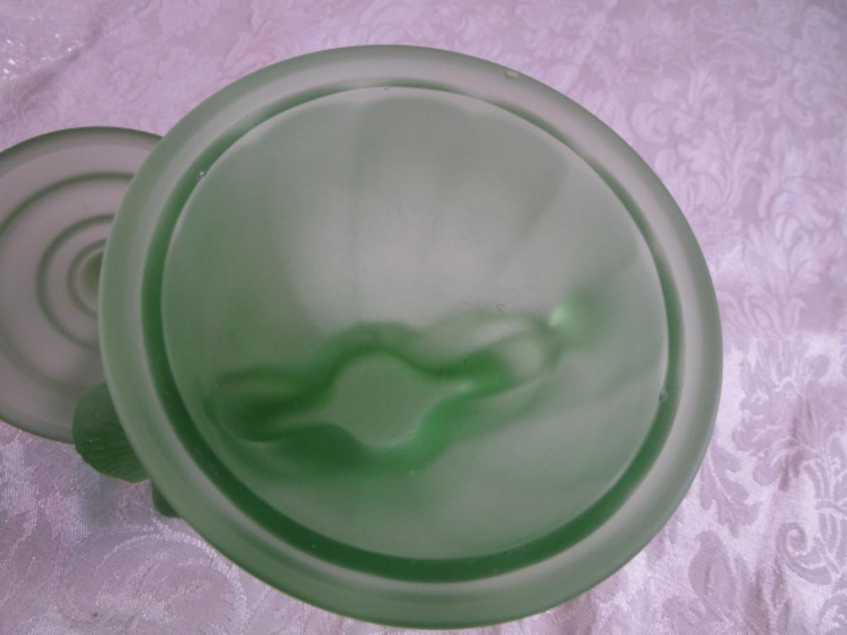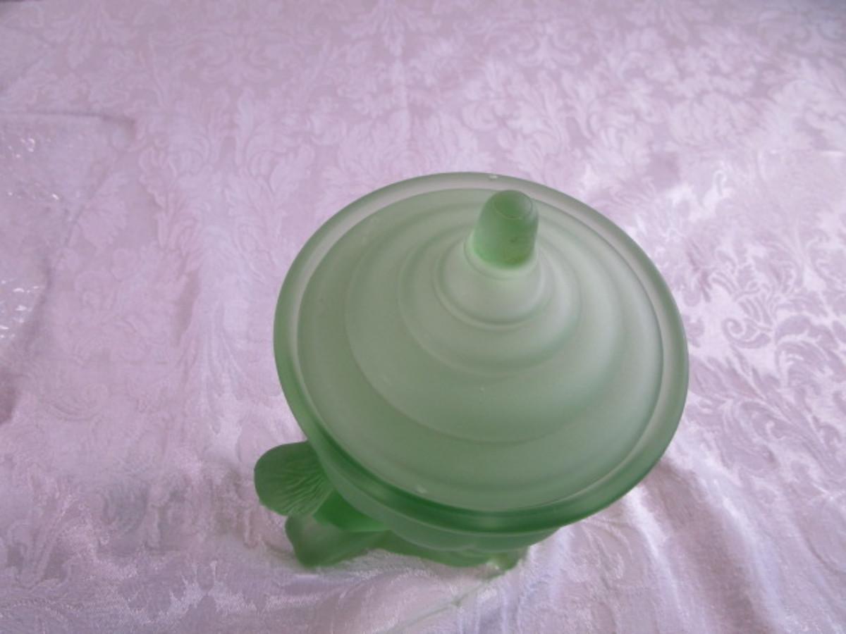 Vintage Derma Dolly Sisters powder jar, green depression satin glass
