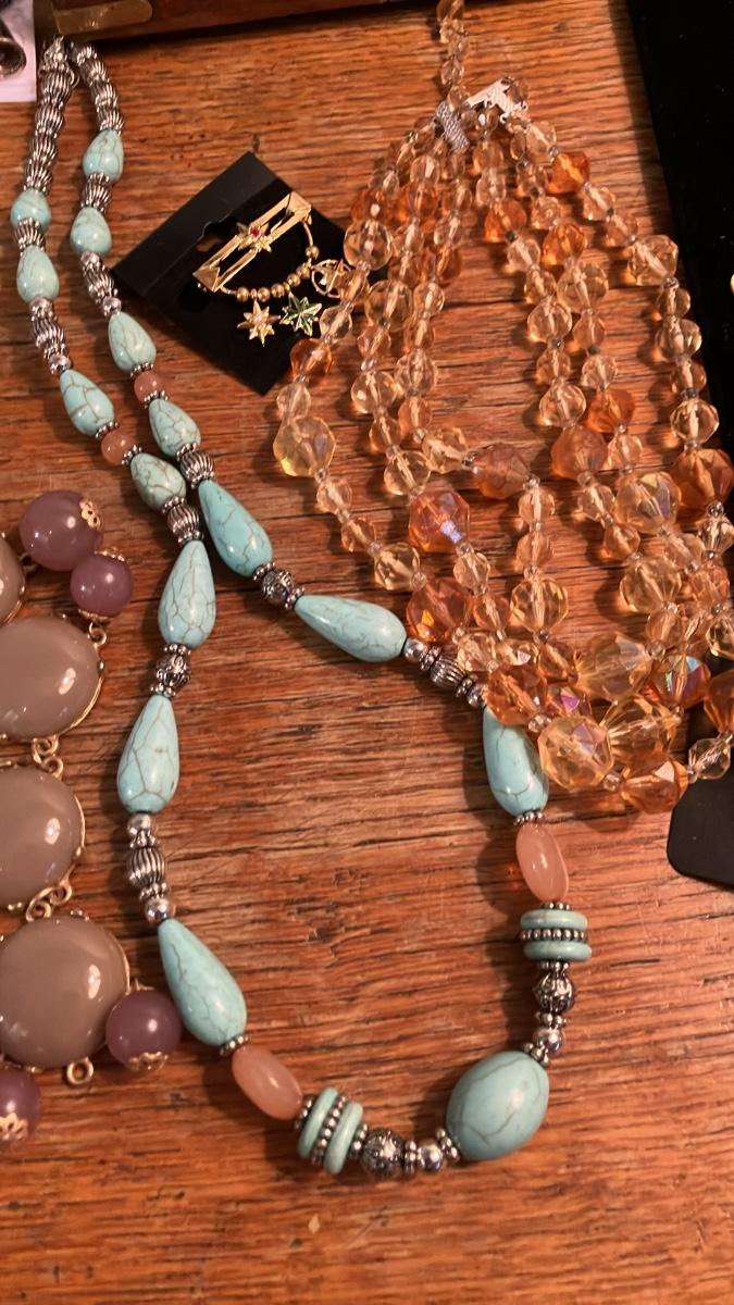 This is an attractive, curated collection of approximately 24 vintage and designer-signed costume jewelry pieces, sold as a single lot with a charming vintage wooden jewelry box featuring brass inlay accents. The jewelry appears to be in good to very good wearable condition based on the photo—no obvious major damage, tarnish, or missing stones visible. The assortment includes a mix of necklaces (beaded, pearl-style, statement pendants), earrings (clip-on and possibly pierced), brooches/pins, and bracelets. Highlights include faux pearls, turquoise-like beads, floral/enamel designs, gold-tone metals, and possible designer influences.