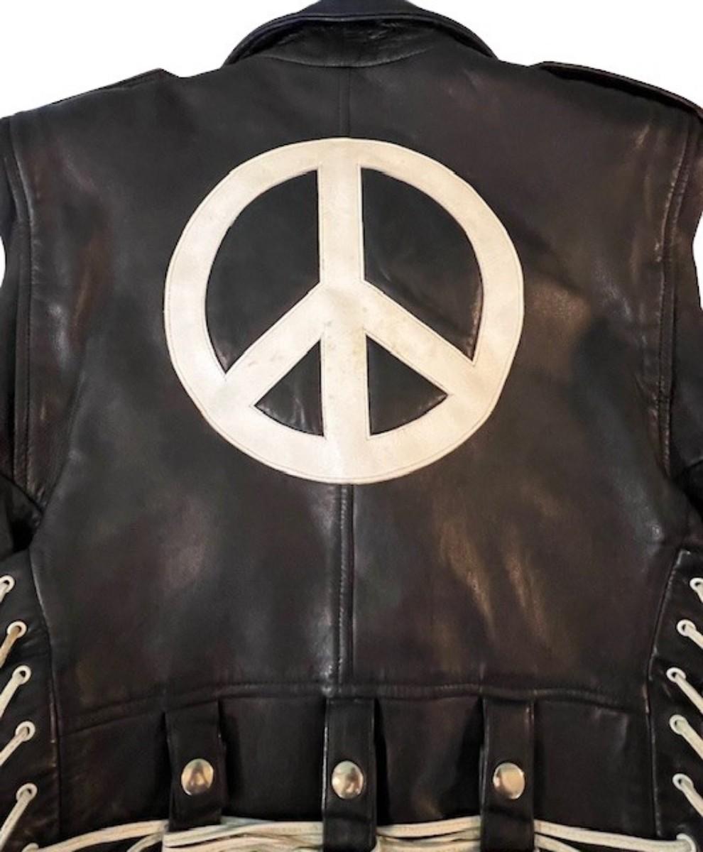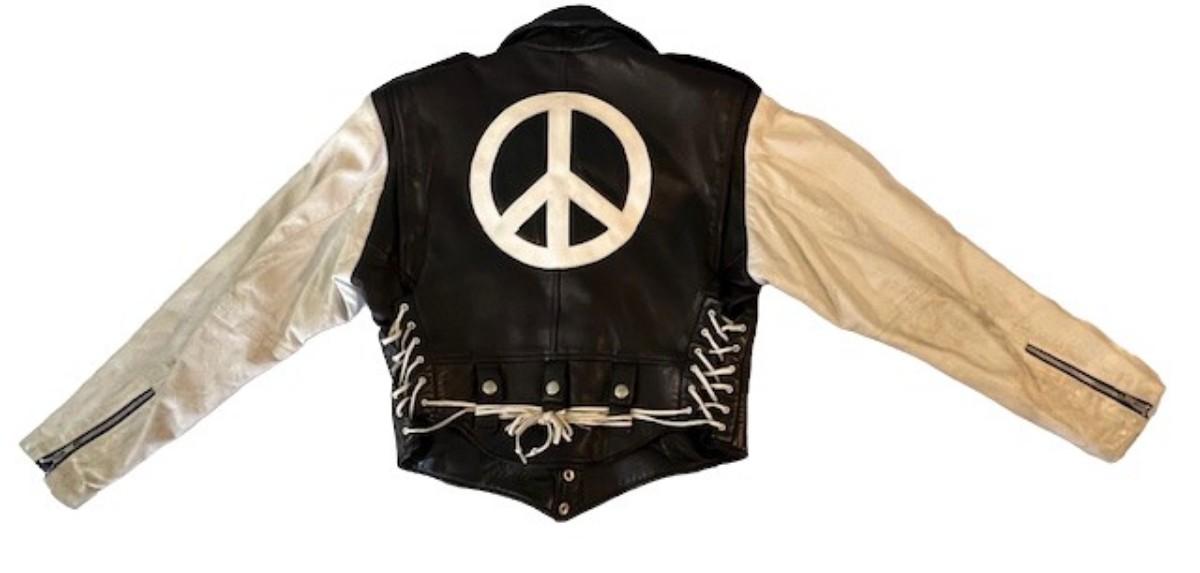 Has a peace symbol on the back. Size ladies' medium, but runs small. Age related wear.