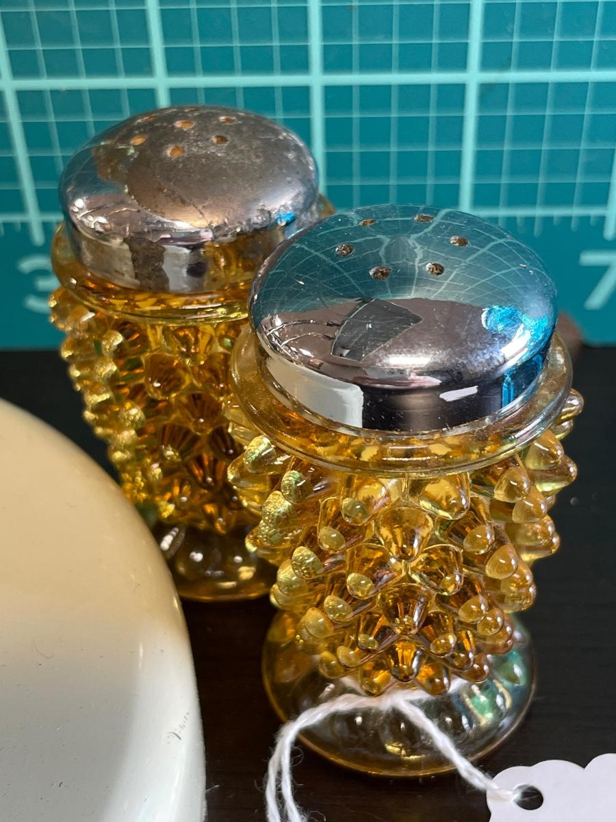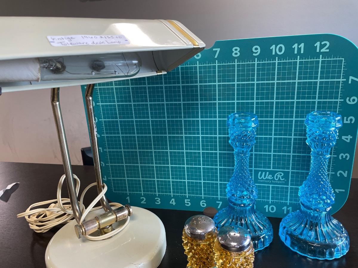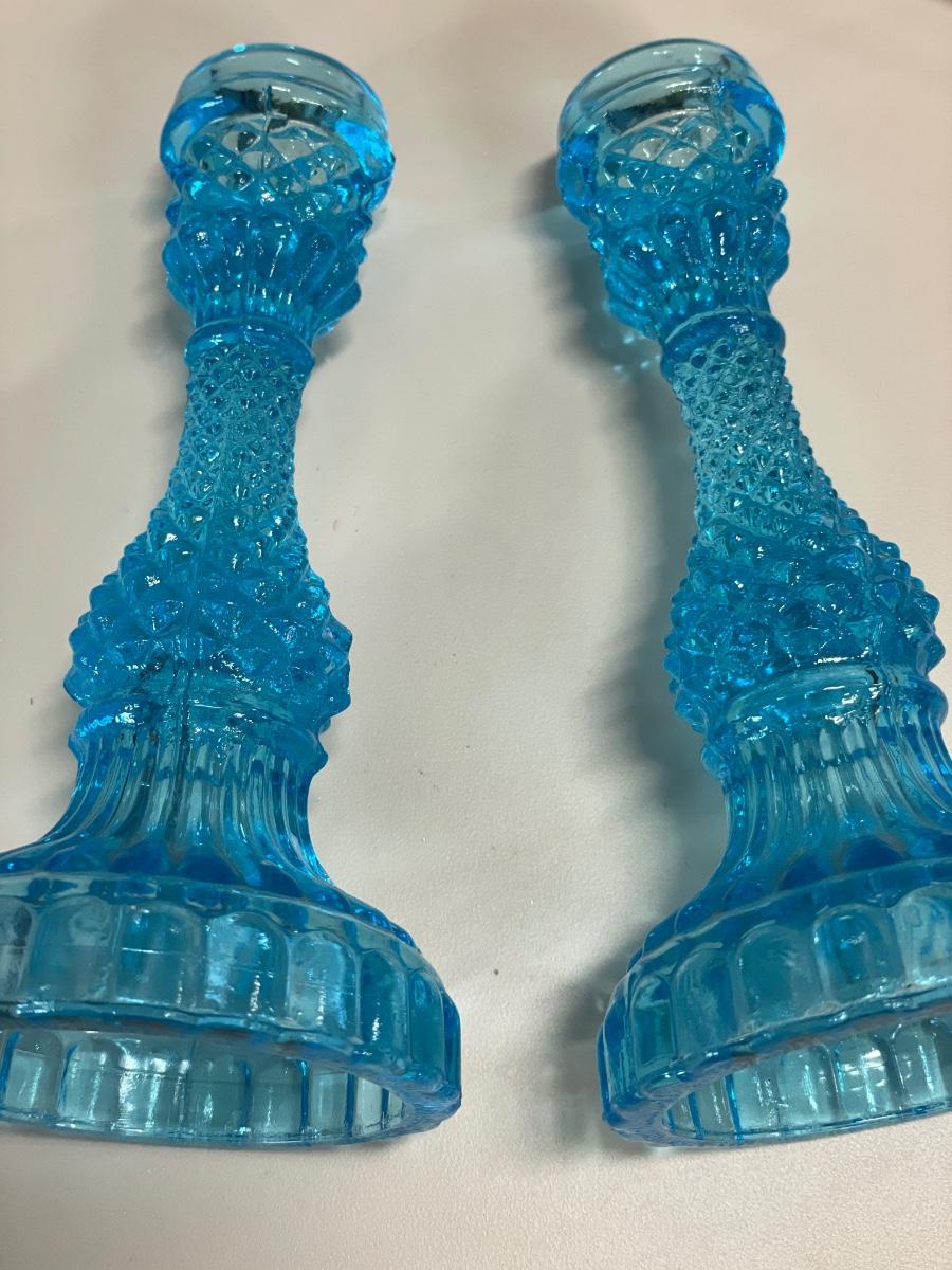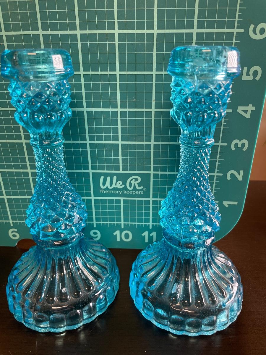 Beautiful blue candlesticks with Amber glass salt and pepper shakers