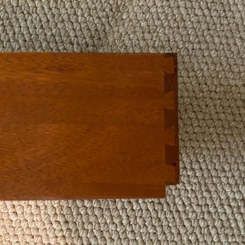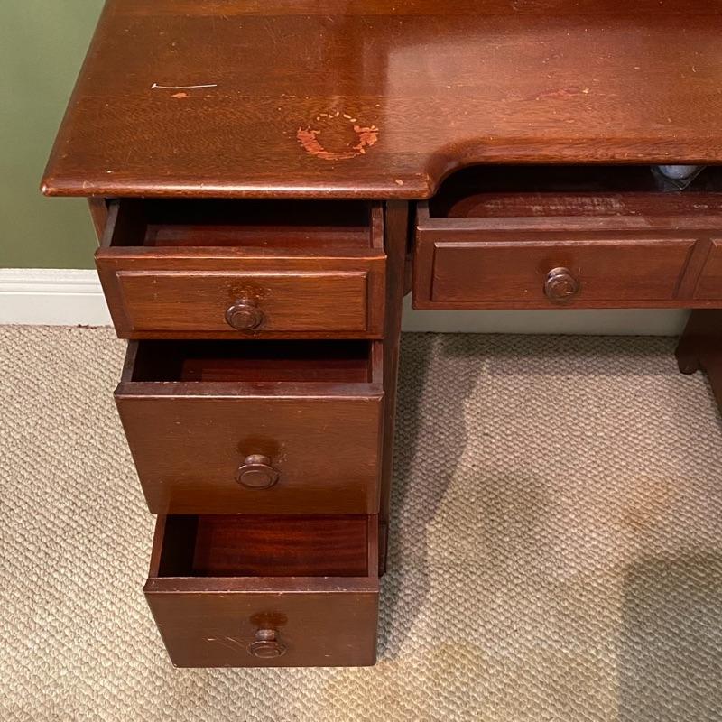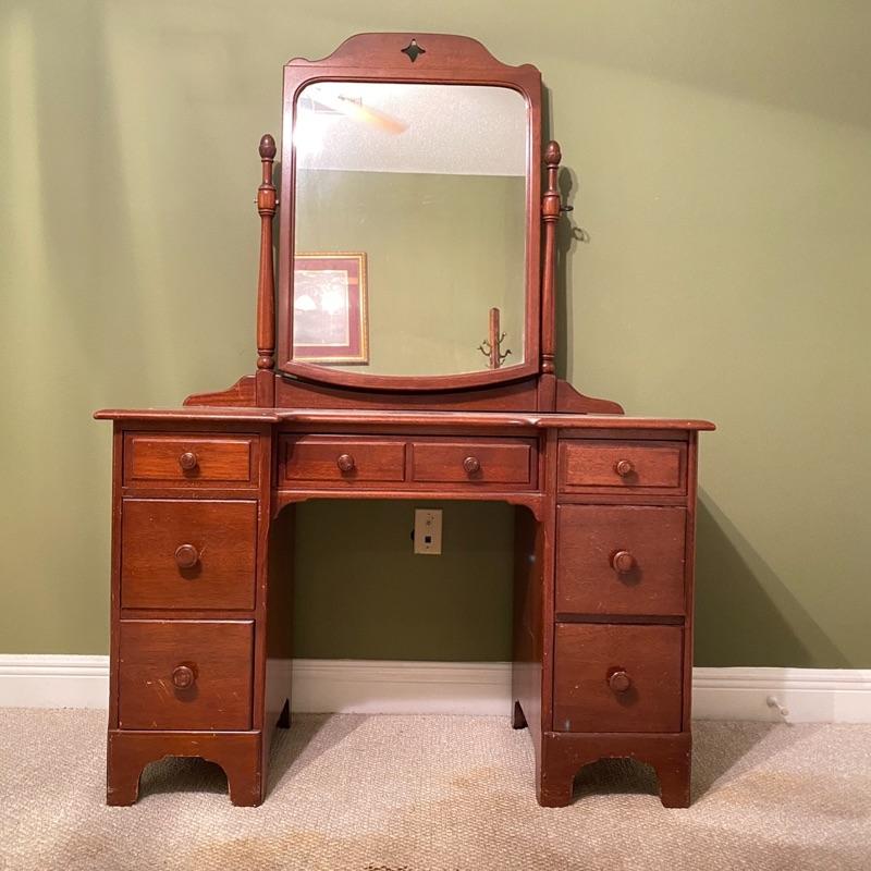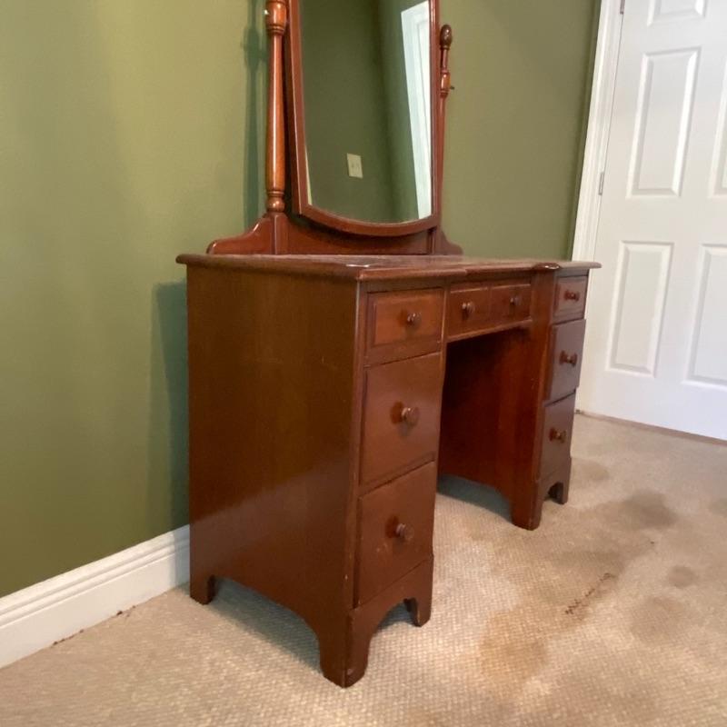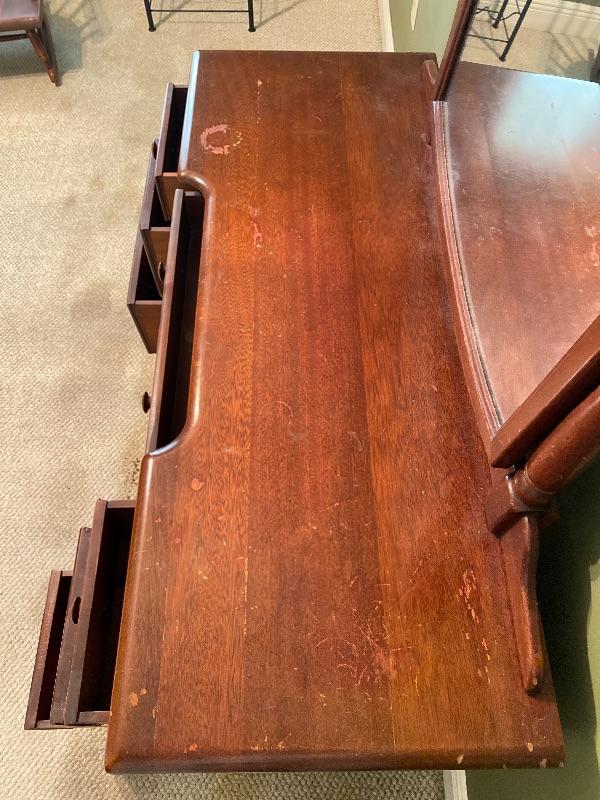 7 Drawers / Tilting Mirror / Solid Wood / Some top coat wear & scratches / 46” L x 18”D x 29” H to desk - 65” To mirror top