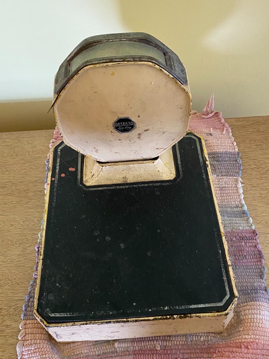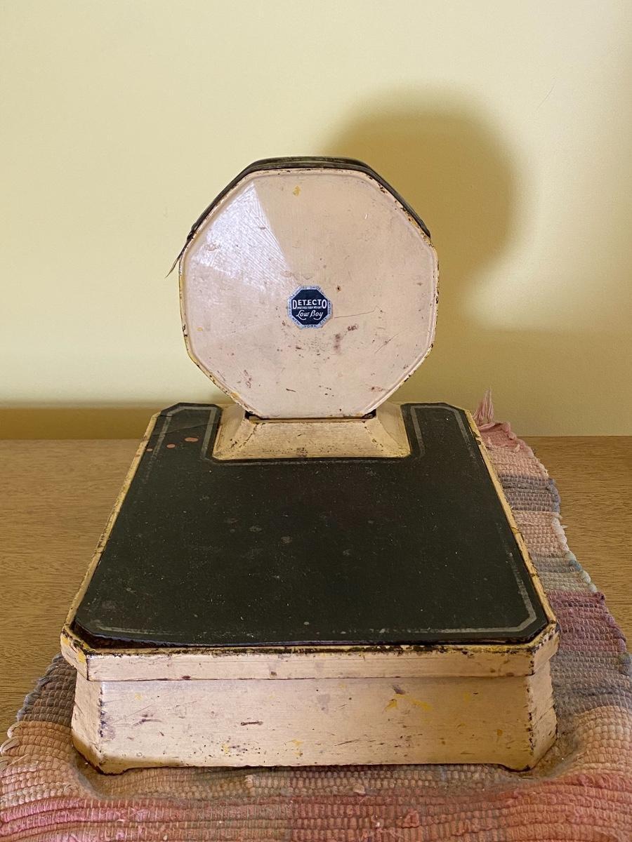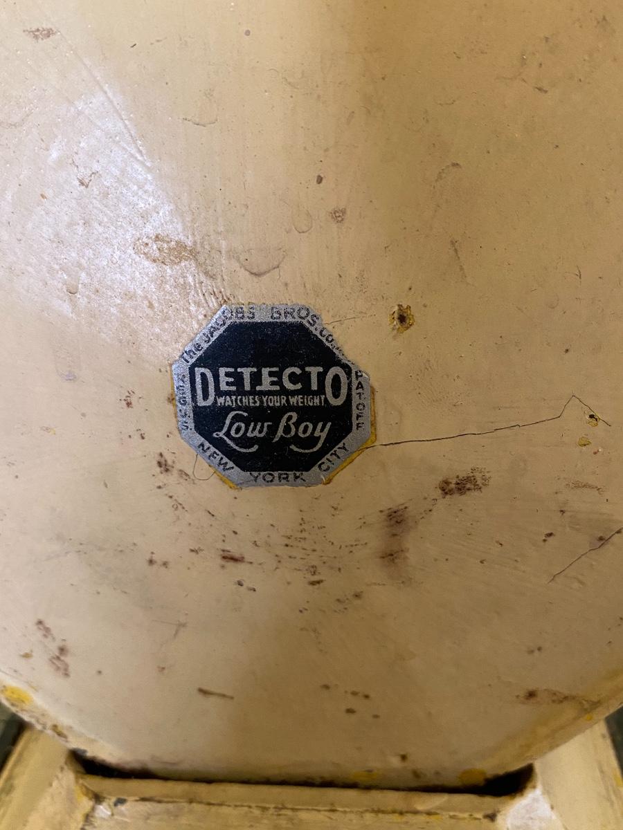 Vintage Detecto Low Boy bathroom scale. Off white beige color. Has signs of age and use but it is fairly accurate, I stepped on it and checked. Heavy cast iron scale, measures about 12"x9" size.