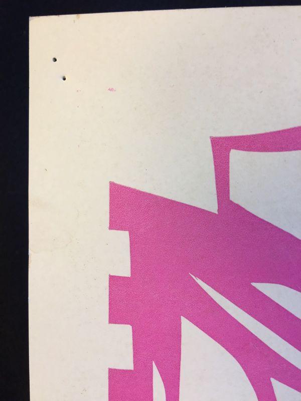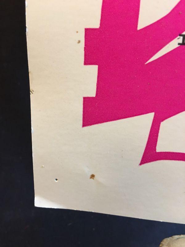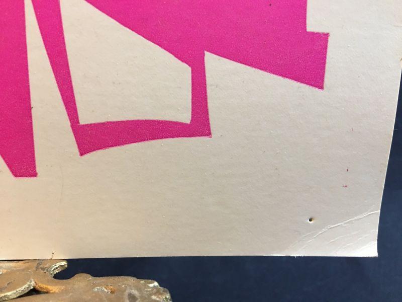 Description: The subject is an original, hand silkscreened poster printed from Hammerpress. Posing brightly colored magenta skeletons dressed in black, vampire-like Victorian garb over an abstracted background. Metallic silver lettering is just the right artistic contrast to spell out “Dia de los Muertos.”