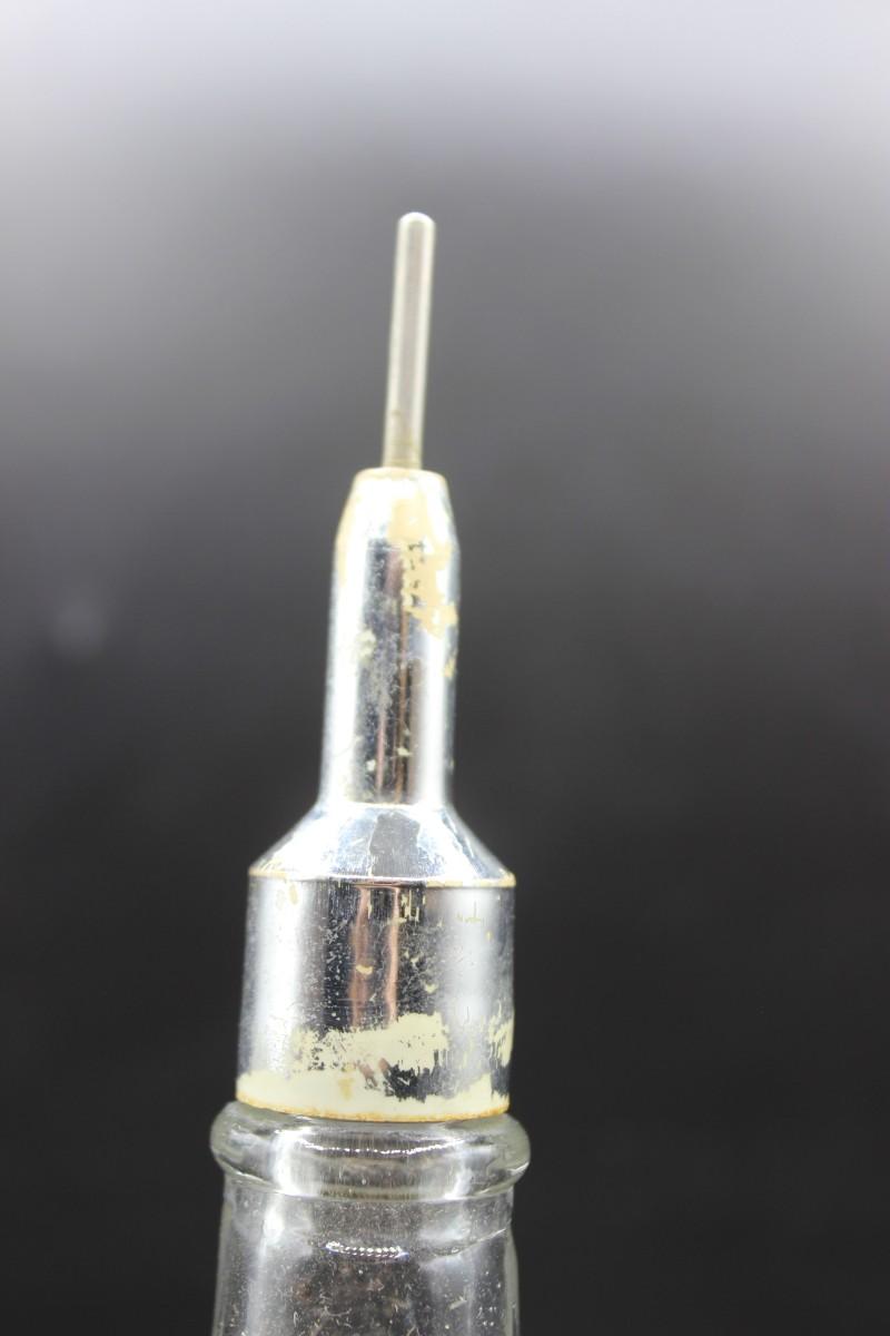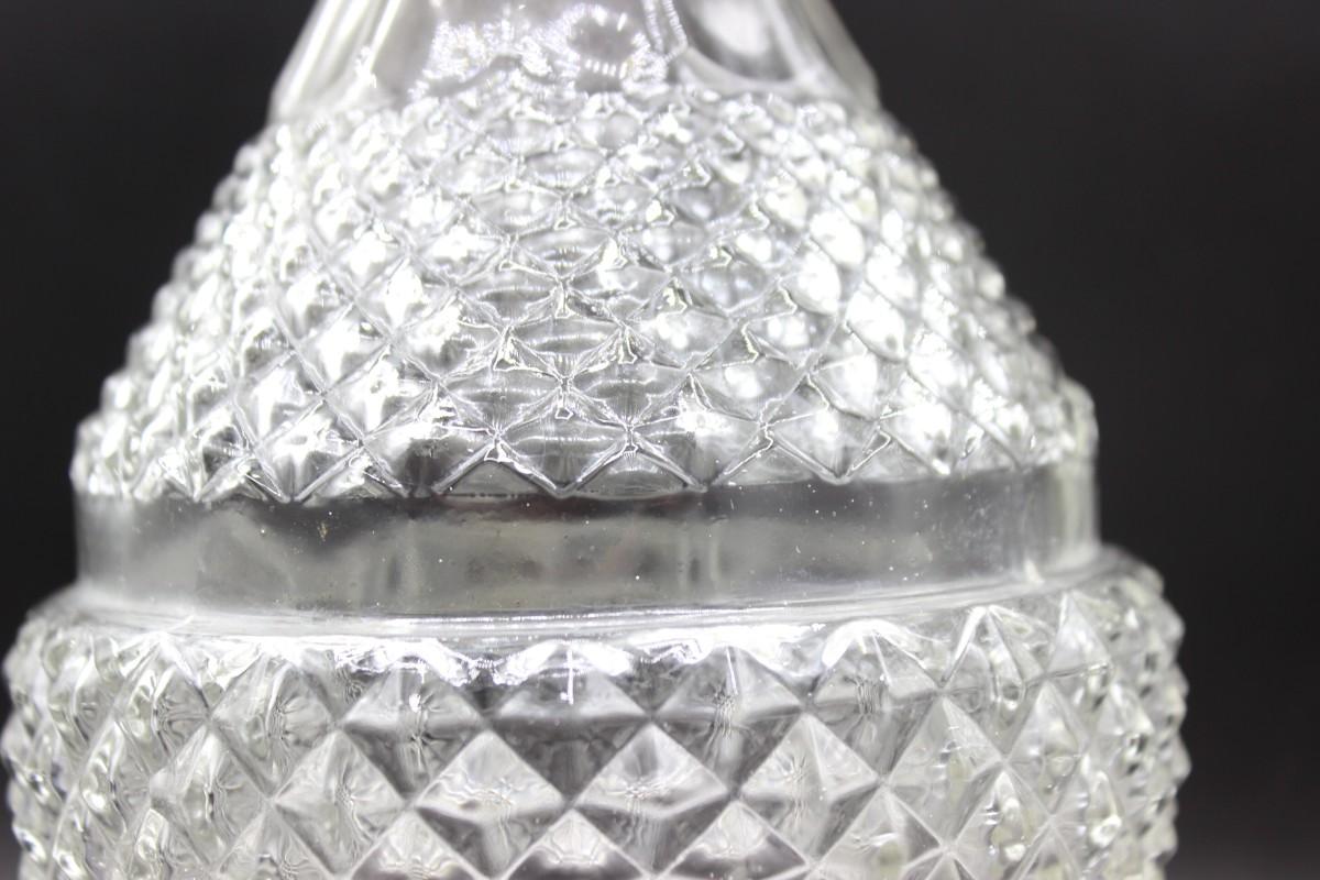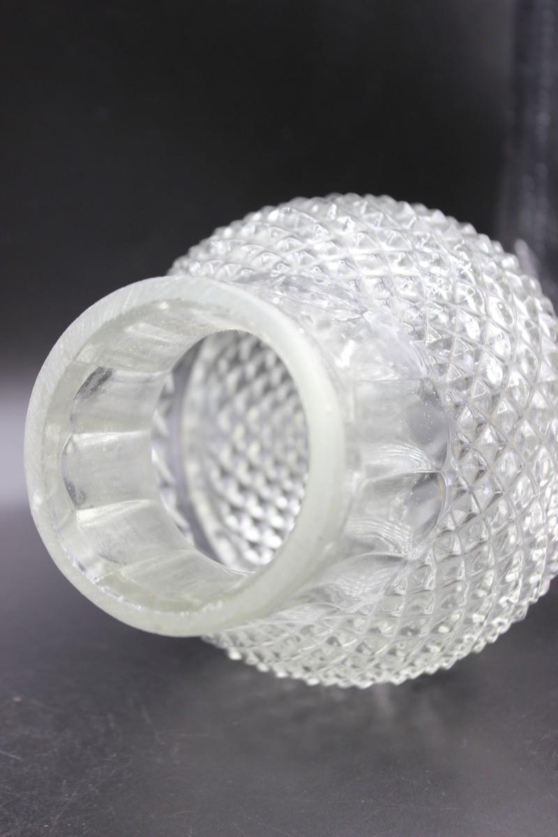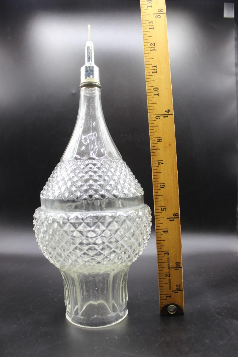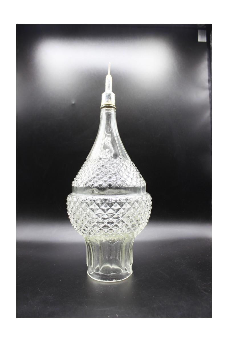 Interesting vintage crystal decanter. Diamond cut pattern decanter would actually sit in a metal frame. Used for wine or cordials. Open end with a pressure release valve end. Unfortunately we don't have the holding base. Cool looking bottle, maybe repurpose, upcycle or find a frame to use properly.