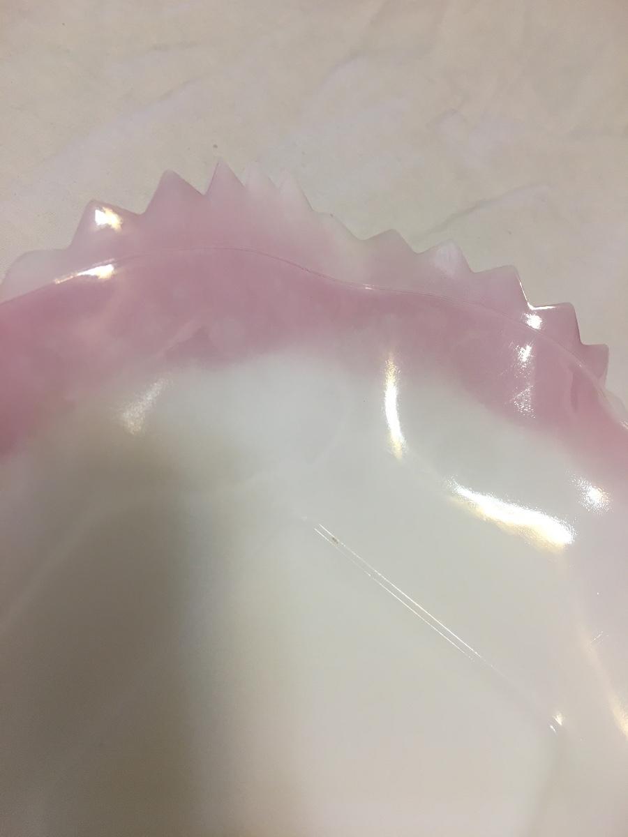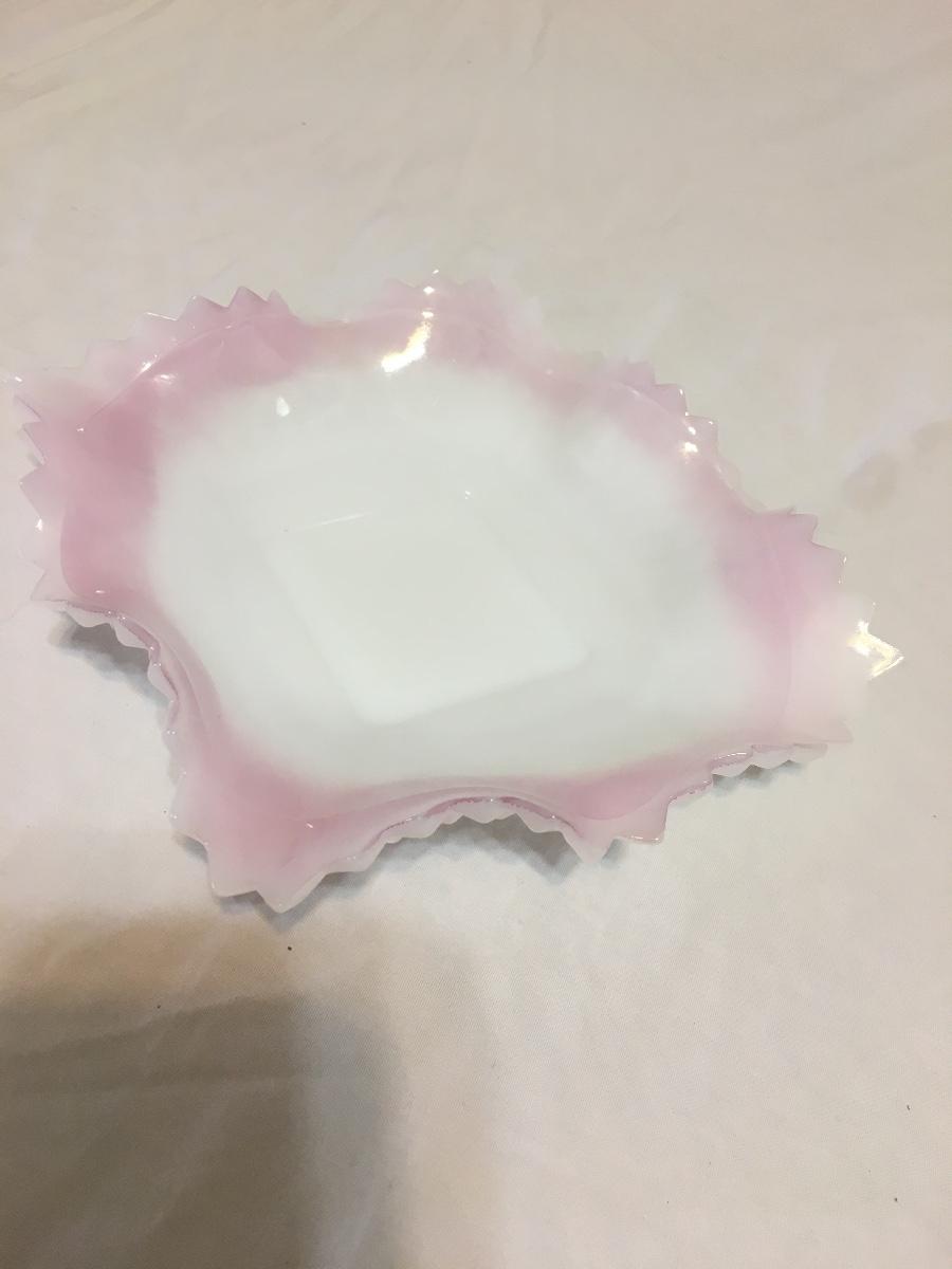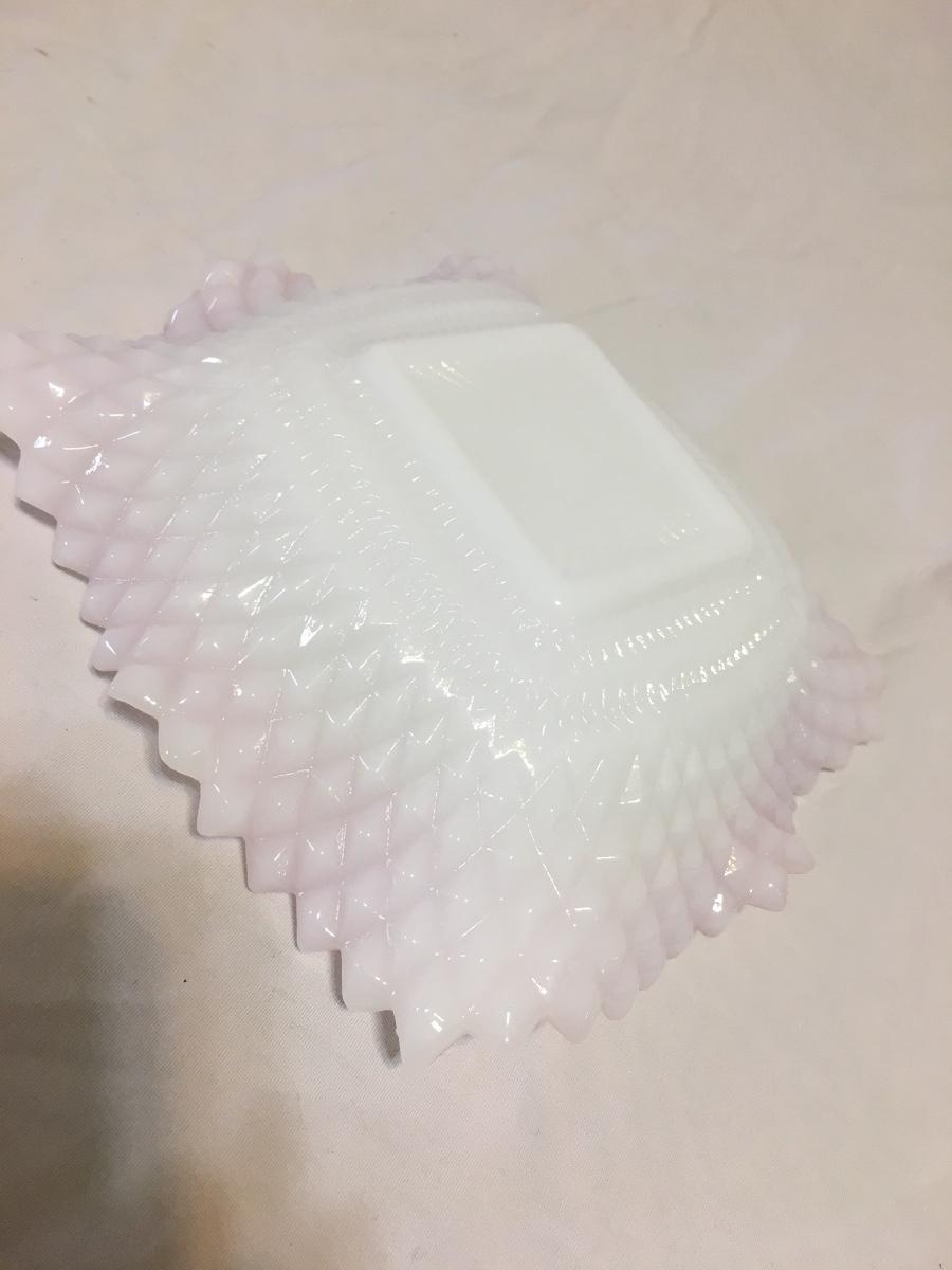 Vintage Diamond Point Candy Dish White Milk Glass W/Pink/Lilac Ruffled Edge 7"