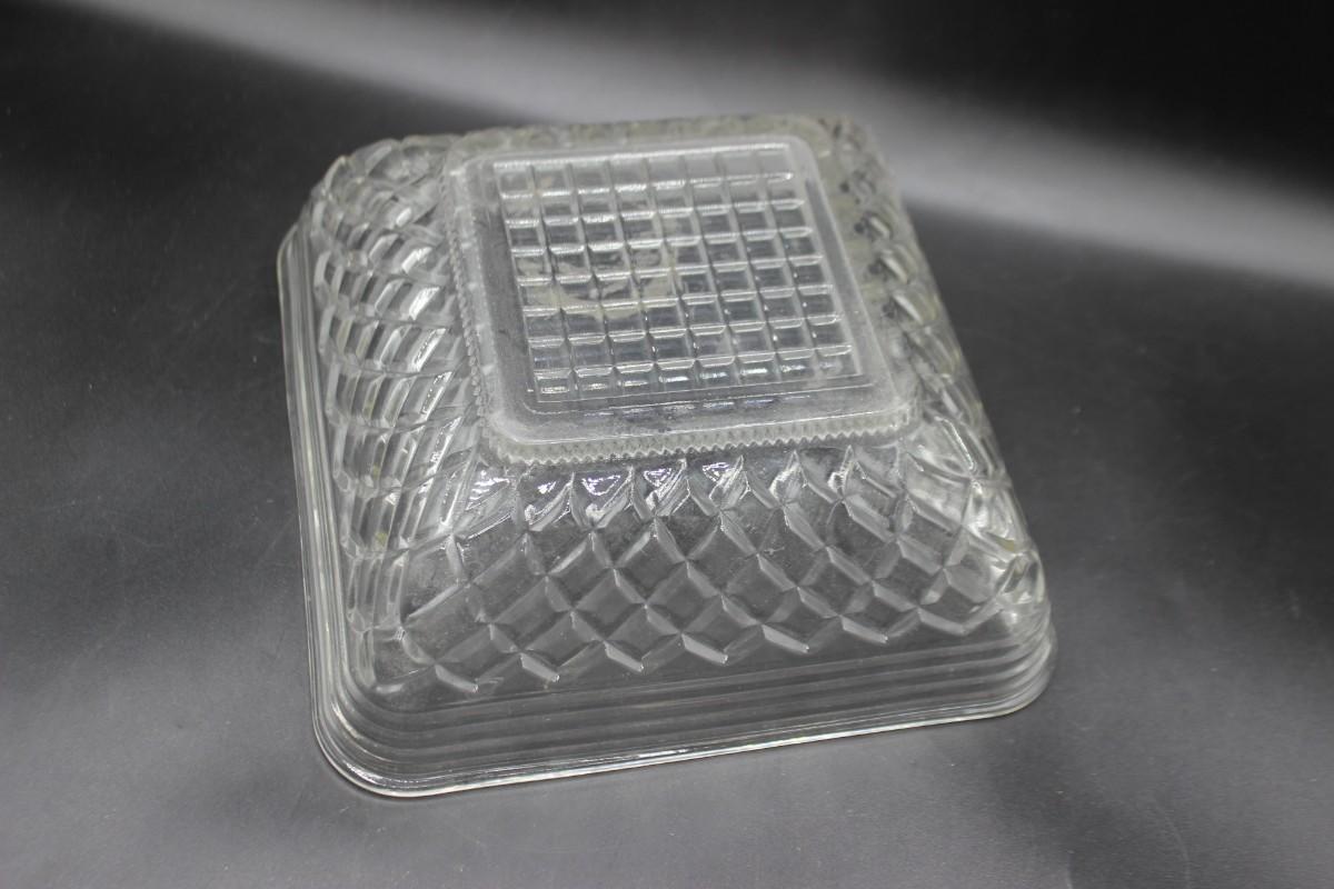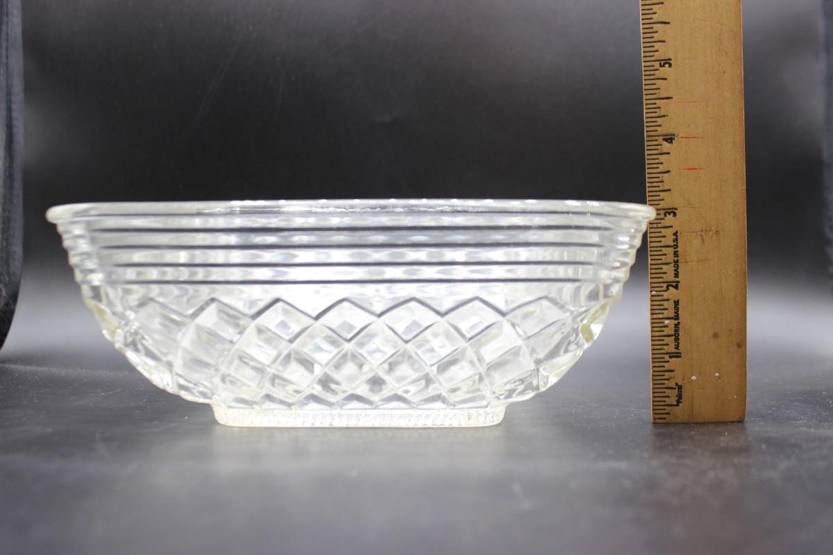 Vintage Diamond Square Pattern Crystal Glass Bowl Tray, there are no significant cracks or chips to the glass and is in good vintage condition. Check pictures for more details and for sizing.
