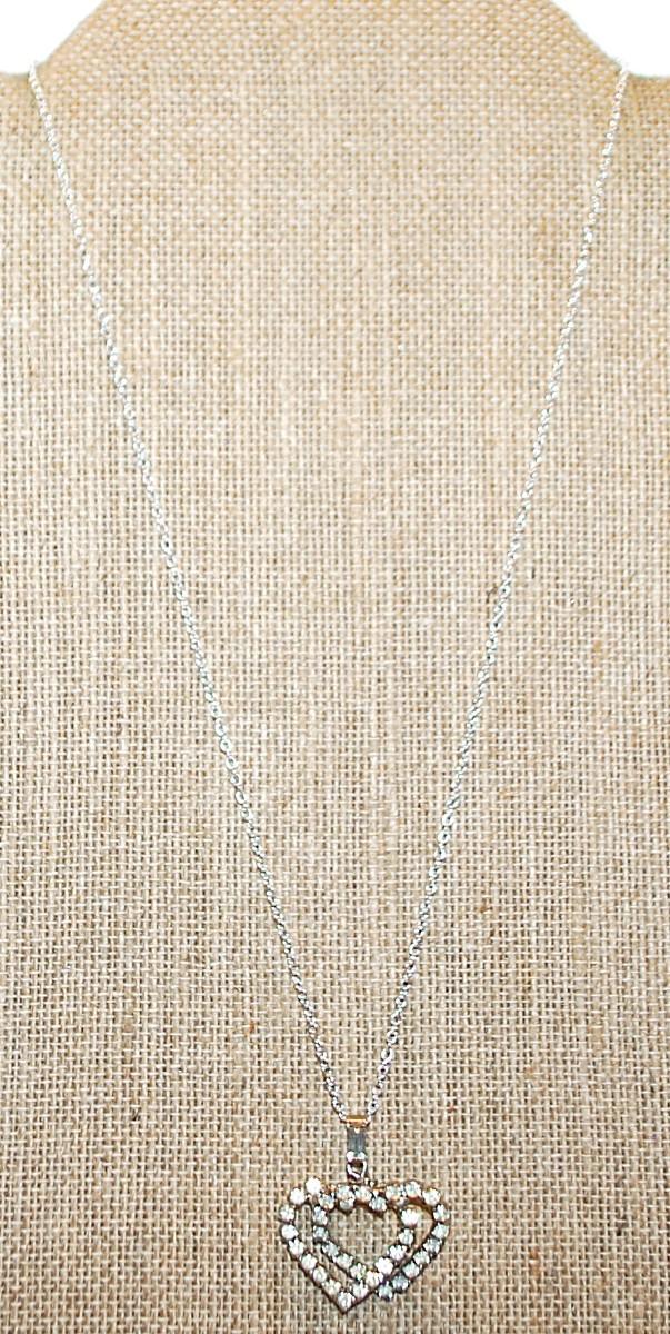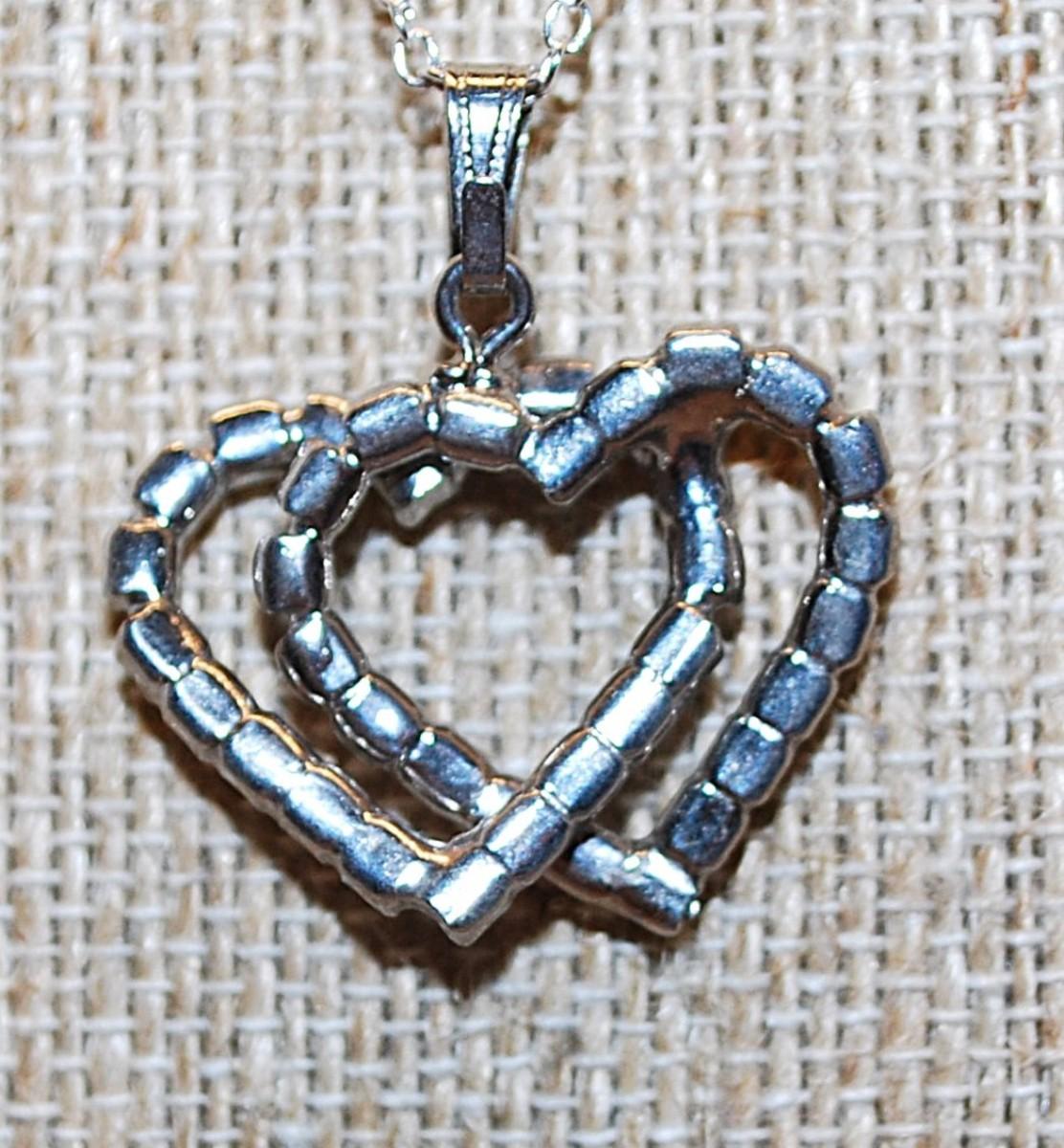 Vintage & Diamond Style Double Bejeweled HEARTS PENDANT (1" x 1") with a Silver Tone Necklace Chain 18" L
