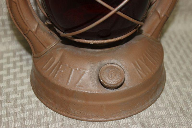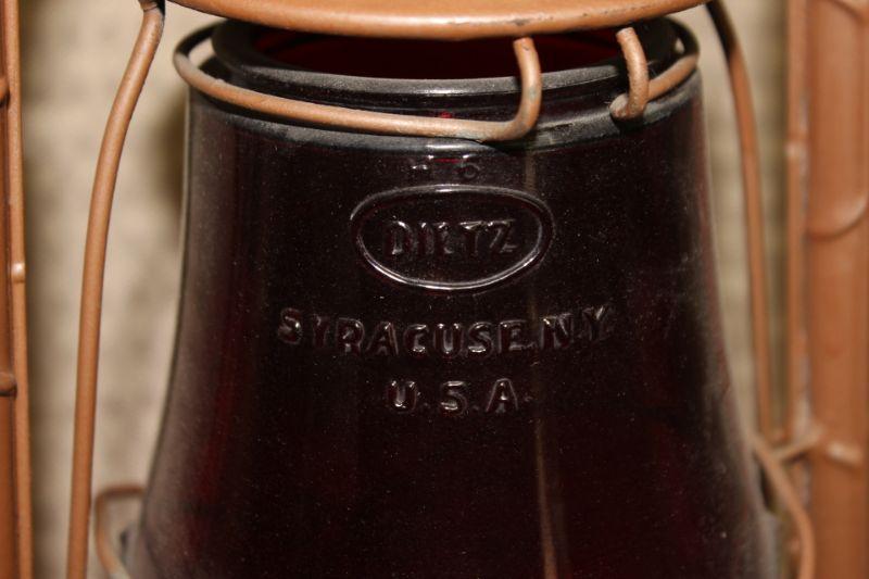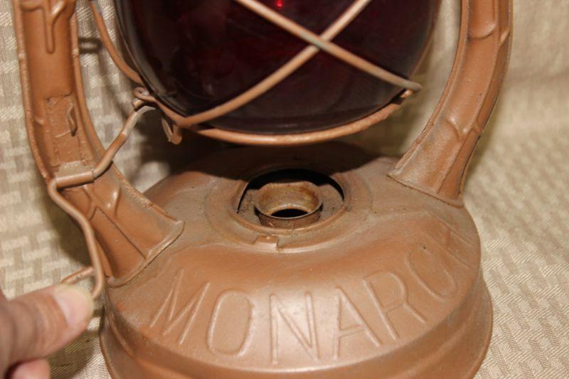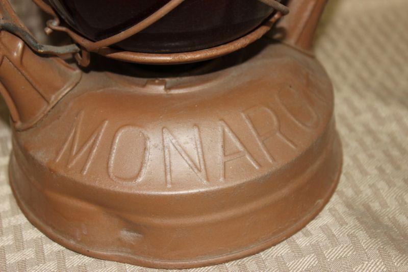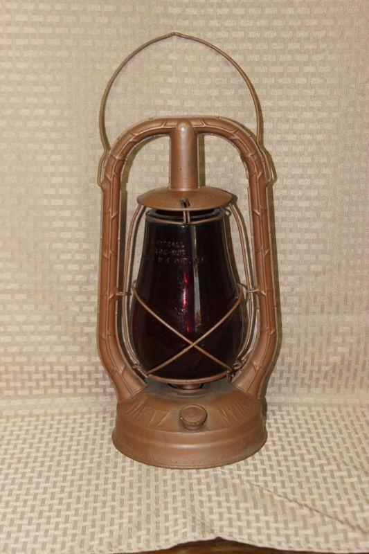 Vintage Dietz "Monarch" Oil/ Kerosene Lantern. Red Fitzall globe. Gold painted metal. Some rust noticeable inside fuel tank. Good Condition. Some minor dents & scratches.