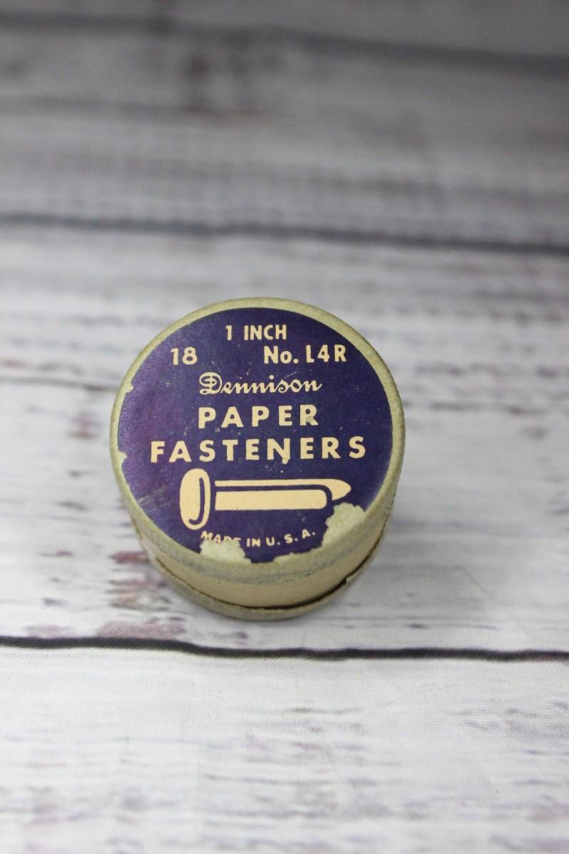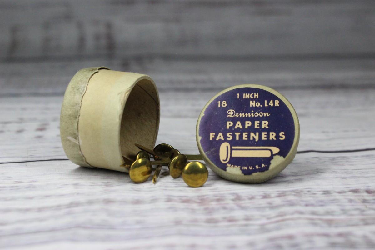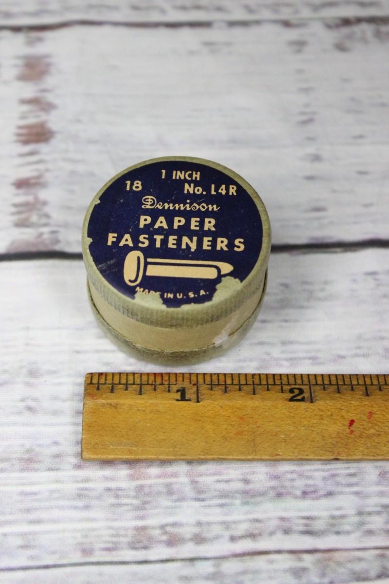 Vintage paper fasteners with original box from Dimension. The box measures to around 1.5" and there is some natural ware.