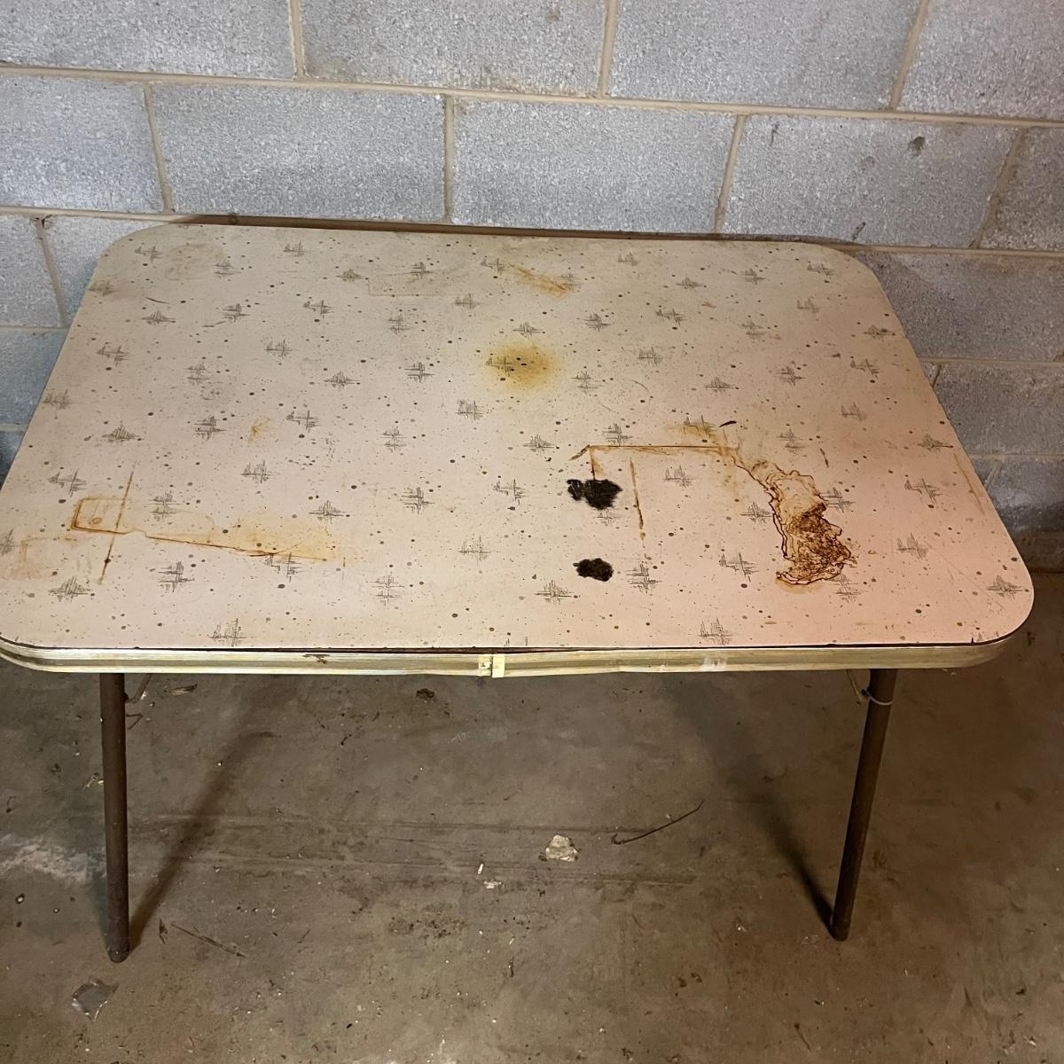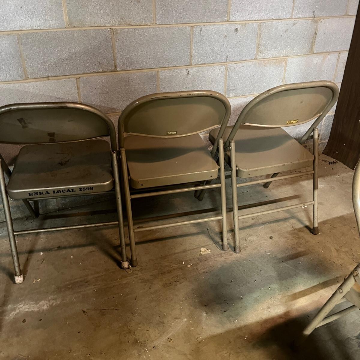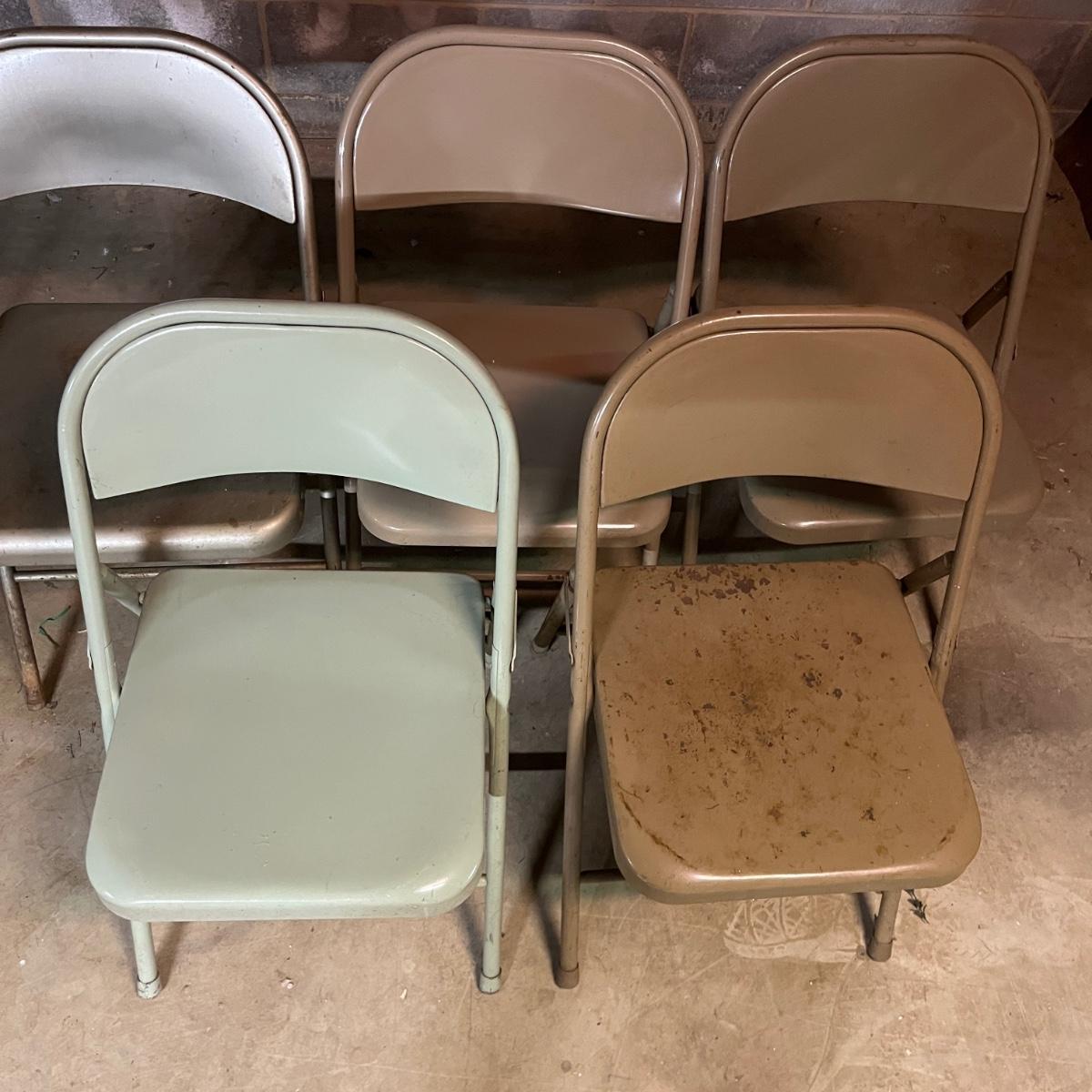 Lot includes five folding metal chairs and a vintage Veneer top table with metal base. Table measures 30” x 42” x 29.5”H. Table has stains and chairs have some rust, see pictures. Three of the chairs have a 'Krueger' label.