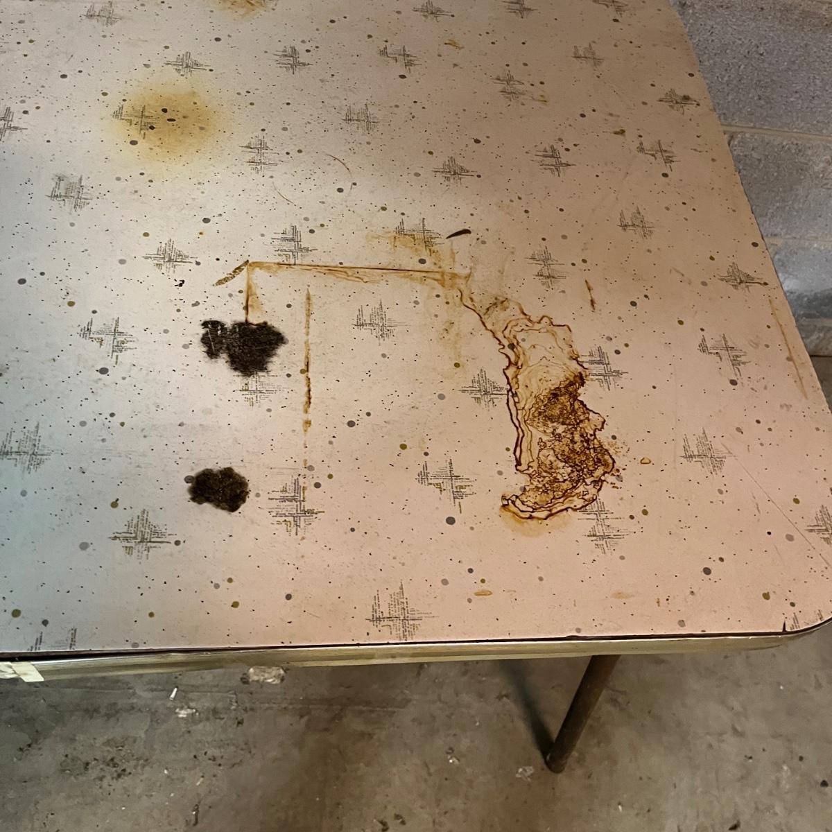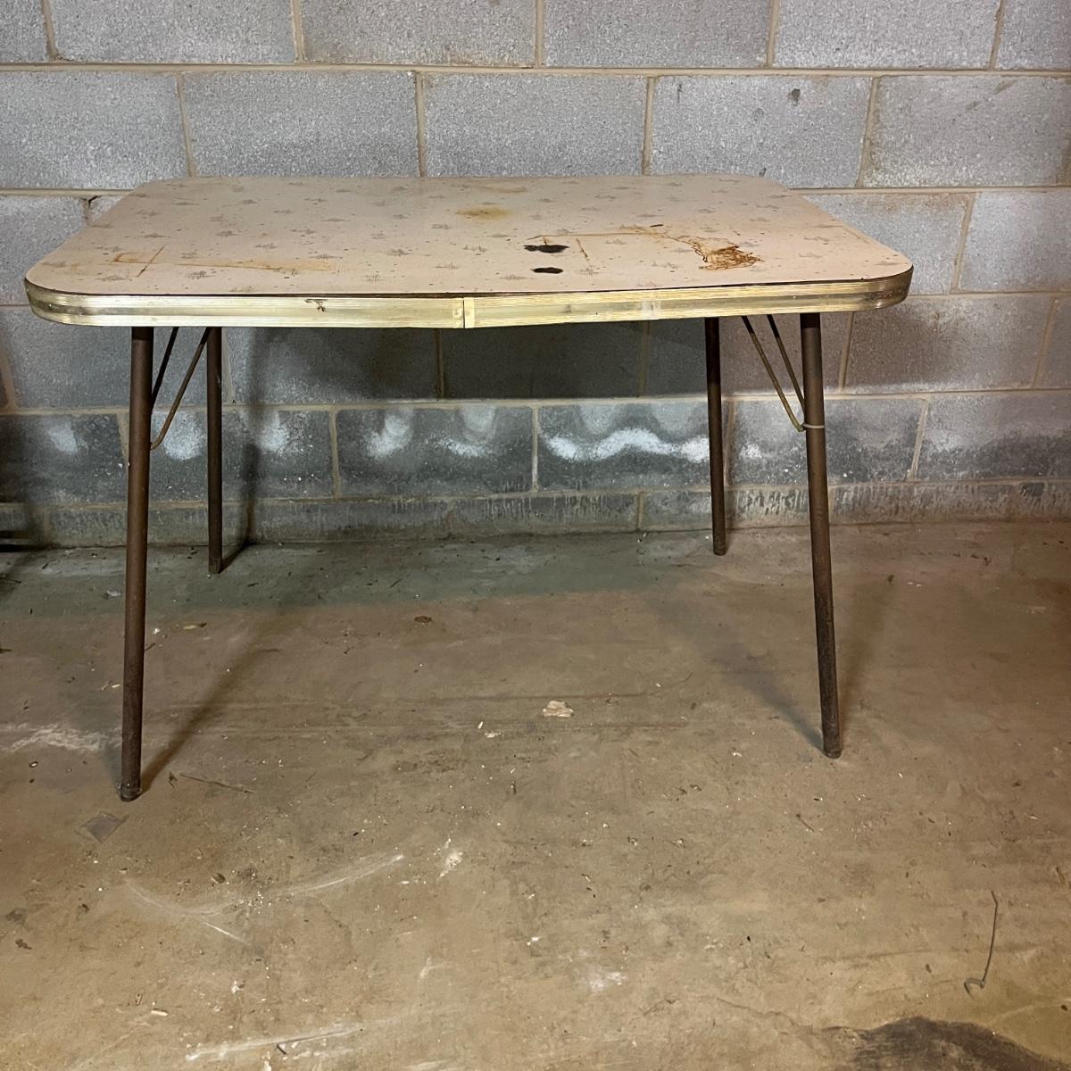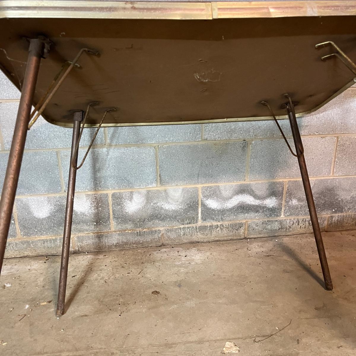 Lot includes five folding metal chairs and a vintage Veneer top table with metal base. Table measures 30” x 42” x 29.5”H. Table has stains and chairs have some rust, see pictures. Three of the chairs have a 'Krueger' label.