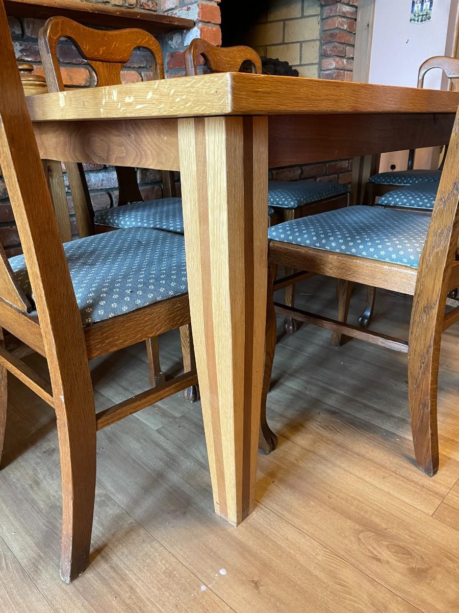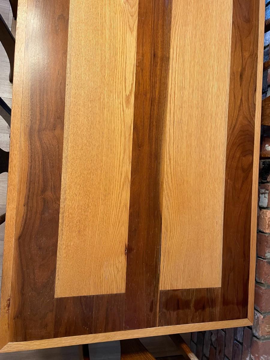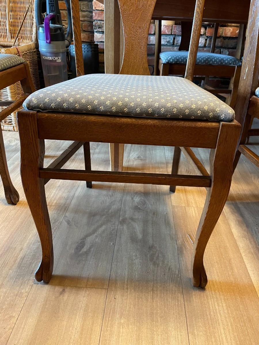 The beautifully kept table is made using multiple types of wood. The table includes six upholstered chairs that appear to be tiger oak so not an exact match to the table. Table 74L x 35W x 29h. Chairs: 19 1/2”L x 17w x 37 1/2H .