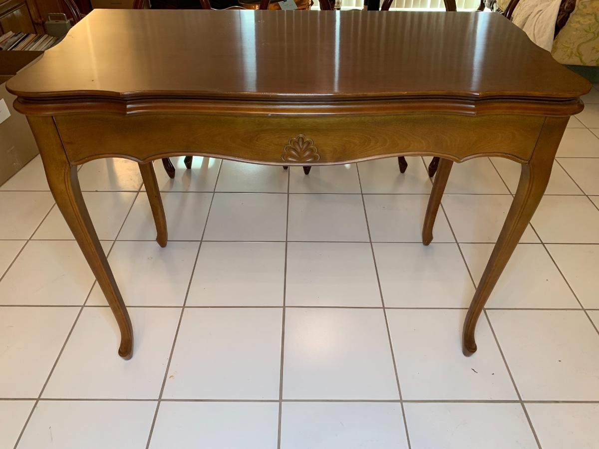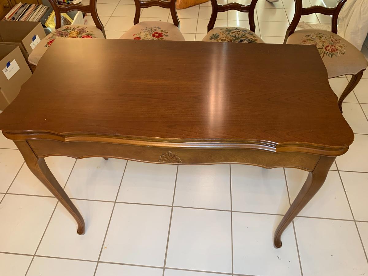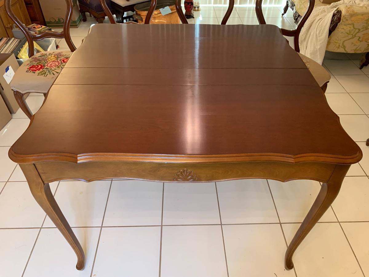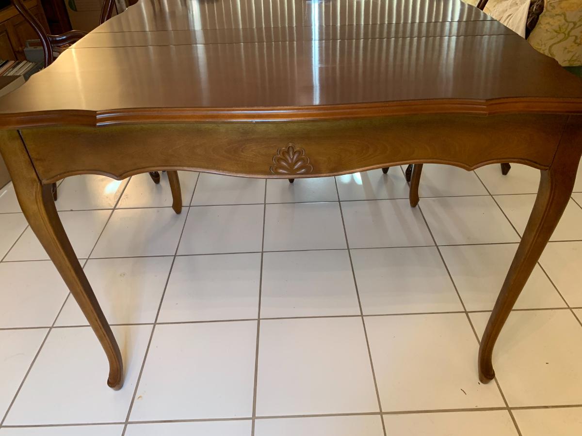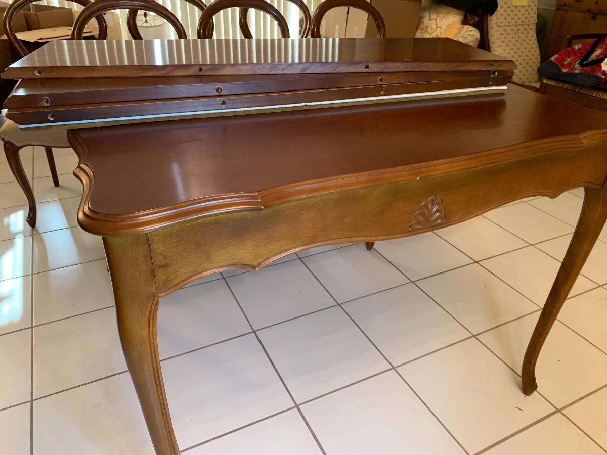 Vintage wood dining table with 6 chairs, 3 leaves and table top protector padding. Can be used in most compact size as a desk and then opened and expanded as far as you need to seat up to 6 people.