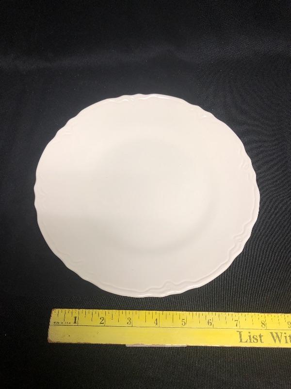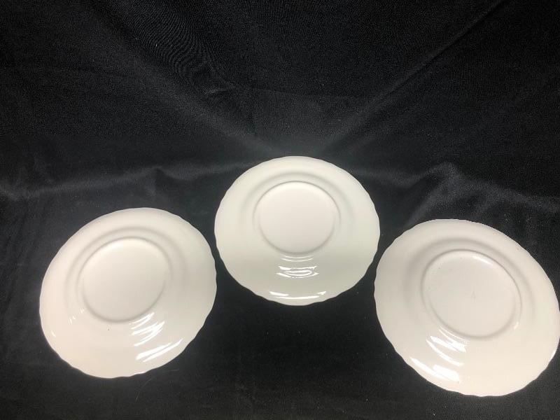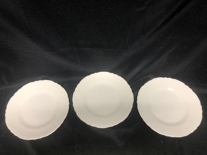 3 vintage dinner plates. White, slight scallop to the edge. Unmarked.