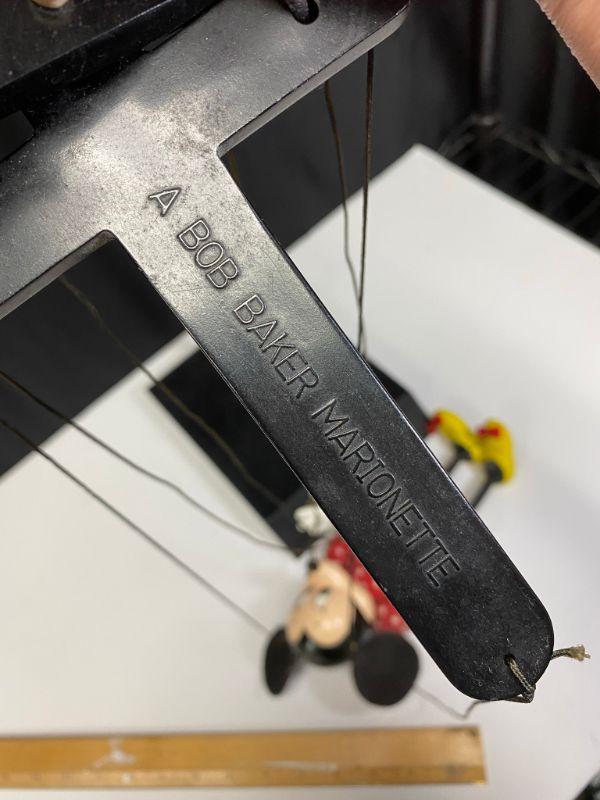 Vintage Disney Bob Baker marionette Minnie Mouse. Comes with her display stand. Limited edition #0686. Great collector item, but needs a little TLC. She has been on display and is dusty/webby. Her strings look a little faded. She is missing the bow from the top of her head, you can see glue where it once was. Limbs are a rubber tubing, the left arm is cracked and barely holding together. Without the strings she is about 9" size.