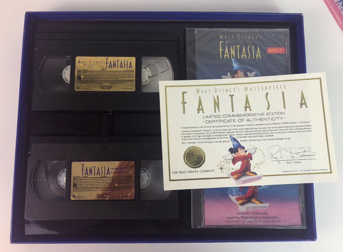 Here is a Deluxe Collector's Edition of Walt Disney's FANTASIA...Includes fully-restored video with Special Hologram Insignia..A Certificate of Authenticity...2 Compact Discs of the original soundtrack...Full color, 16-page Commemorative Booklet....Sealed components...Some slight wear on cover from storage...Final release...VHS...1991...