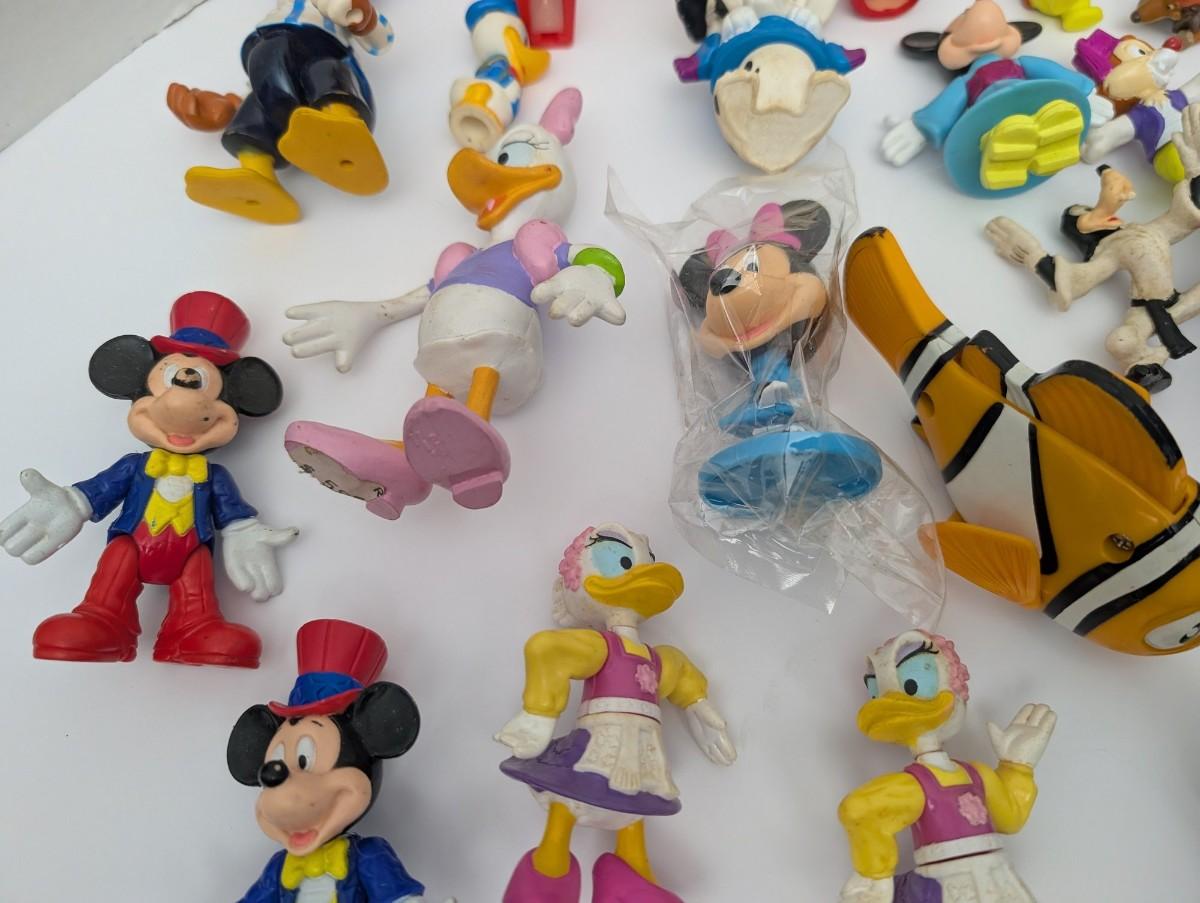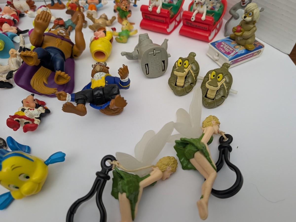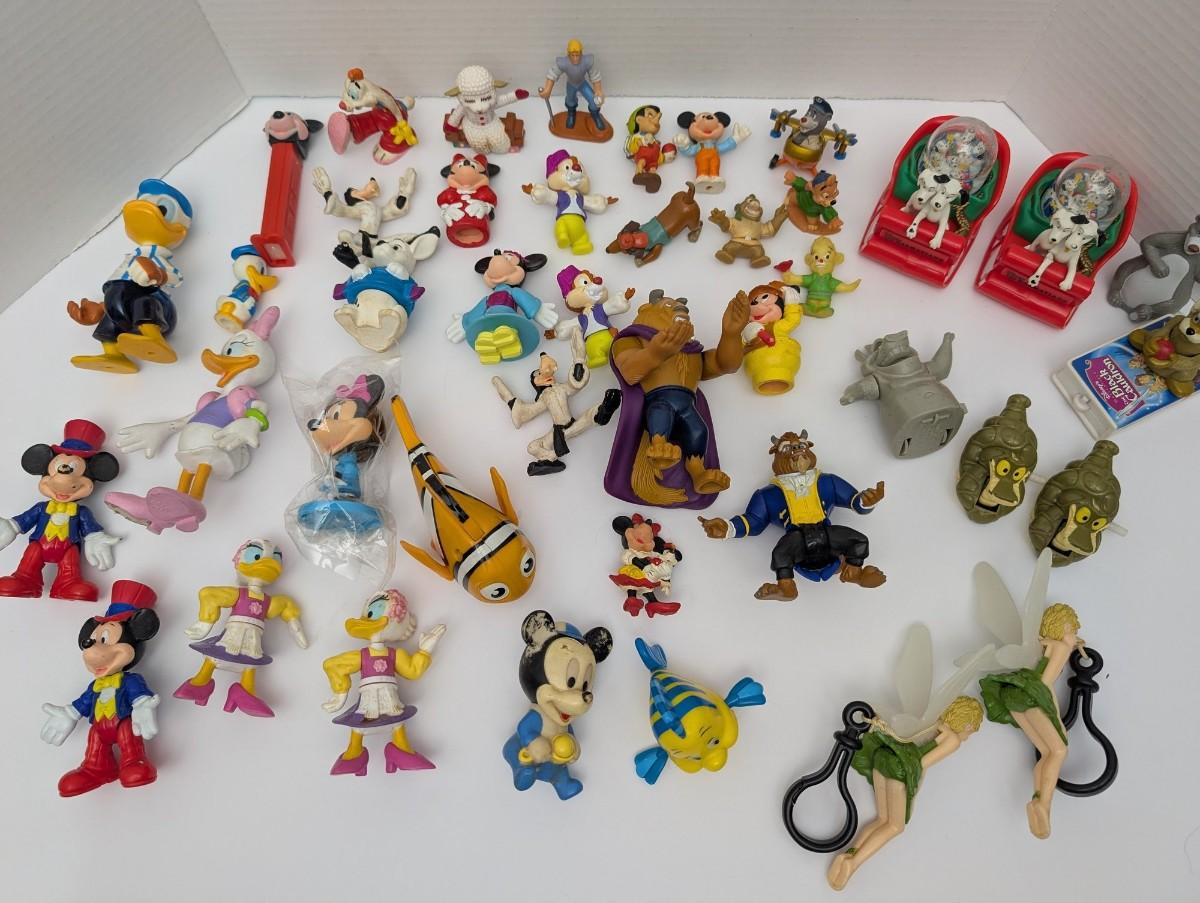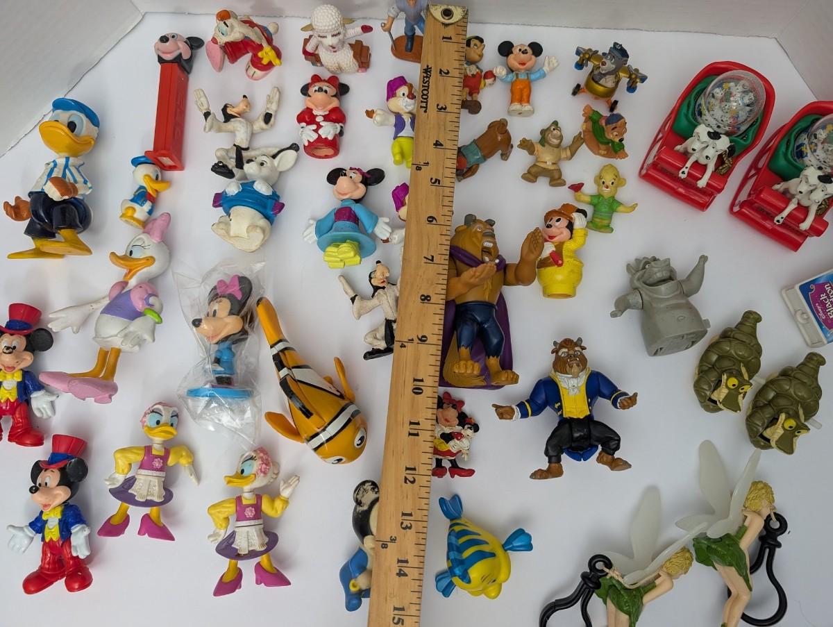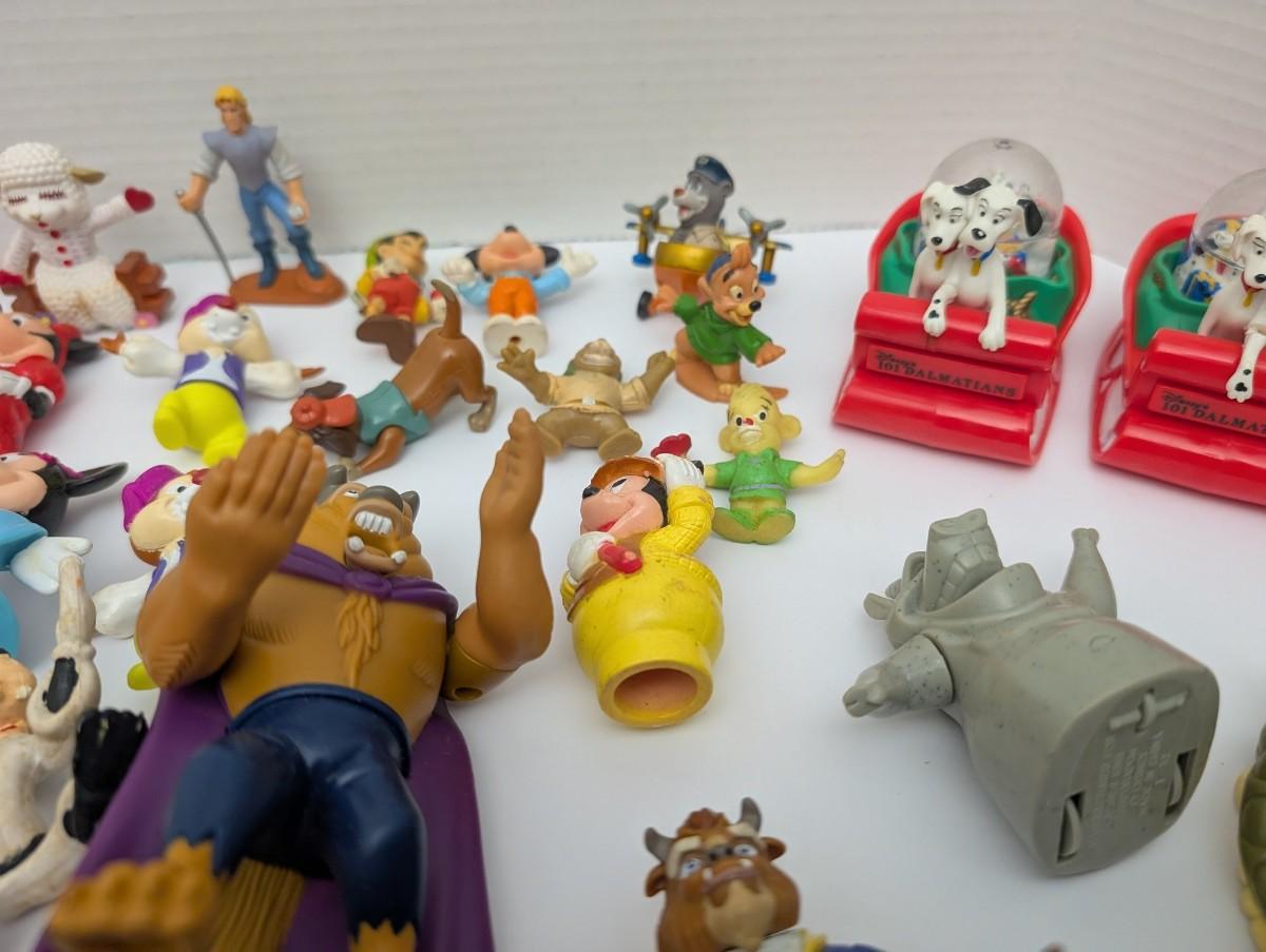 Step into a world of magic with this fun lot of over 40 Disney character figures! Perfect for collectors, these toys are full of nostalgic charm. You'll find beloved classics like Mickey and Minnie Mouse, Donald and Daisy Duck, and Pluto. The collection also includes a villainous Maleficent from Sleeping Beauty, the Beast from Beauty and the Beast, Ariel and Flounder from The Little Mermaid, and Nemo. Get a double dose of fun with two different versions of Tinkerbell and two classic cars with 101 Dalmatians! Many of these are vintage McDonald's and Burger King Happy Meal toys, with some having moveable parts. A great piece of pop culture history!