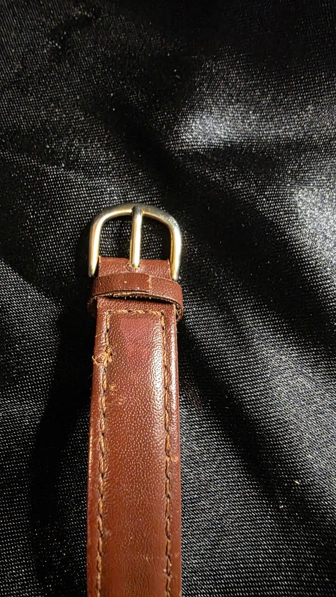 The gold-tone case has softened with time, its gentle patina lending character to the piece, echoing years of smiles it may have sparked. The brown leather strap, worn in all the right ways, feels like a treasured companion — the kind of watch a young fan might have worn proudly everywhere, or a collector might now display with nostalgia. Even the tiny floral accent on the strap adds a whimsical touch, like a memory stitched into the leather.