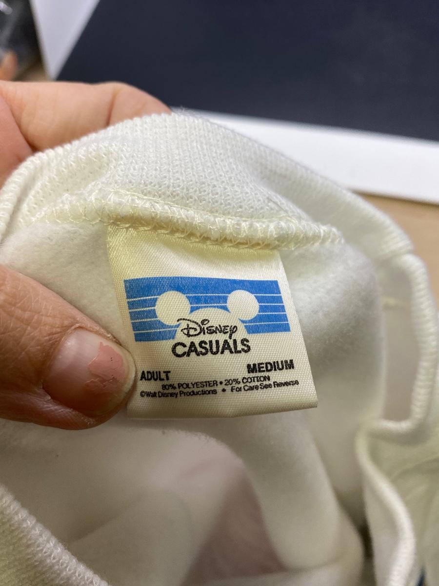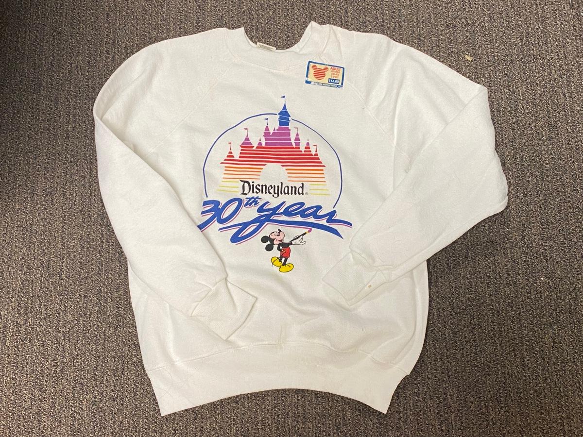 Never worn Disneyland 30th Anniversary sweatshirt. White long sleeve sweatshirt with rainbow castle design. Still has the sticker tag attached. Size medium. Never worn or washed, in pretty good condition. There is some discolor spots, from storage, may come clean when actually washed. Fleece inside super soft.