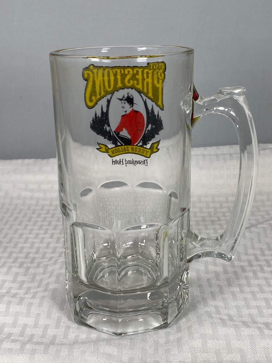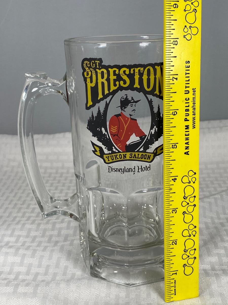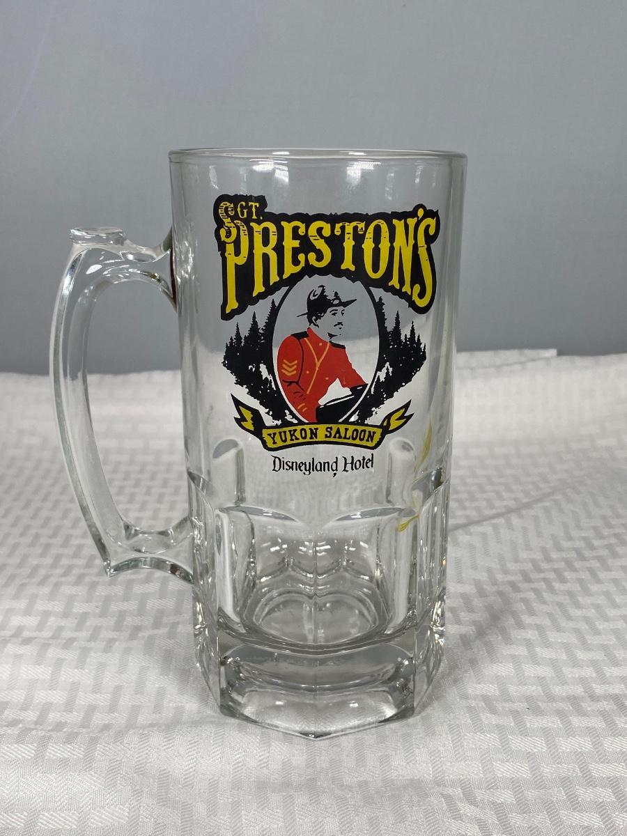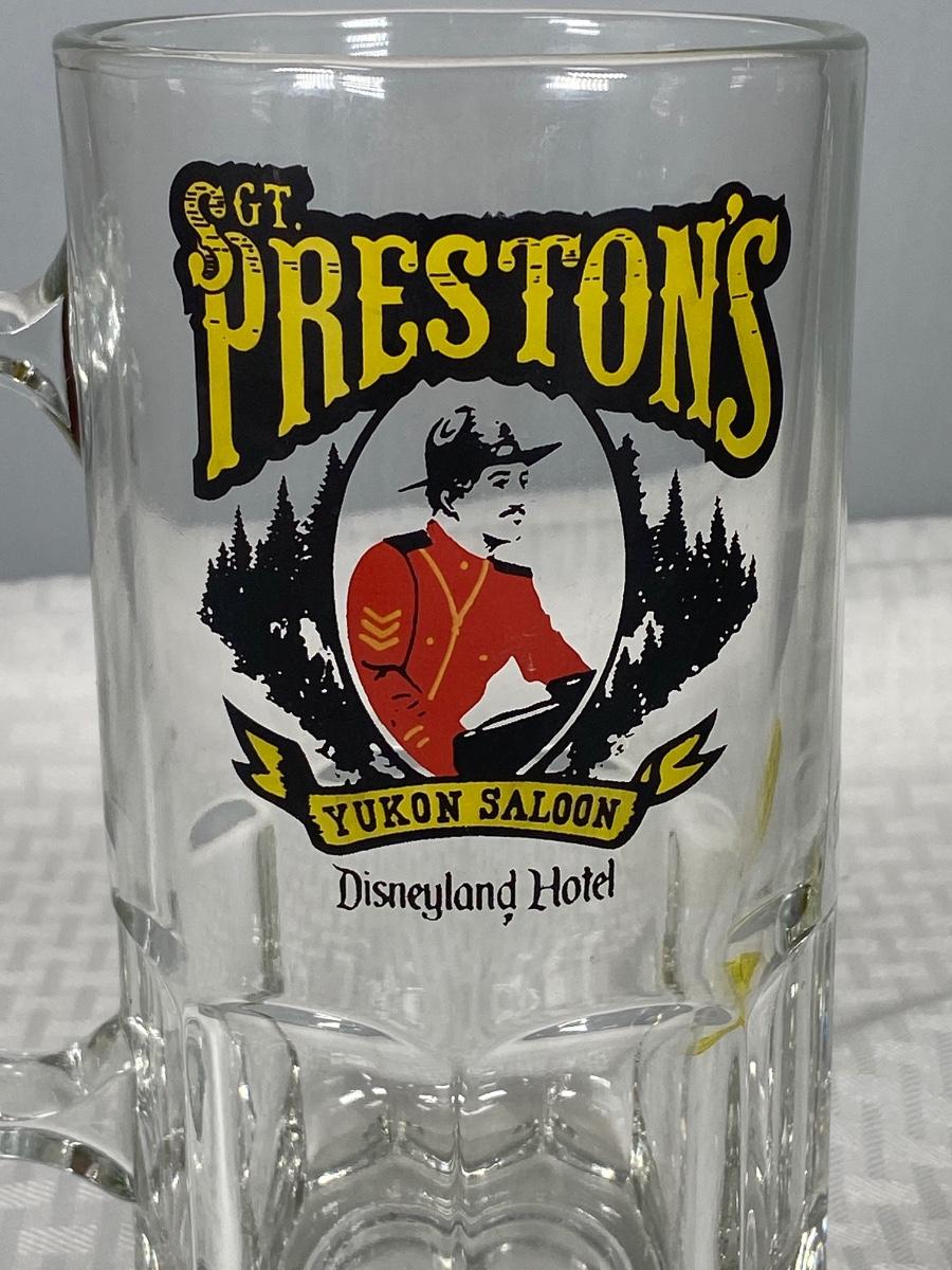 Vintage Disneyland Hotel Sgt. Preston's Yukon Saloon Restaurant Large Glass Stein. Restaurant is no longer at the hotel. In good condition, no chips, good graphics. Thick heavy glass about 8" size.