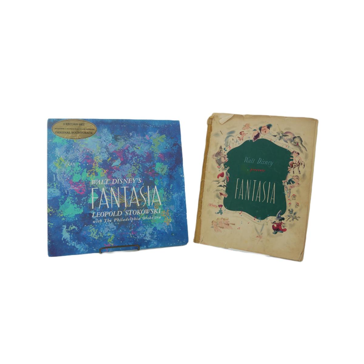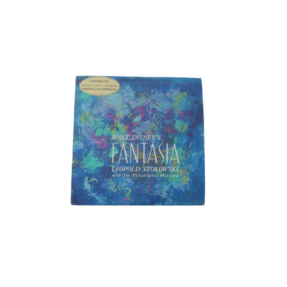 Vintage 1957 Walt Disney's "Fantasia" three piece vinyl record set with illustrated progrma book inside. Music by Leopold Stokowski with the Philadelphia Orchestra. In excellent condition! Sleeves are originally blank and one has been replaced as it was missing. Corners have some wear, but overall great condition for its age. Album measures 12.5" x 12.5". Included is a 1940 "Fantasia" book with information and illustrations of the movie and music. It is in fair condition, but still intact. Book measures 9.5" x 12.5". Lot weighs 3 lbs. (M42)