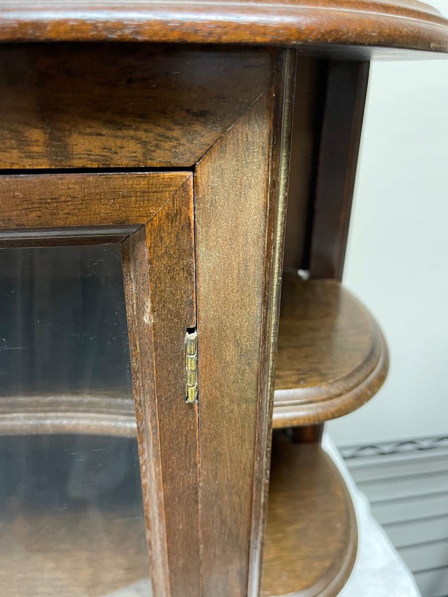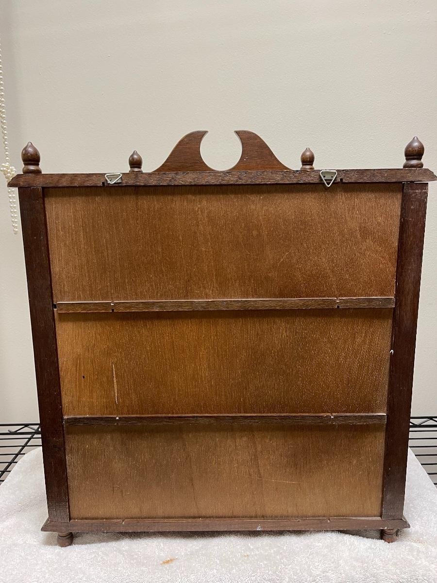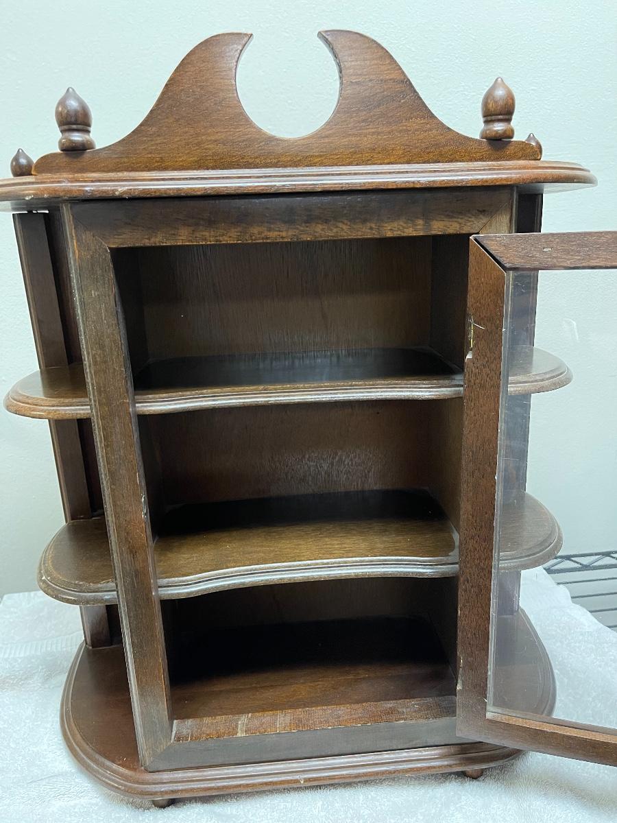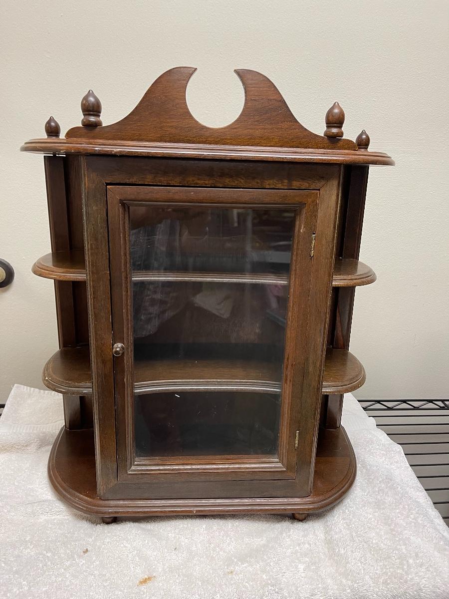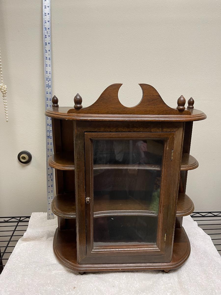 Vintage display cabinet, 3 level wood shelf with  and glass,