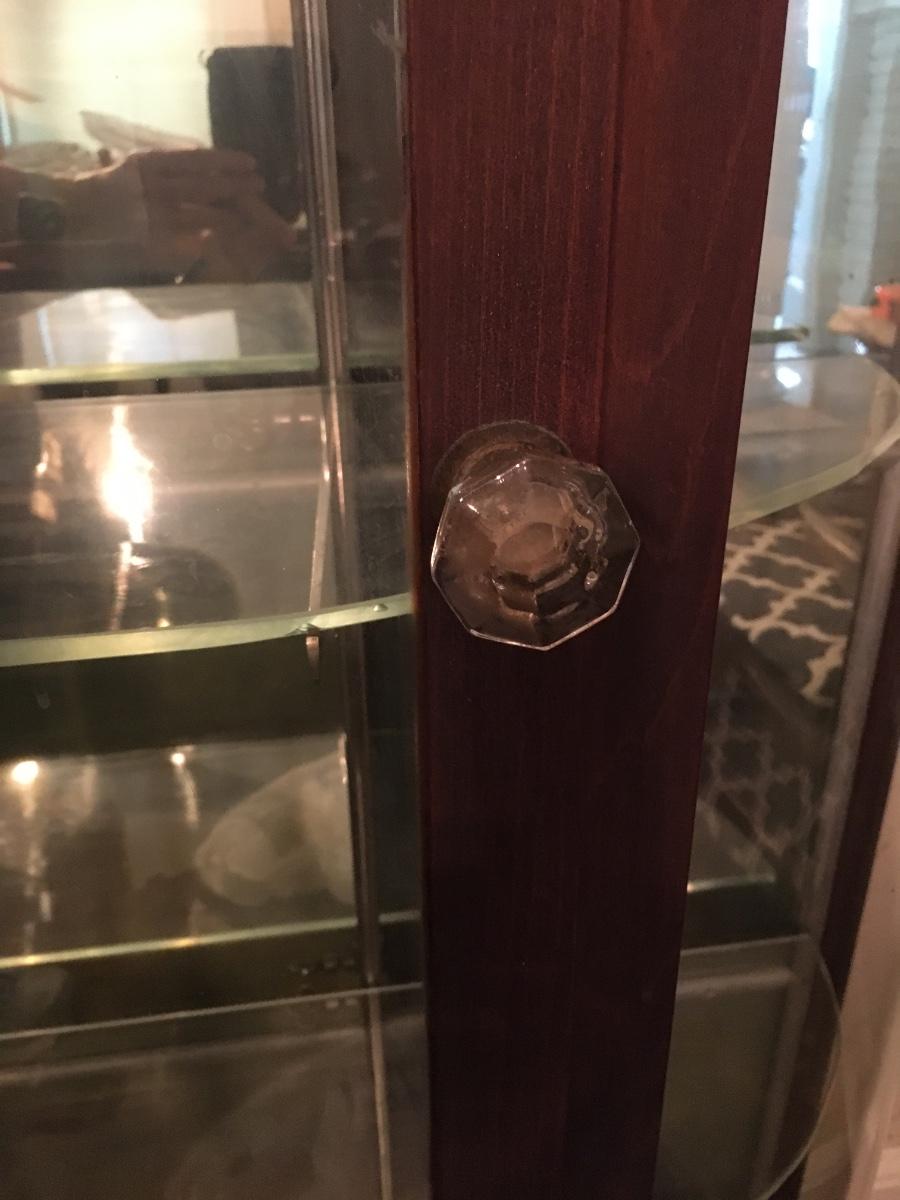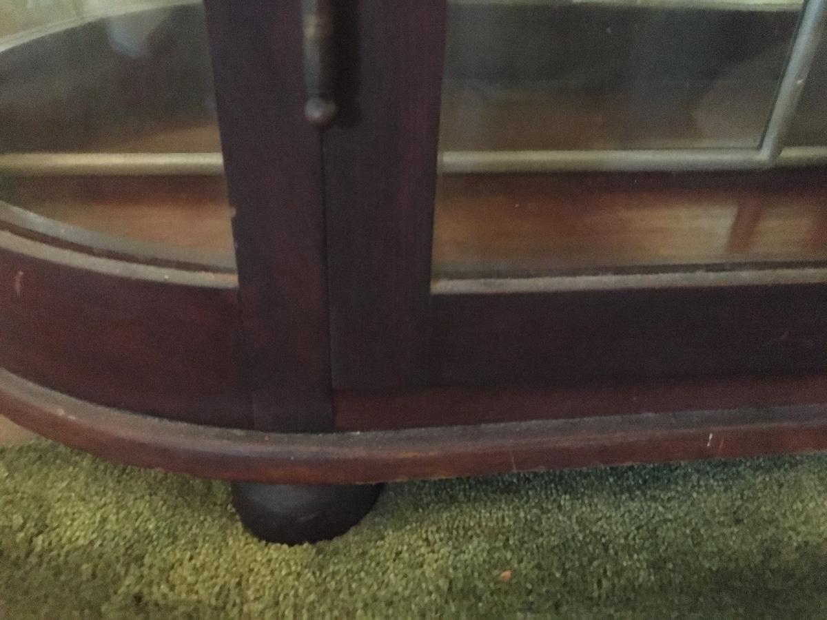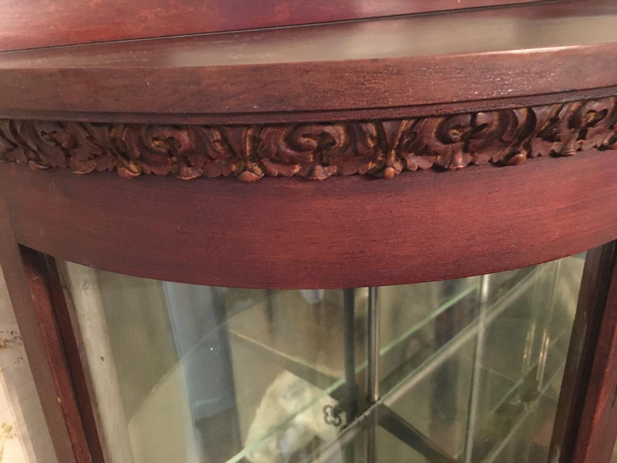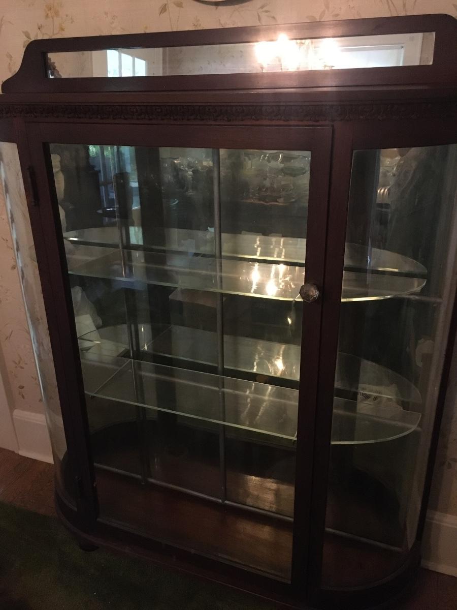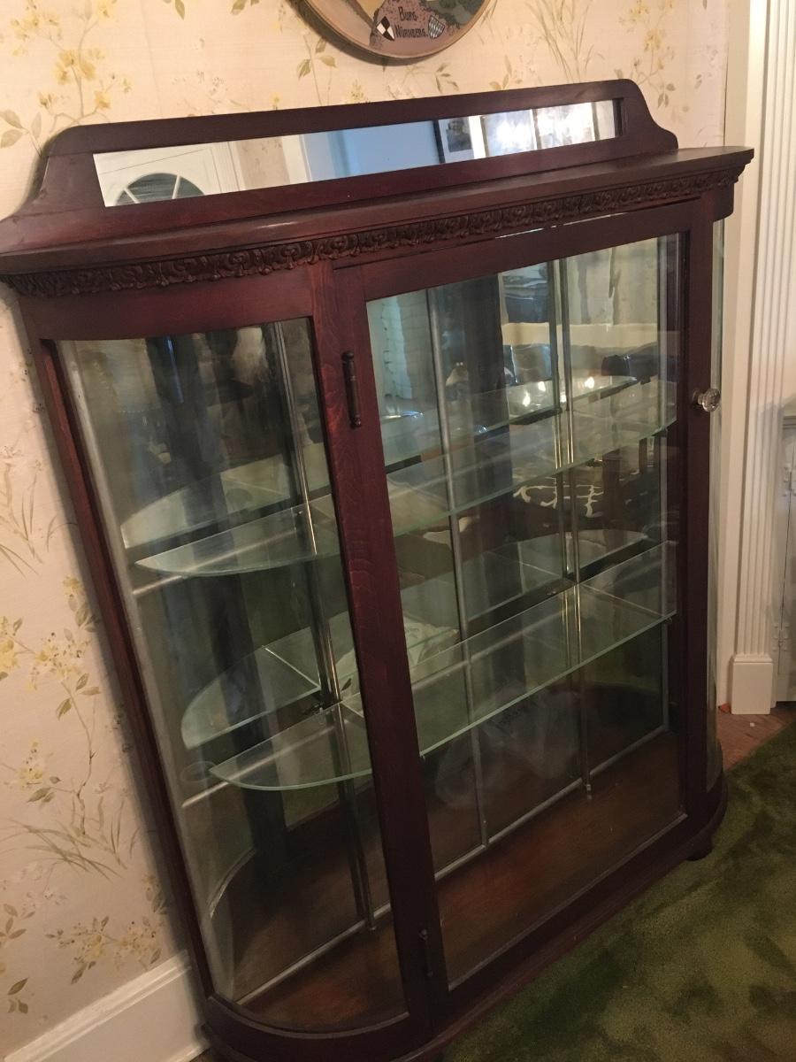 Mahogany cabinet with mirrored background and horizontal panel on top. Glass knob on door as well as glass shelves. Measurements 48 W 57 H 13D