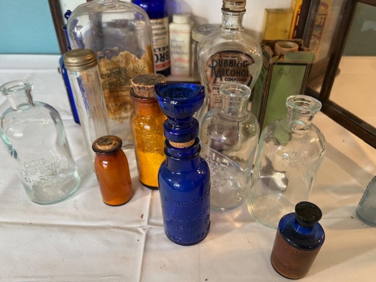 Includes cabinet with 30+ old medicine bottles. Measurement of cabinet: 25.5"H x 25"W.