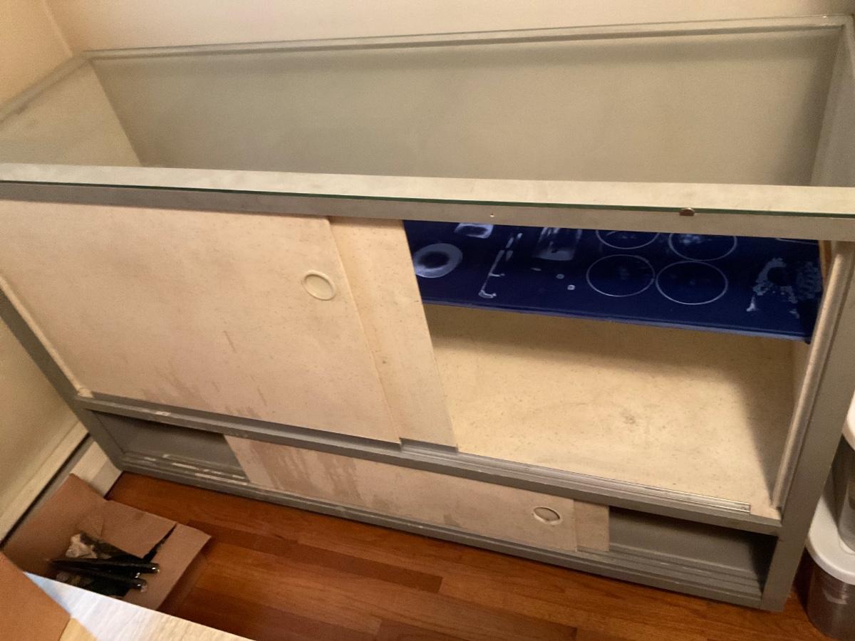 Vintage display case with blue velvet shelf