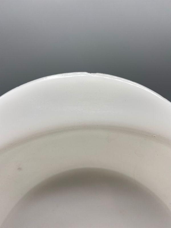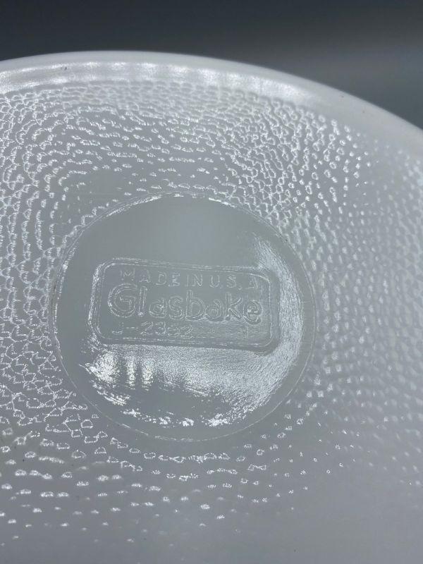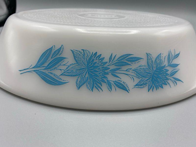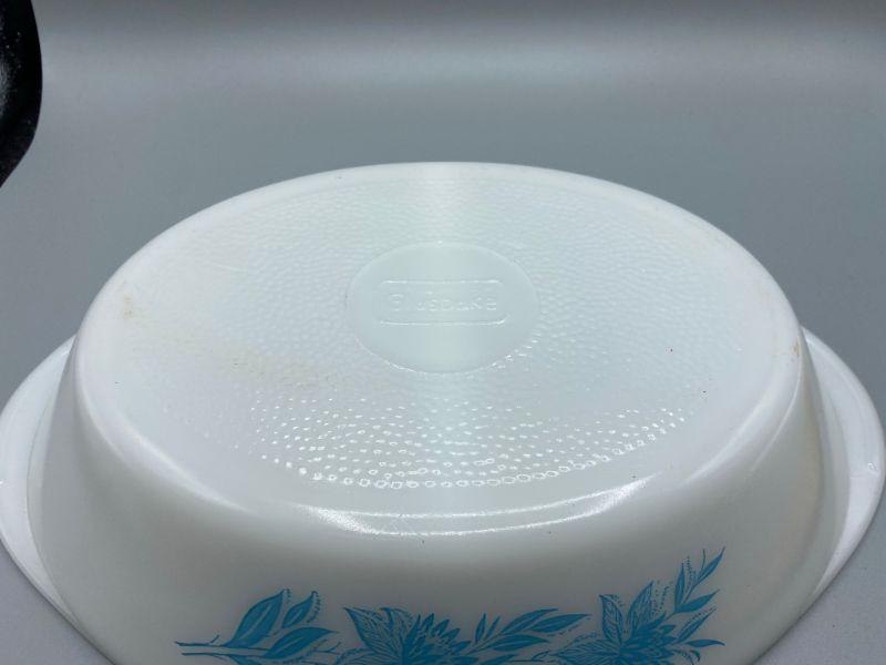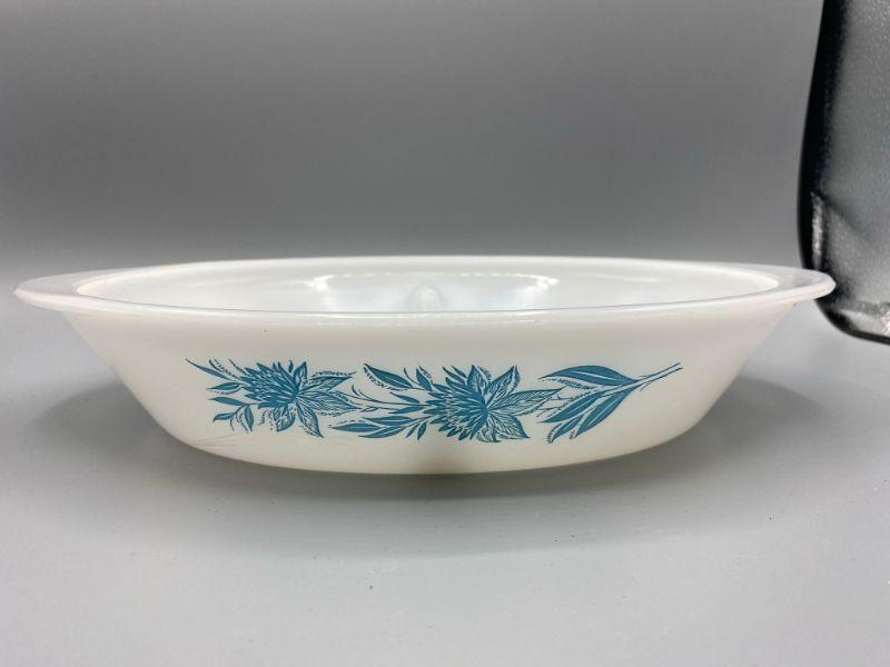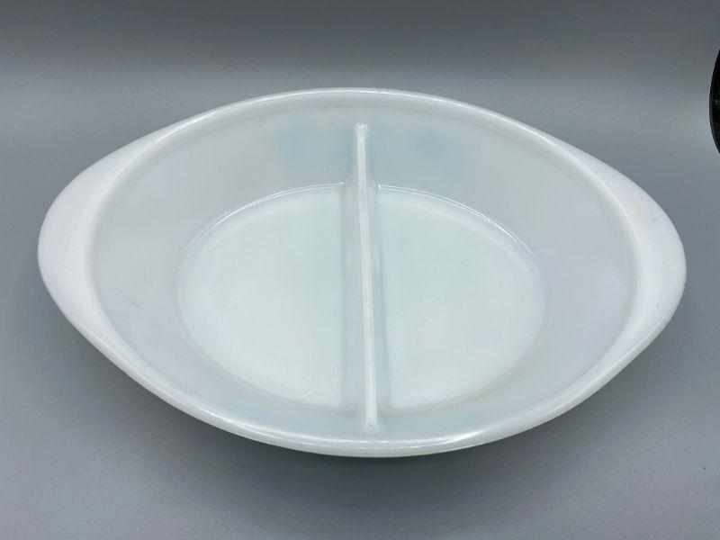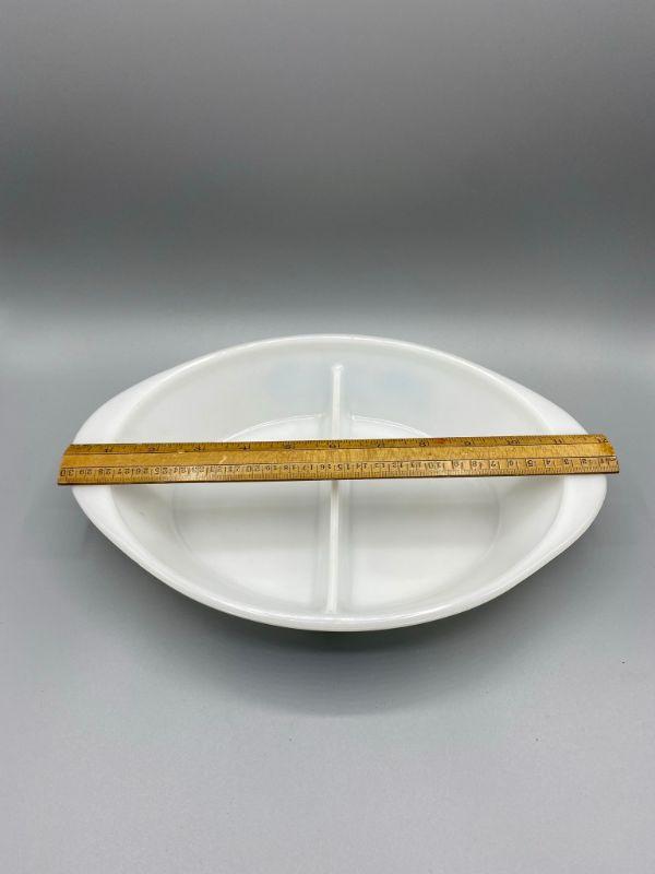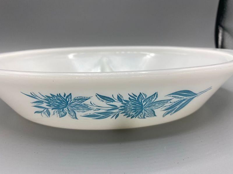 Vintage divided casserole dish by GlasBake. White with a blue flower pattern. There is a very small chip on one of the handles.