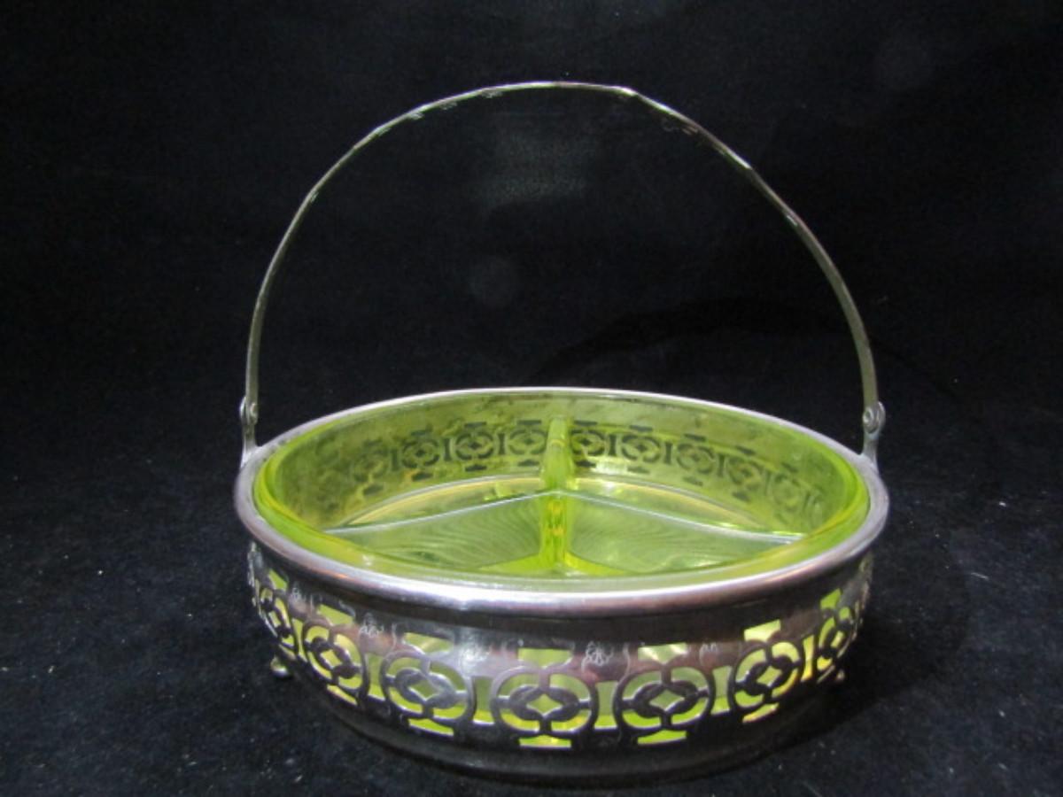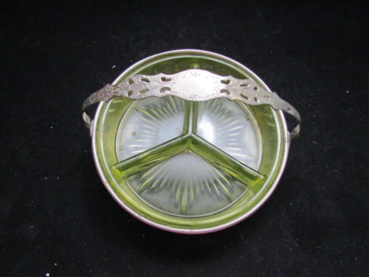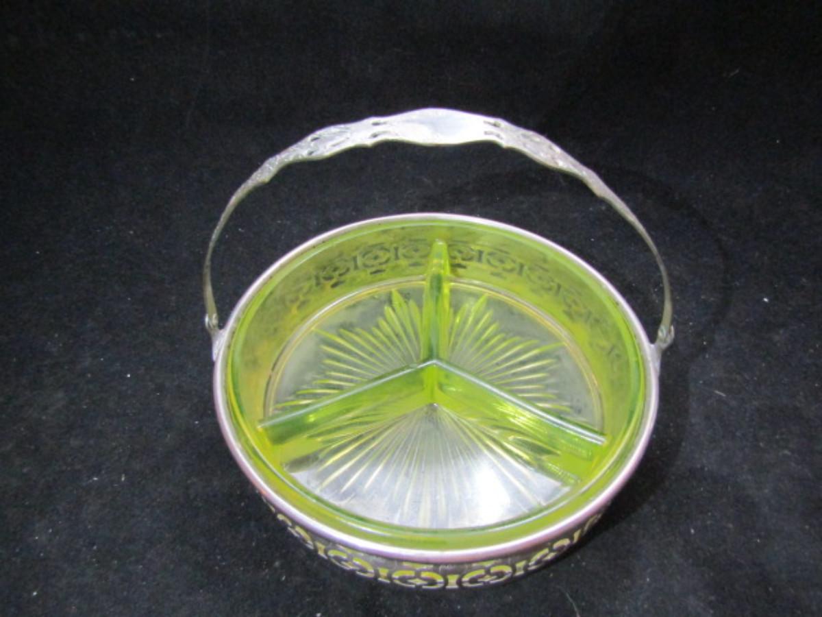Vintage Divided Dish- Uranium Glass with Metal Holder (#388)
