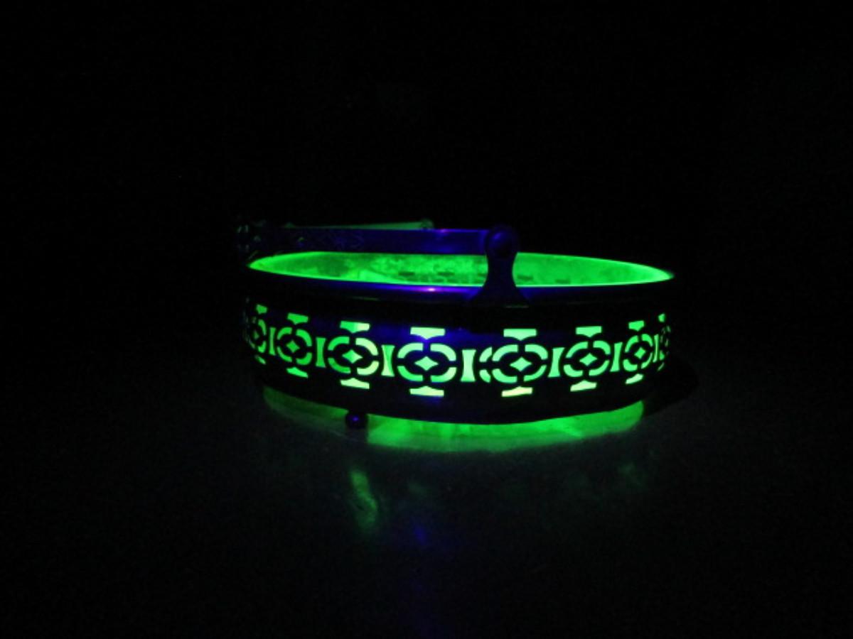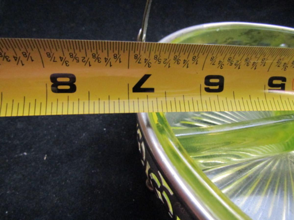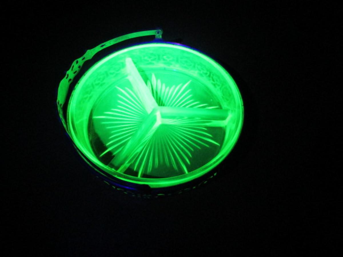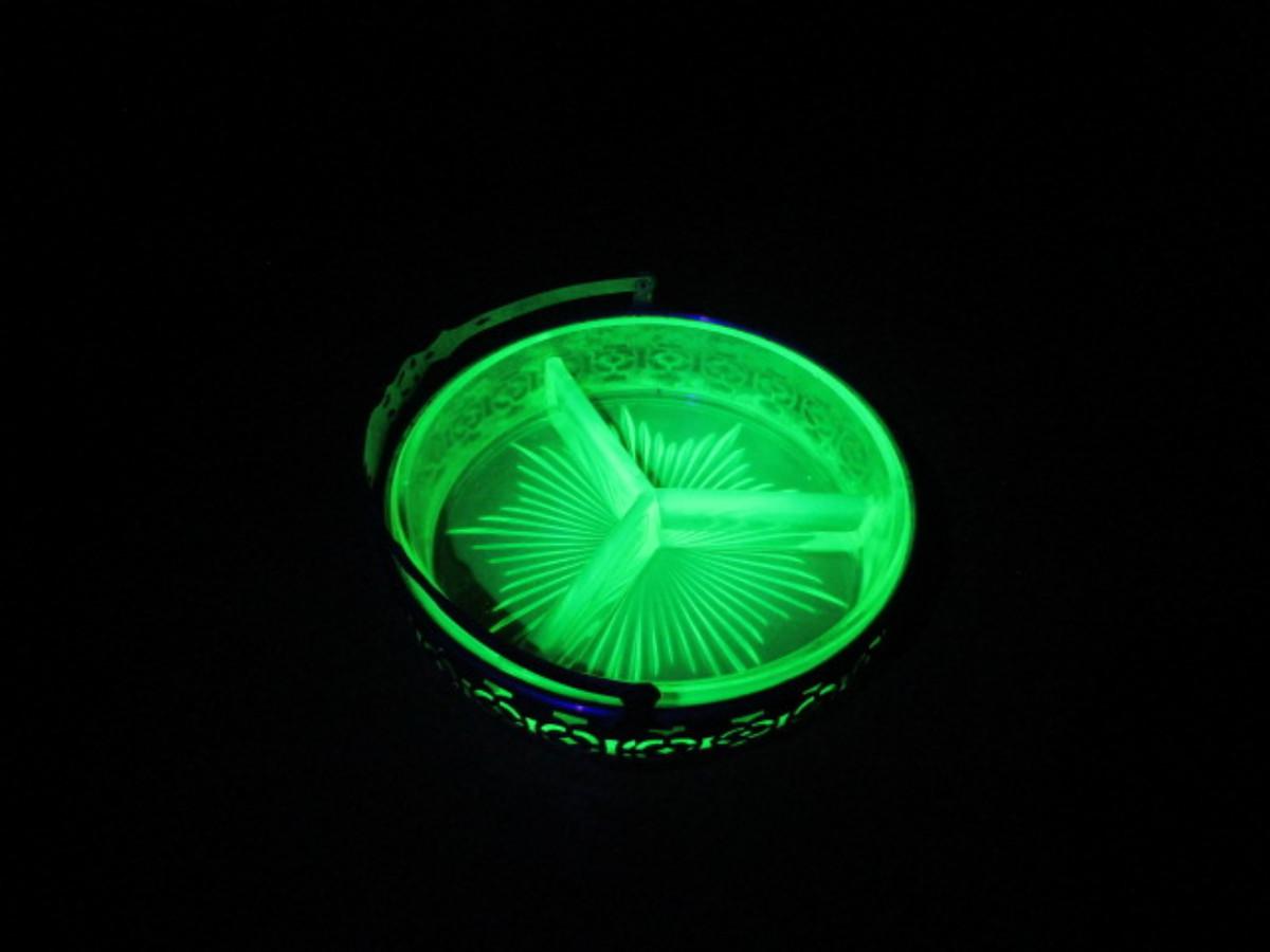 Vintage Divided Dish- Uranium Glass with Metal Holder (#388)