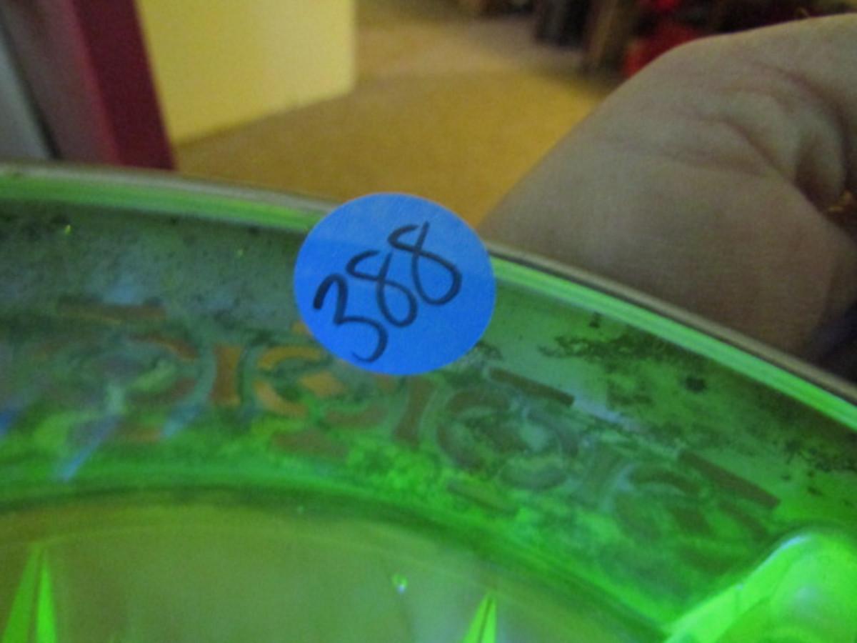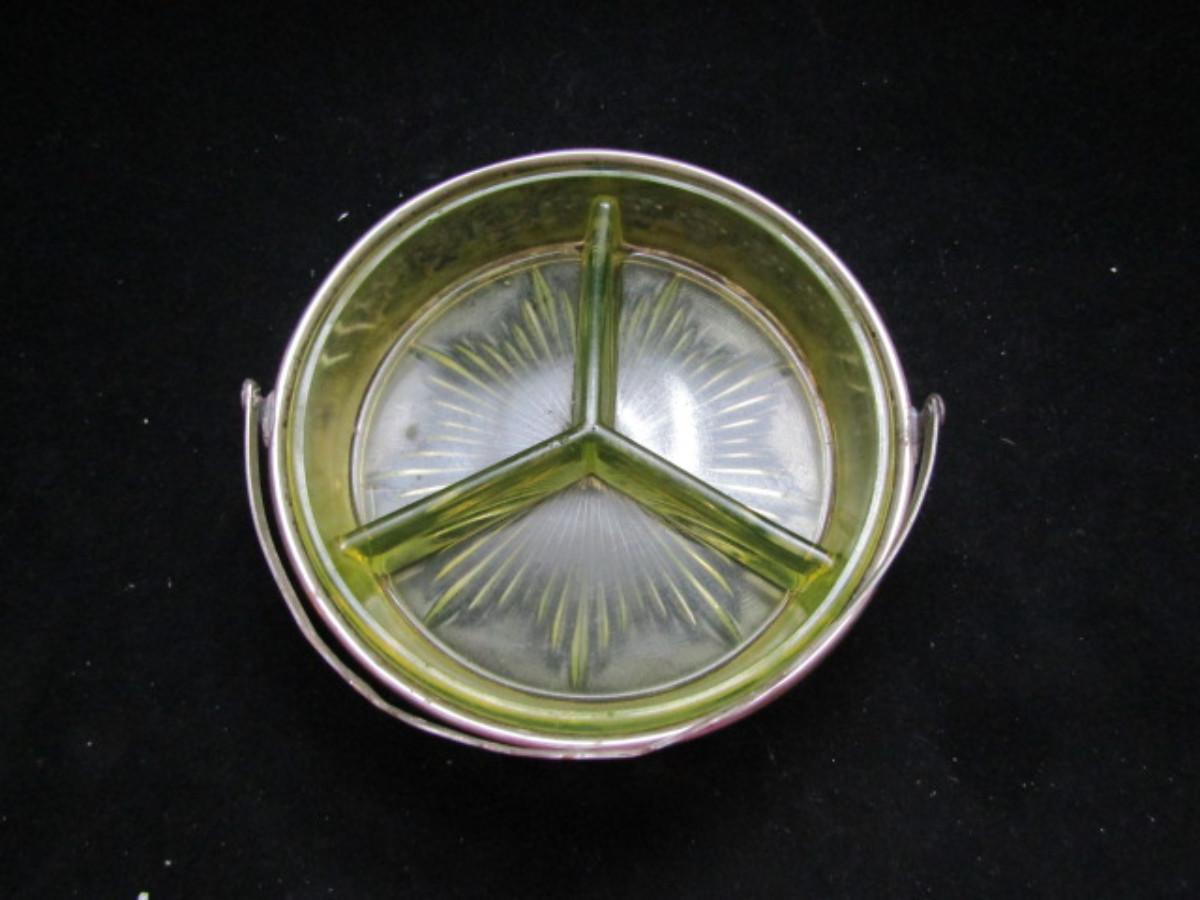 Vintage Divided Dish- Uranium Glass with Metal Holder  (#388)