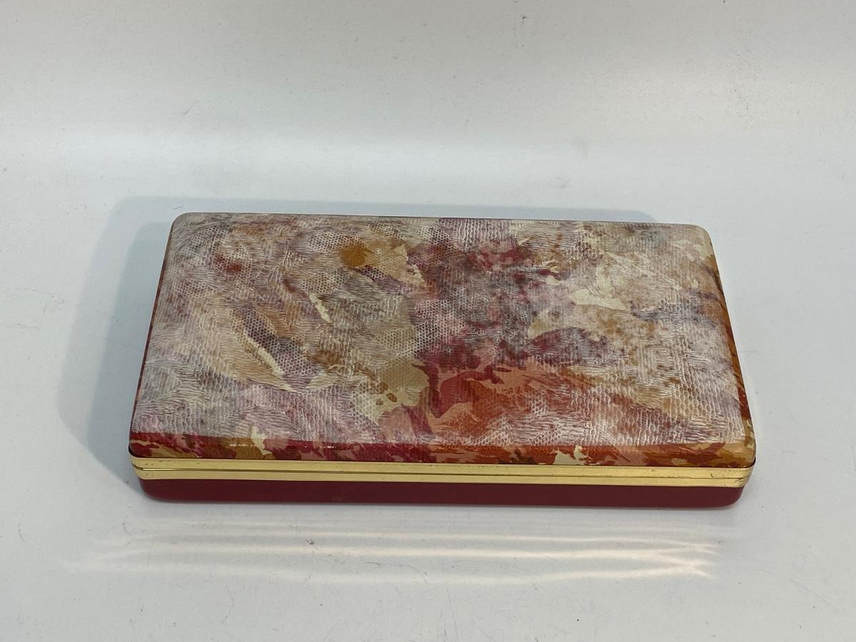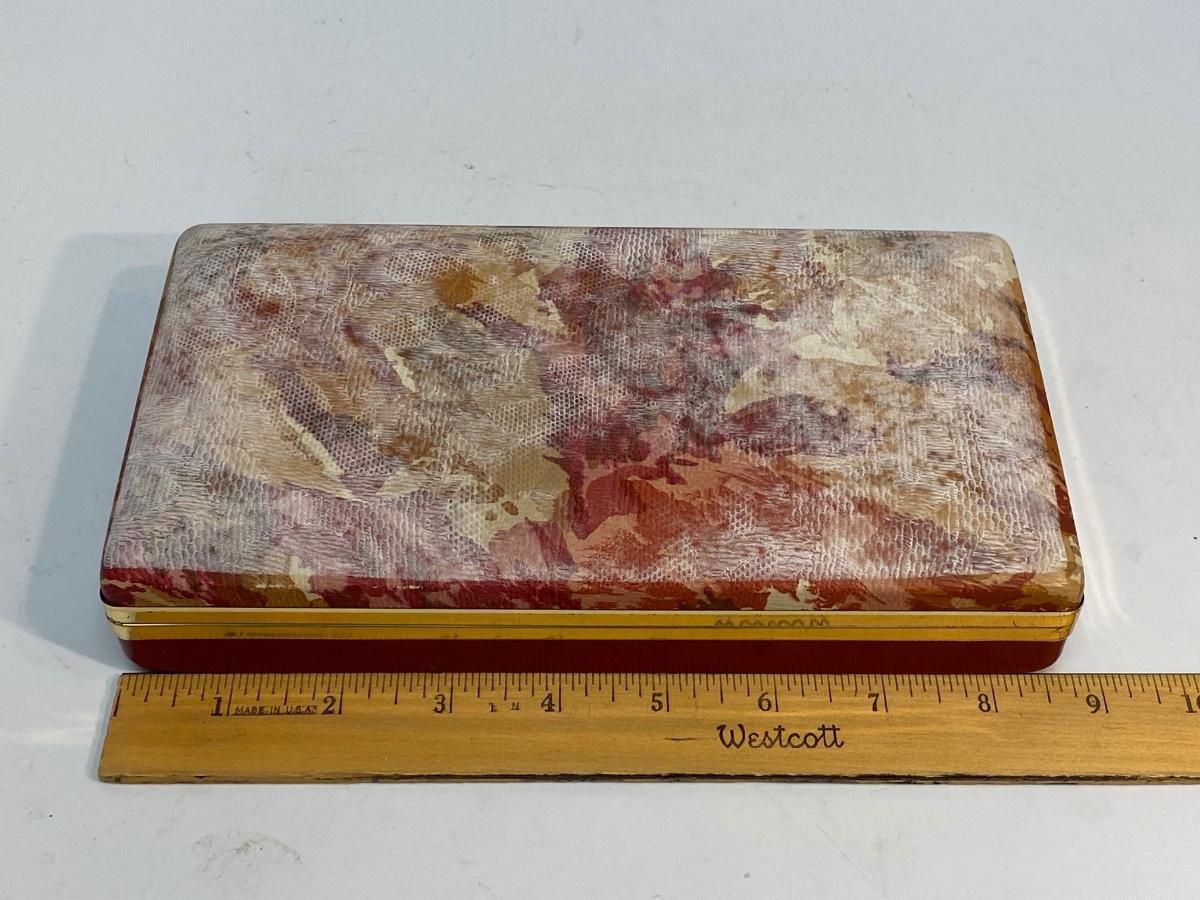 Vintage Divided Small Jewelry Box. Inside is in good vintage condition. The outside has a white film on the cover, not sure how clean it might come. Small size, good for hiding in the bottom of a drawer.