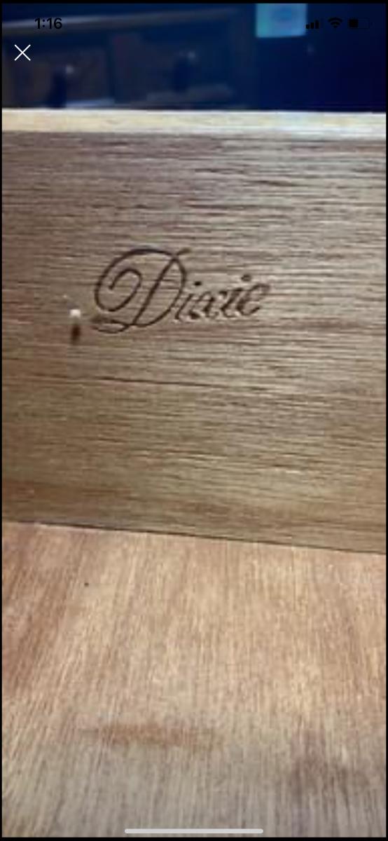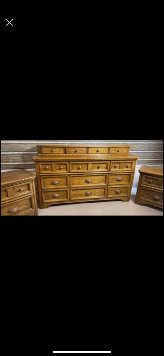 Vintage Dixie Furniture Oak Step Back Dresser with Matching Nightstands With Carved Wood Pulls