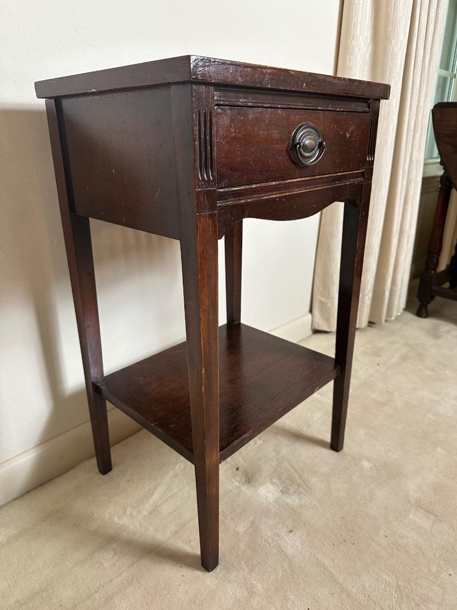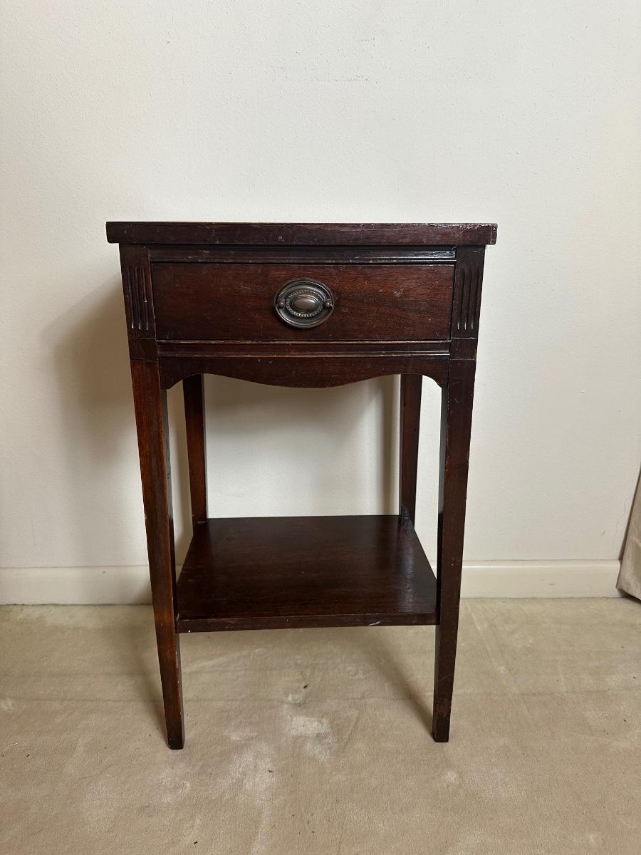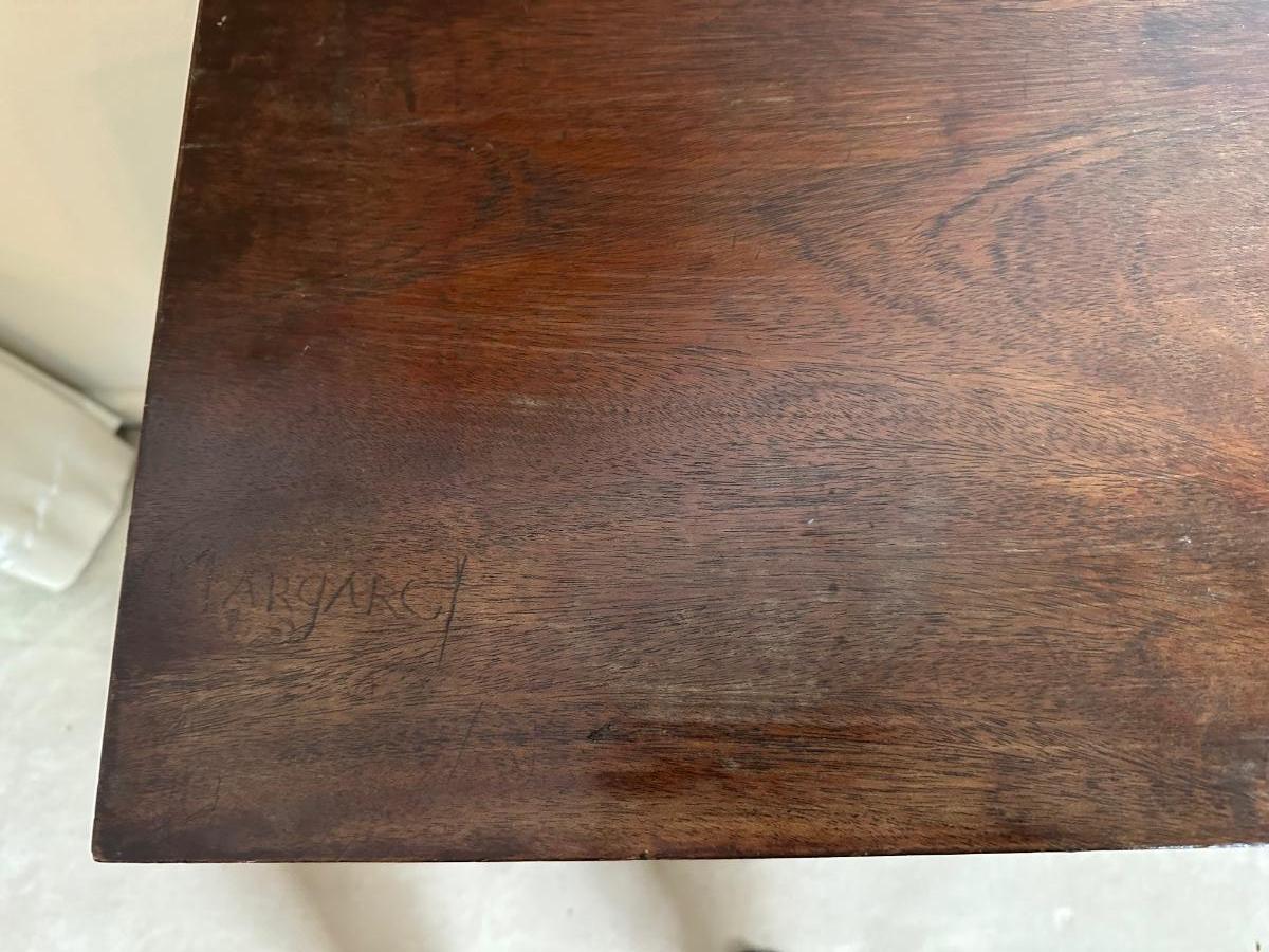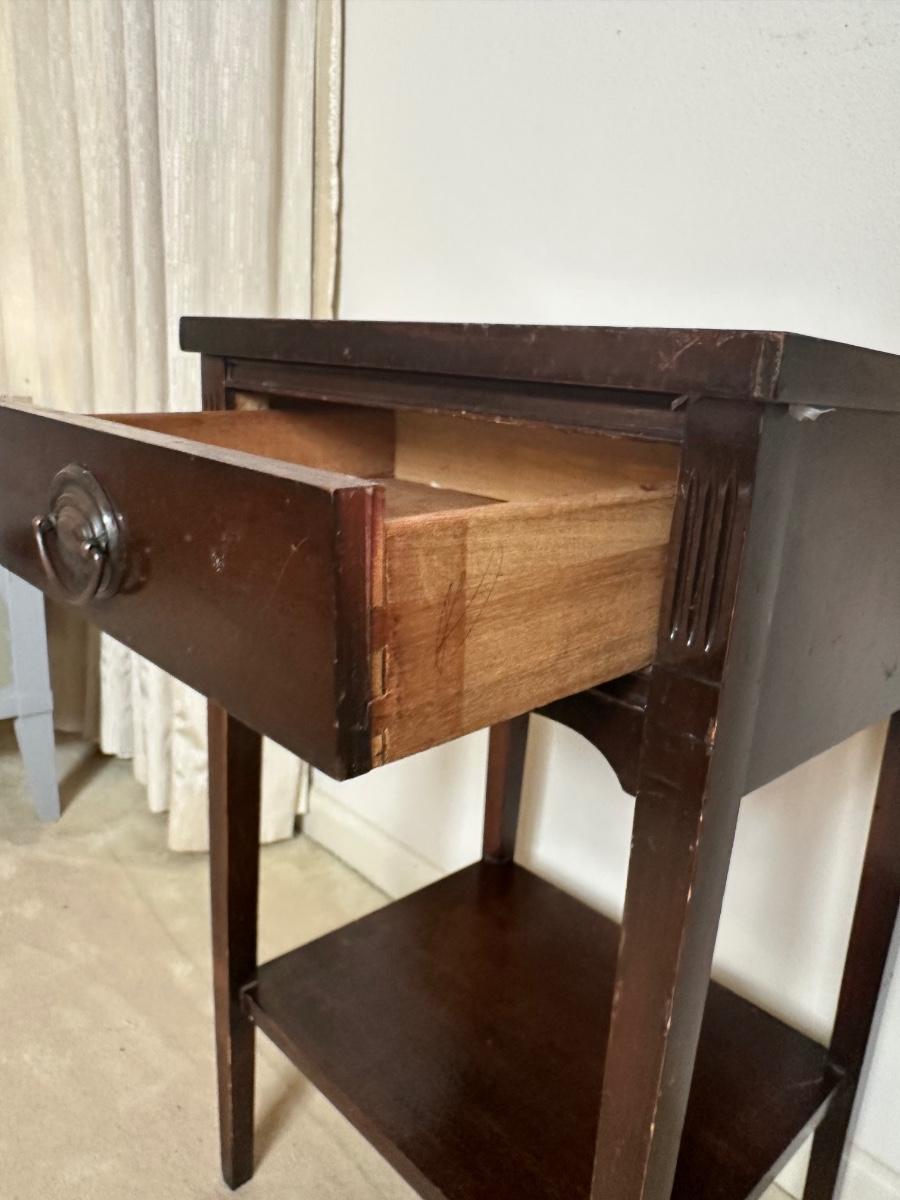 Vintage Dixie wooden side table featuring one drawer with the original pull and a lower shelf for added storage. The table shows surface wear, scratches, and a carved name on the top.