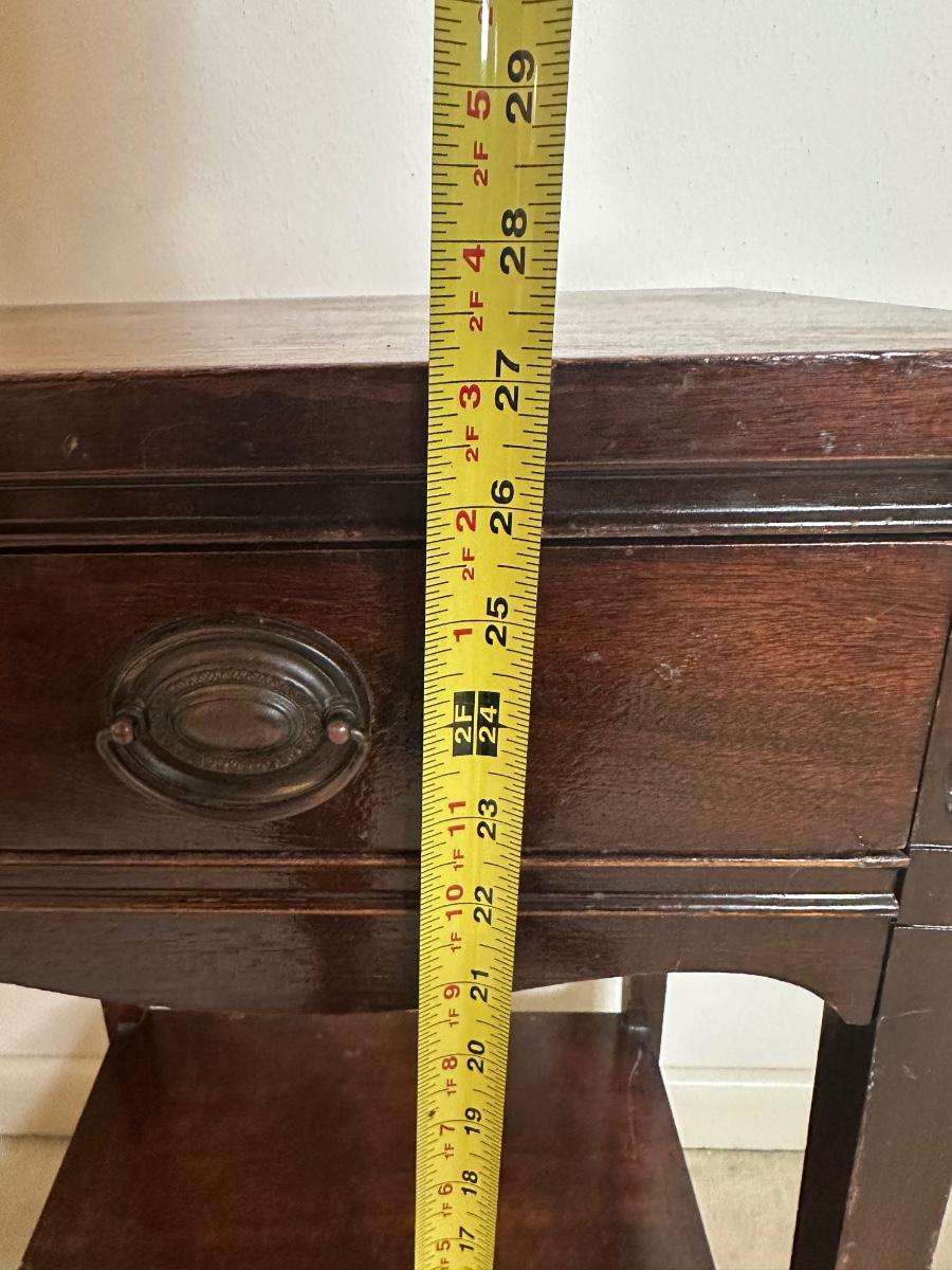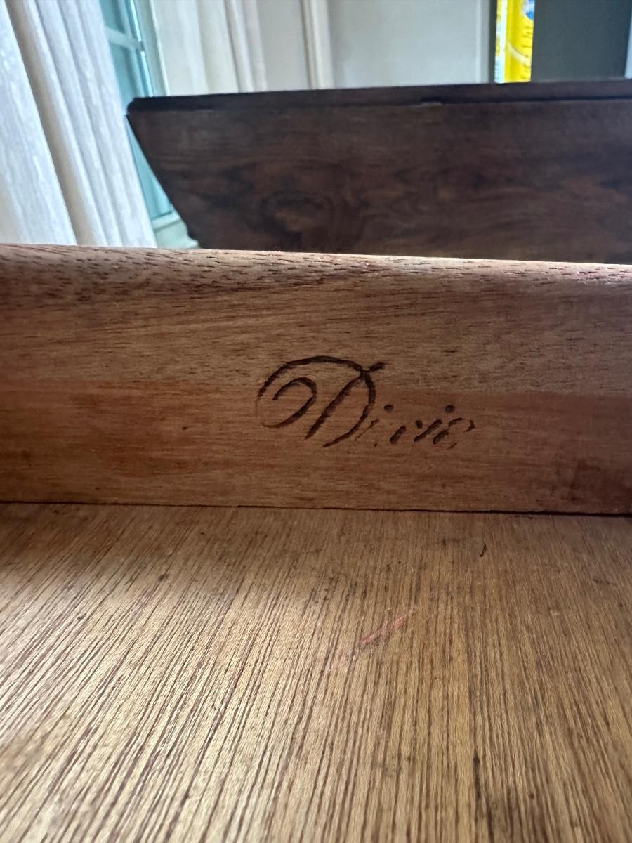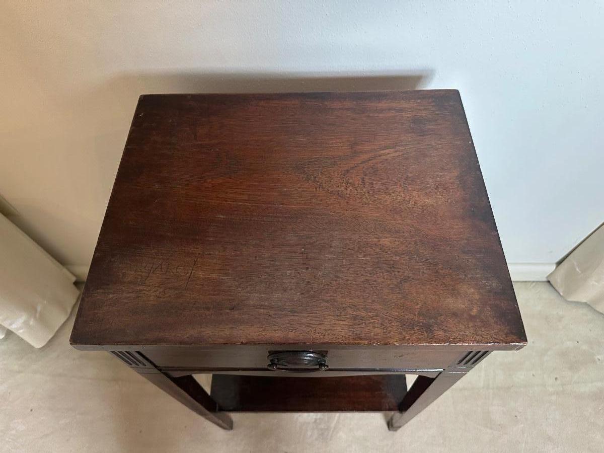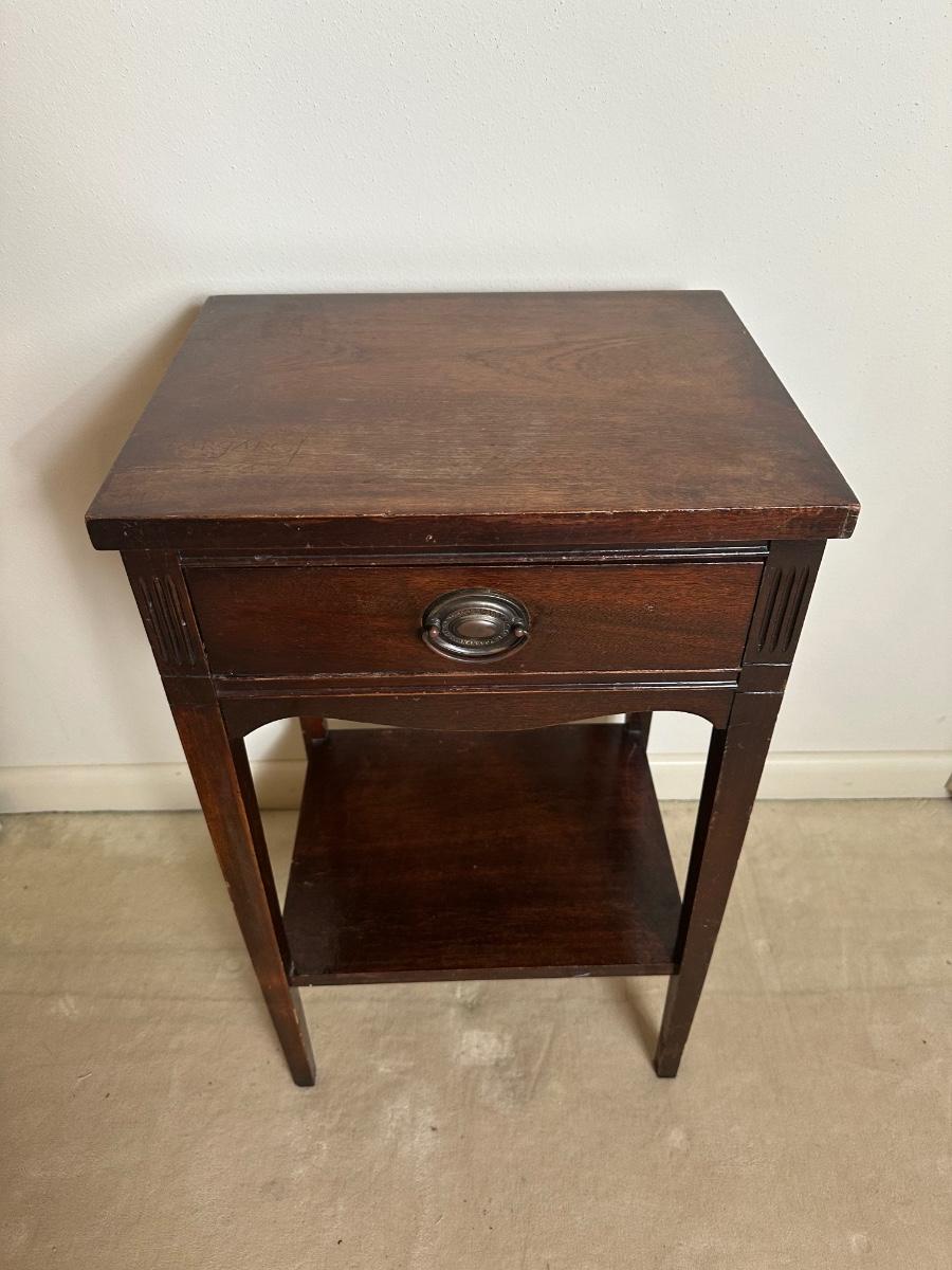 Vintage Dixie wooden side table featuring one drawer with the original pull and a lower shelf for added storage. The table shows surface wear, scratches, and a carved name on the top.