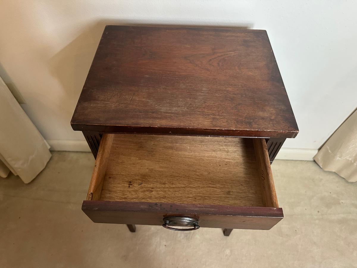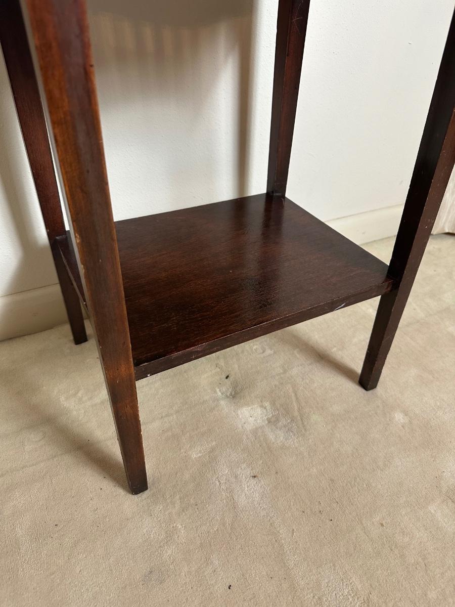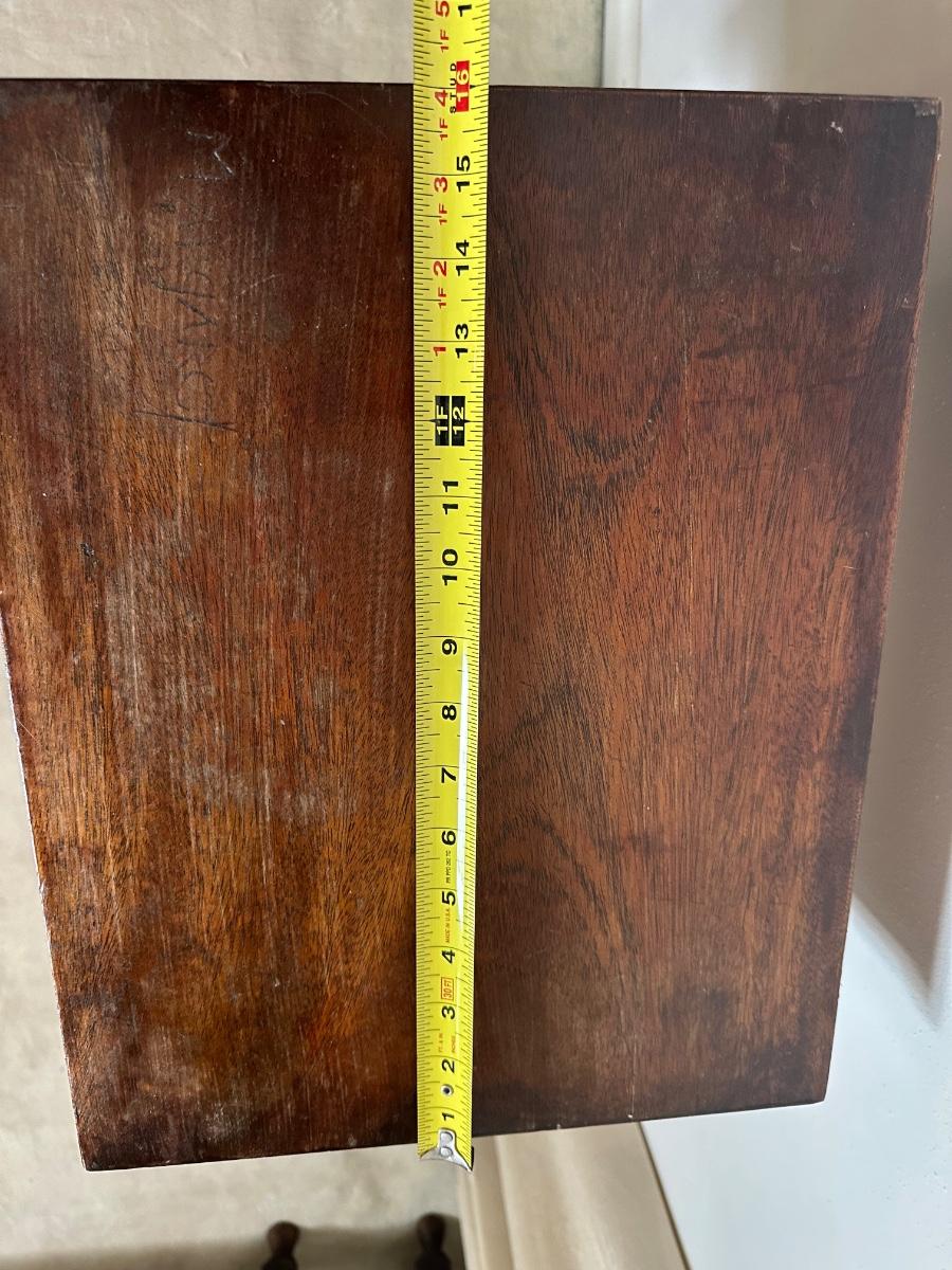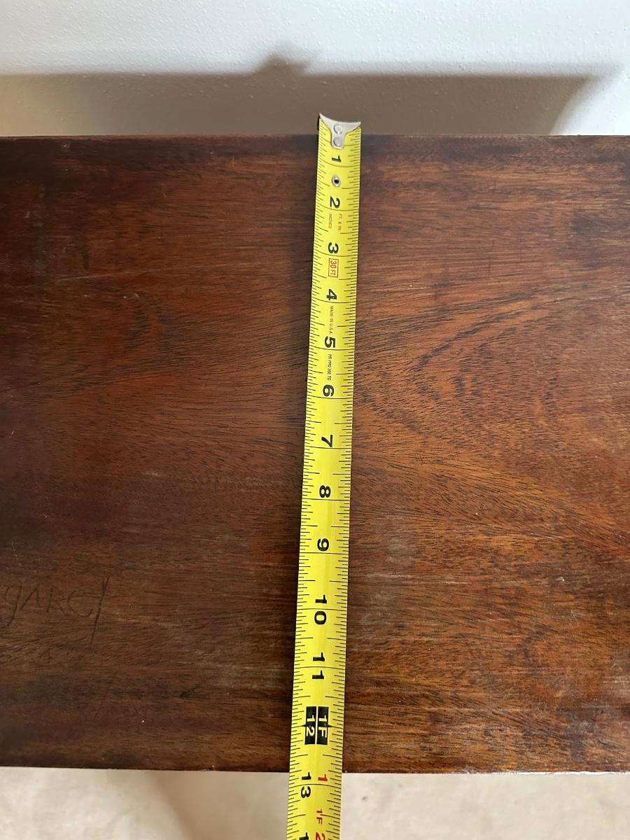 Vintage Dixie wooden side table featuring one drawer with the original pull and a lower shelf for added storage. The table shows surface wear, scratches, and a carved name on the top.