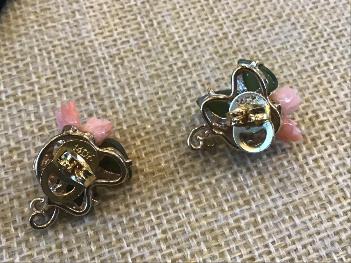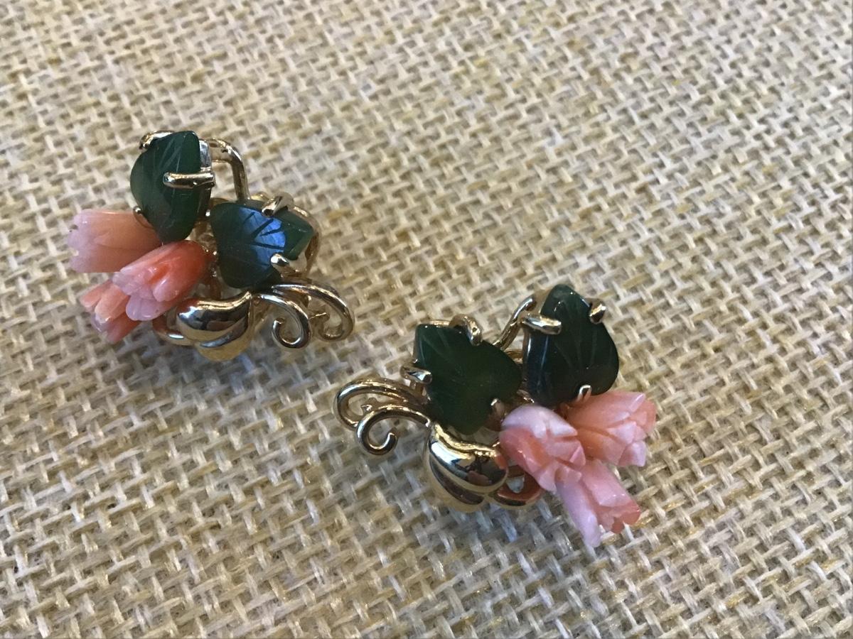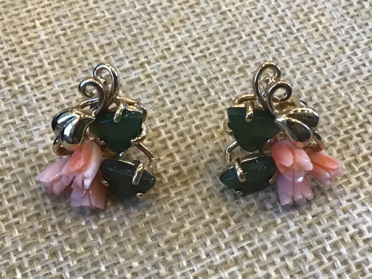 Vintage 14 DK Carved Flower Pink Angel Skin Coral and Jade Stud Earrings