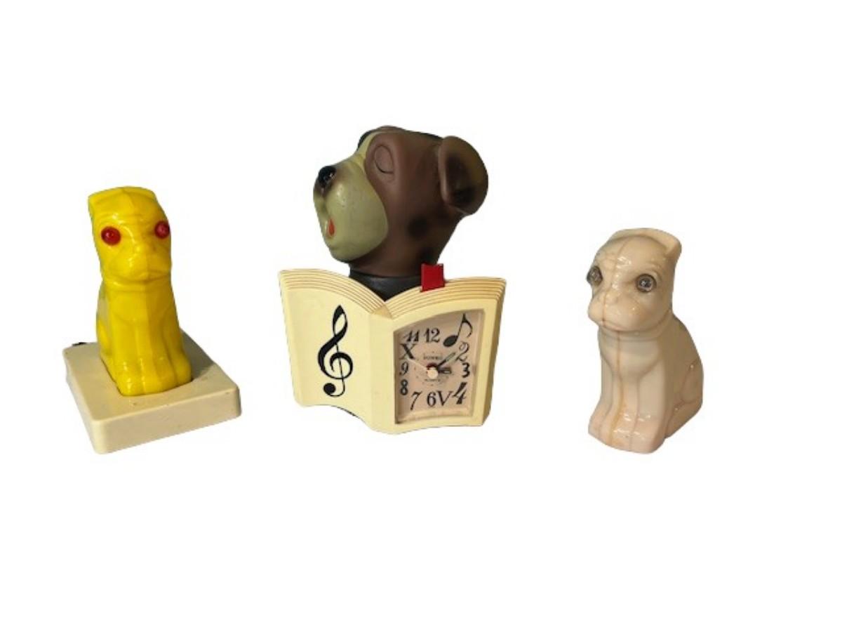 Includes a clock, a lamp, and a Flasher plastic dog night light. The clock is missing the battery cover. Age related wear. The night light has a crack (pictured). Not tested. Measurement of largest: 8"H.
