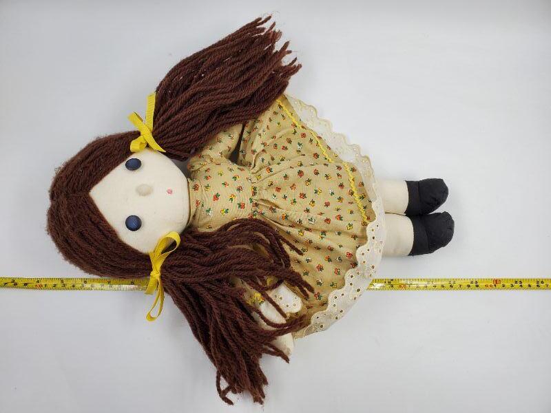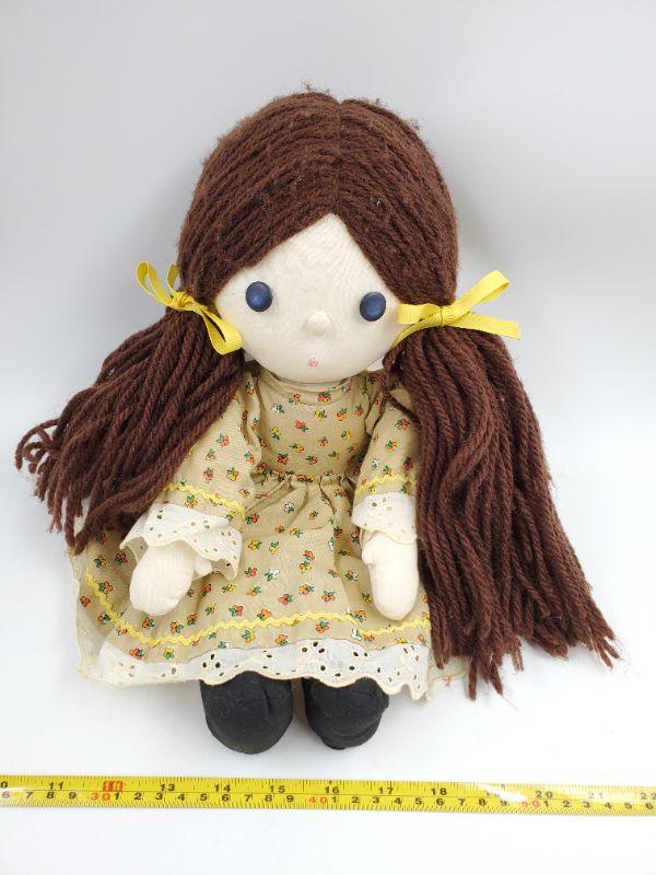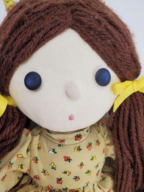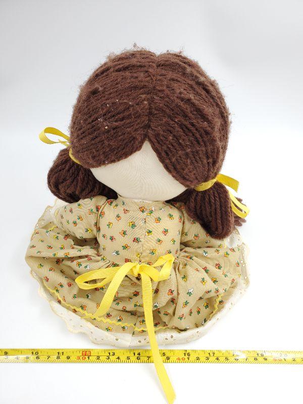 This doll is adorable with dark blue button like eyes and brown yarn hair. Her hair is a little fuzzy and the lace edging of the dress is a bit yellowed, but a cute doll nonetheless!