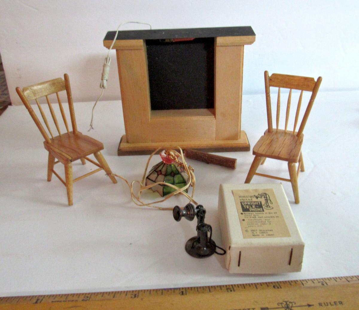 Vintage Doll House Furniture and Wired Fireplace and Lamp