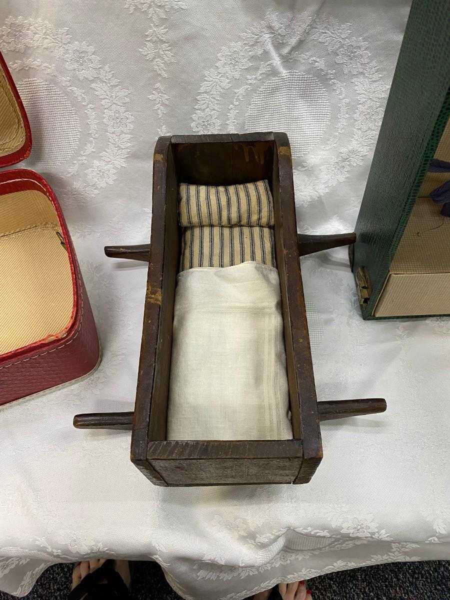 Doll baby crib with mattress and pillow, primitive 6 x 12.5 inches