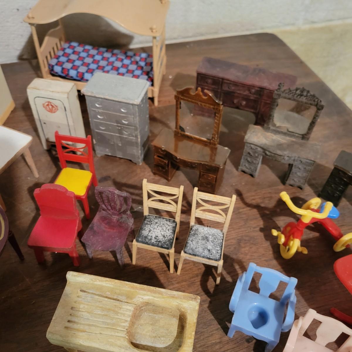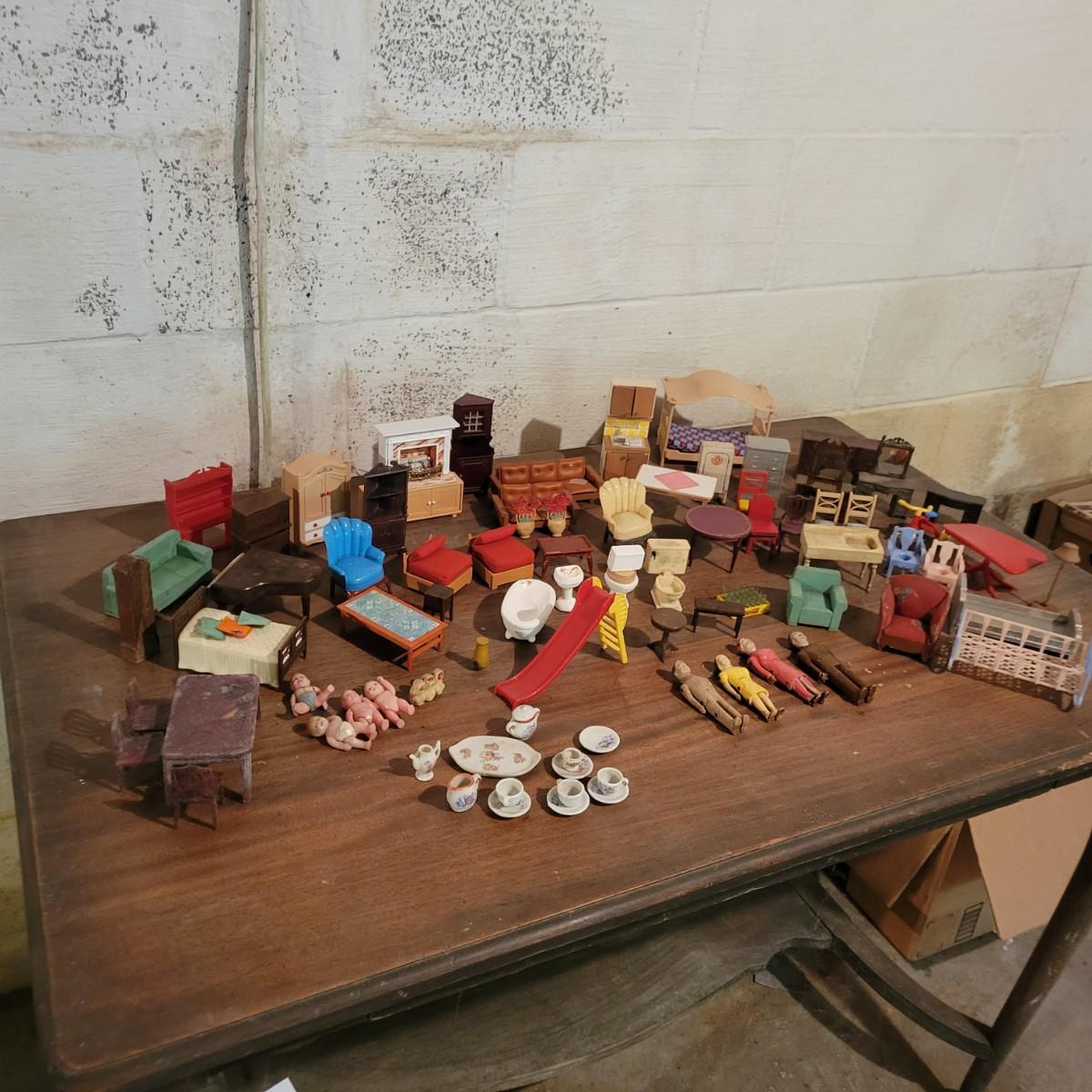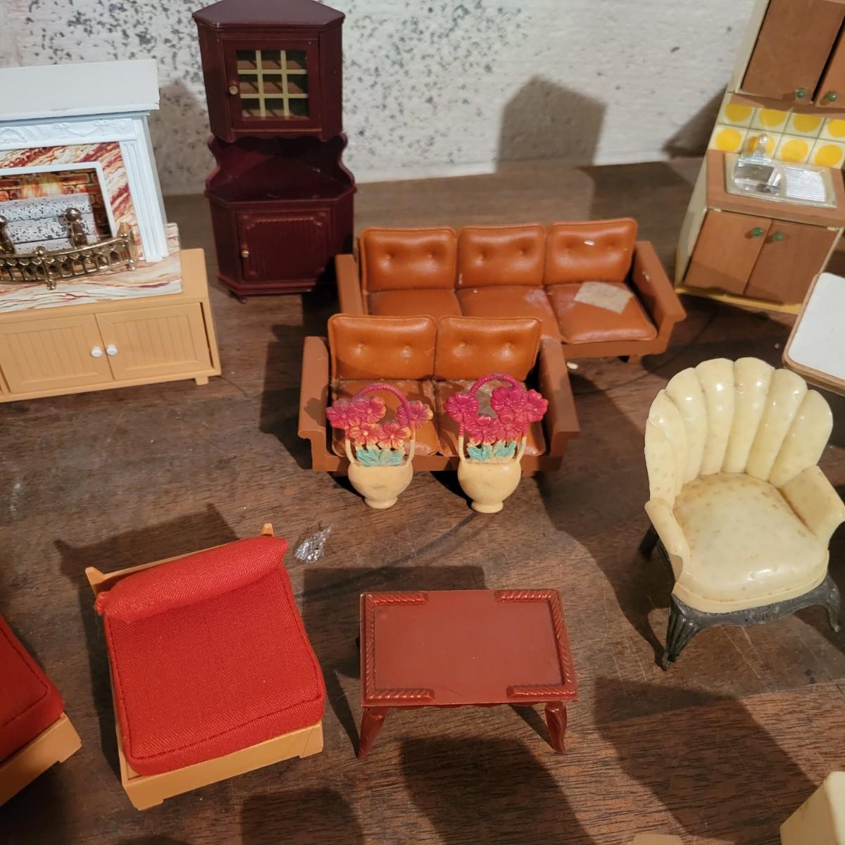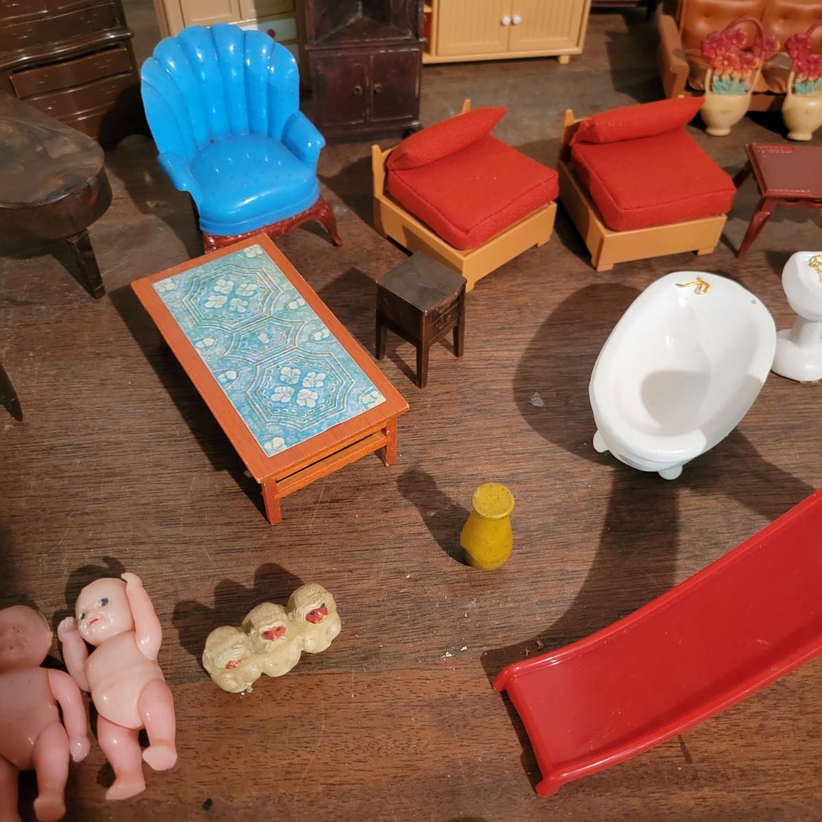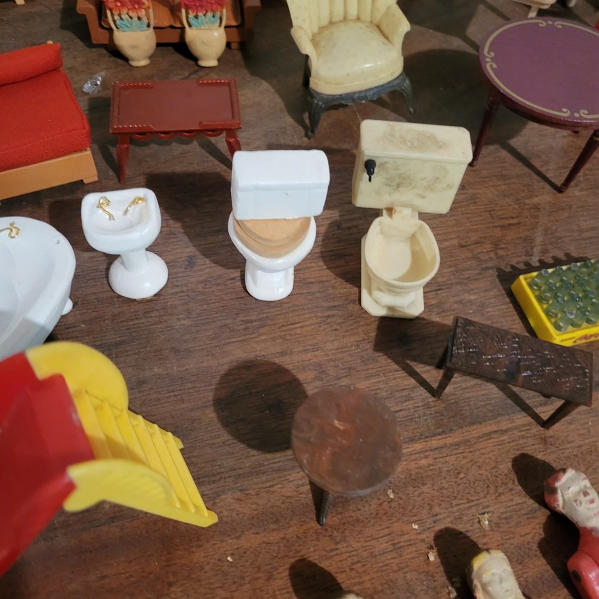 A large collection of assorted dollhouse accessories and items. Pieces are in fair to good condition from storage and use. Most items are plastic, but the bathroom set is ceramic and there are some wooden pieces. Shipping available.