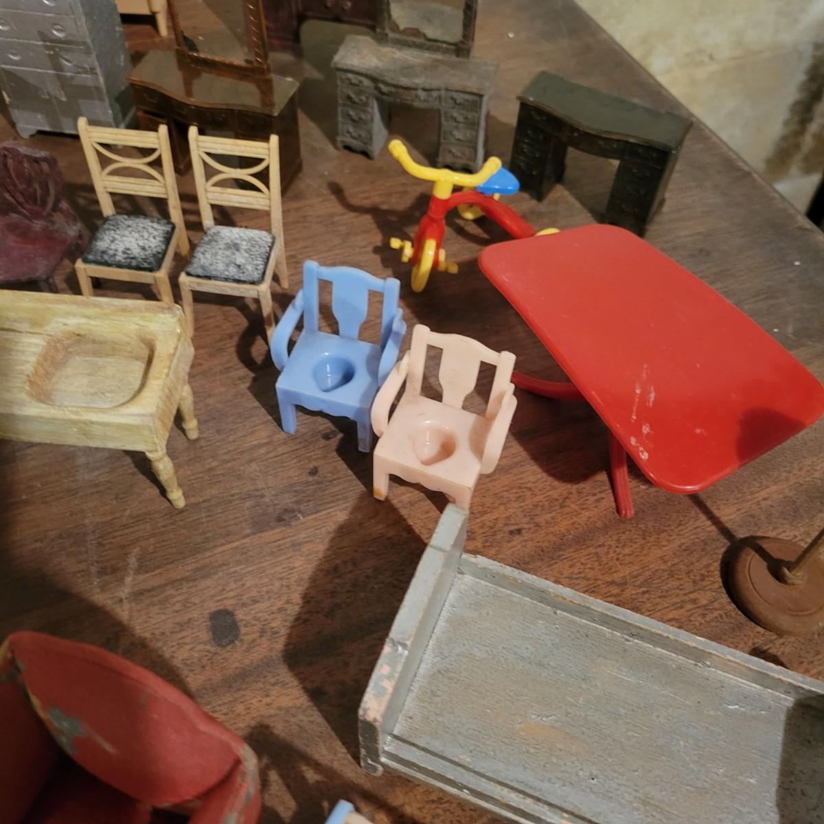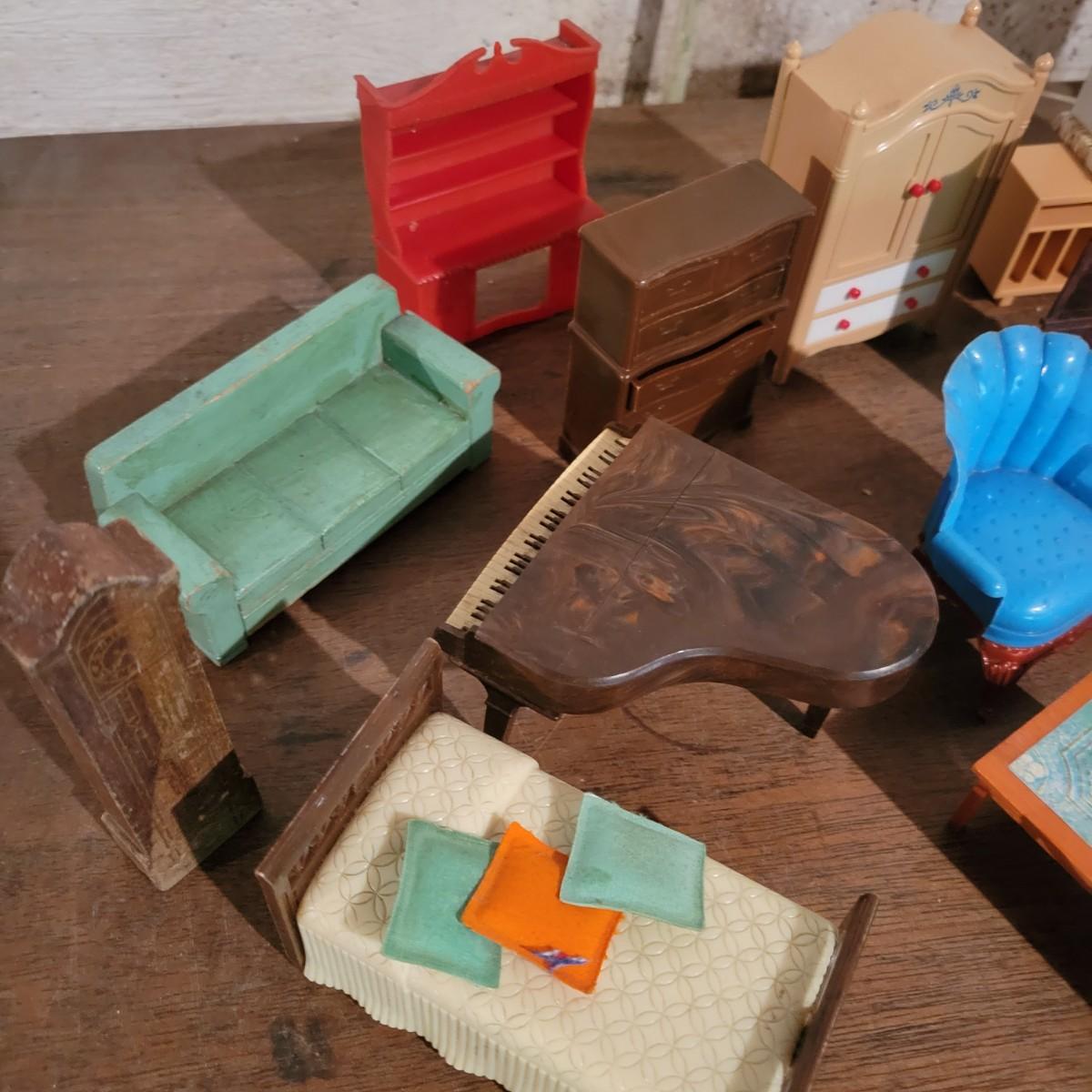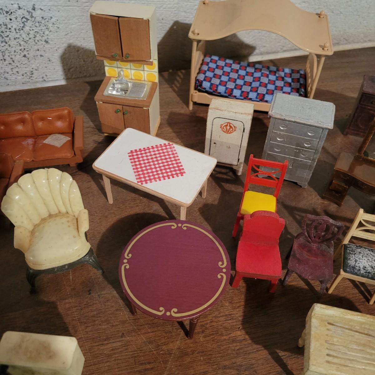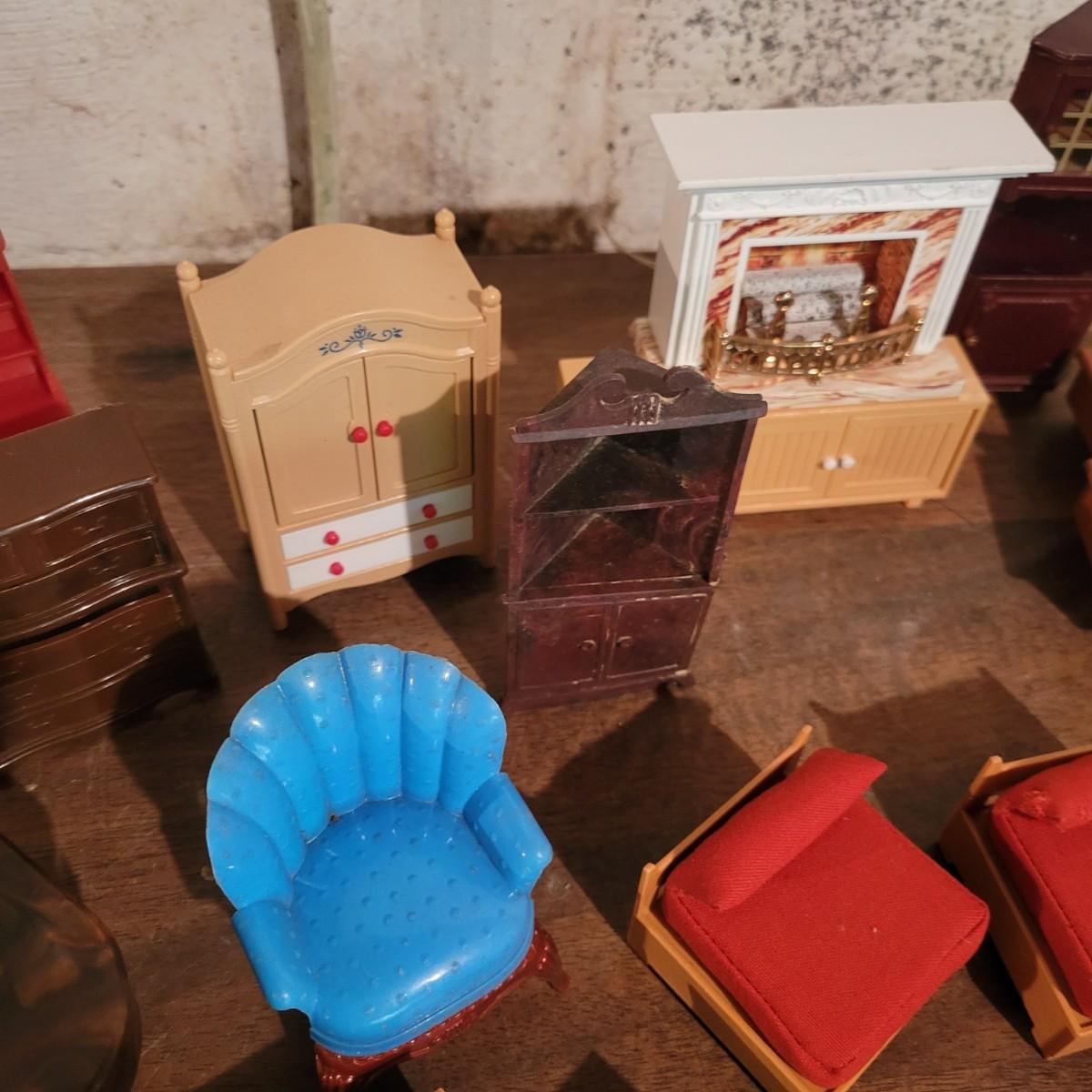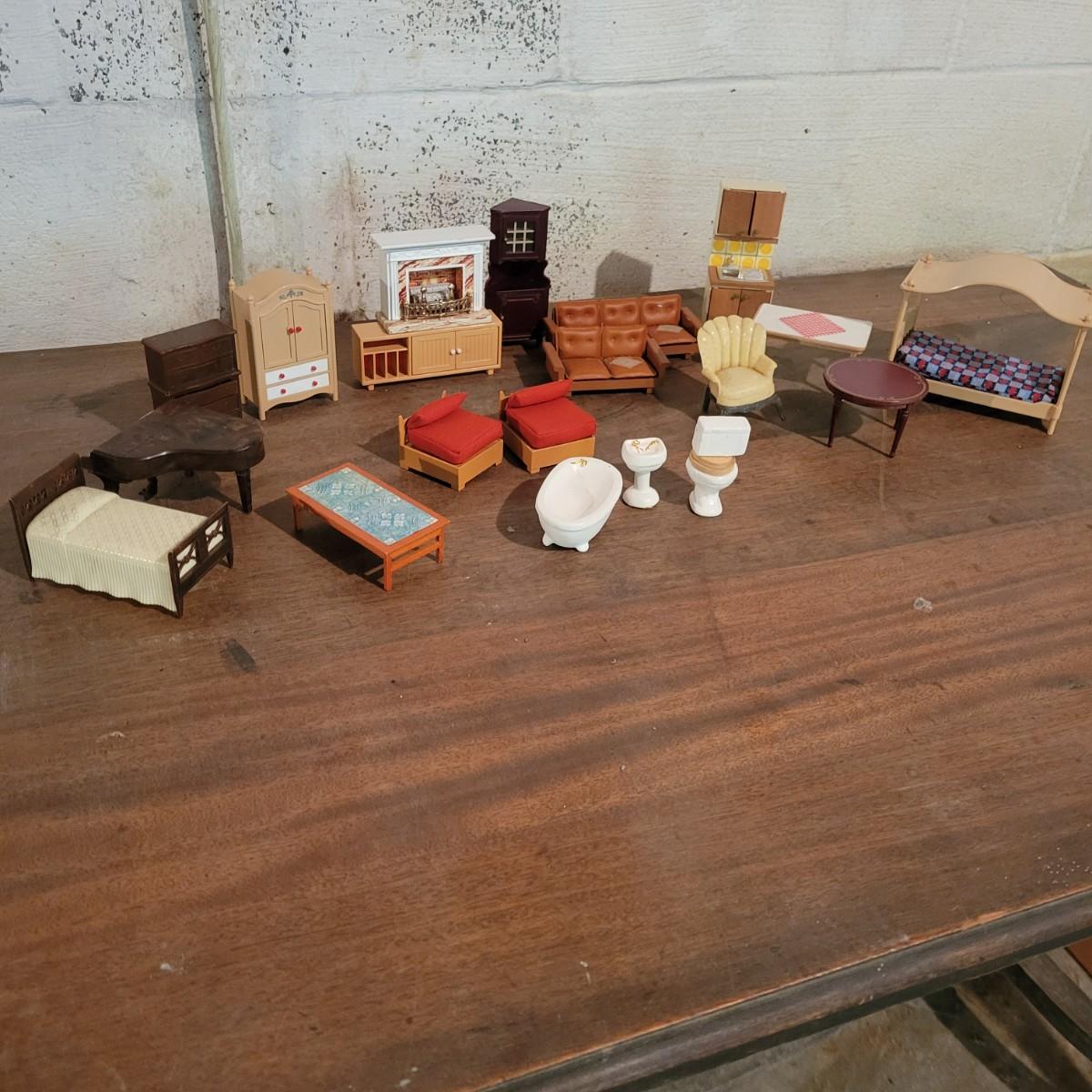 A large collection of assorted dollhouse accessories and items. Pieces are in fair to good condition from storage and use. Most items are plastic, but the bathroom set is ceramic and there are some wooden pieces. Shipping available.