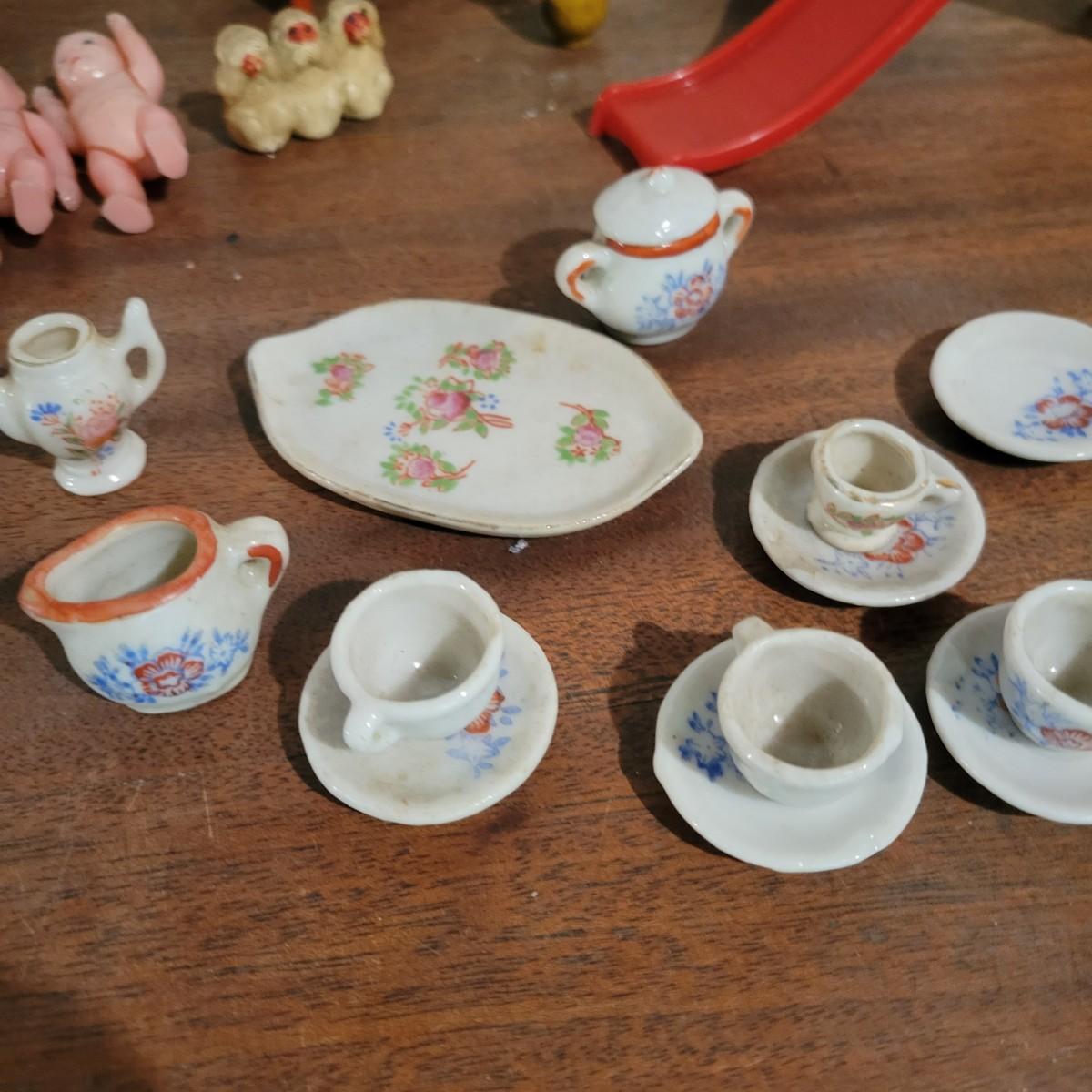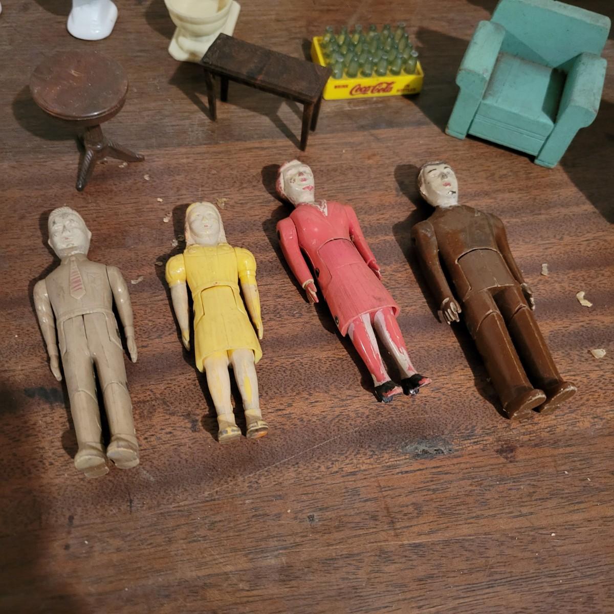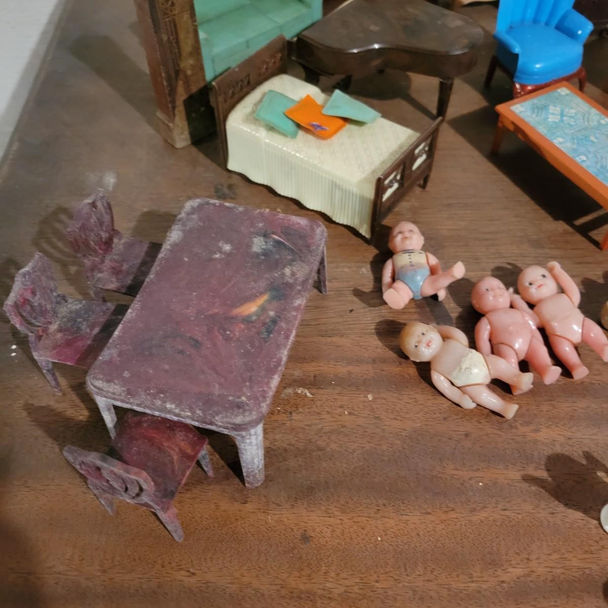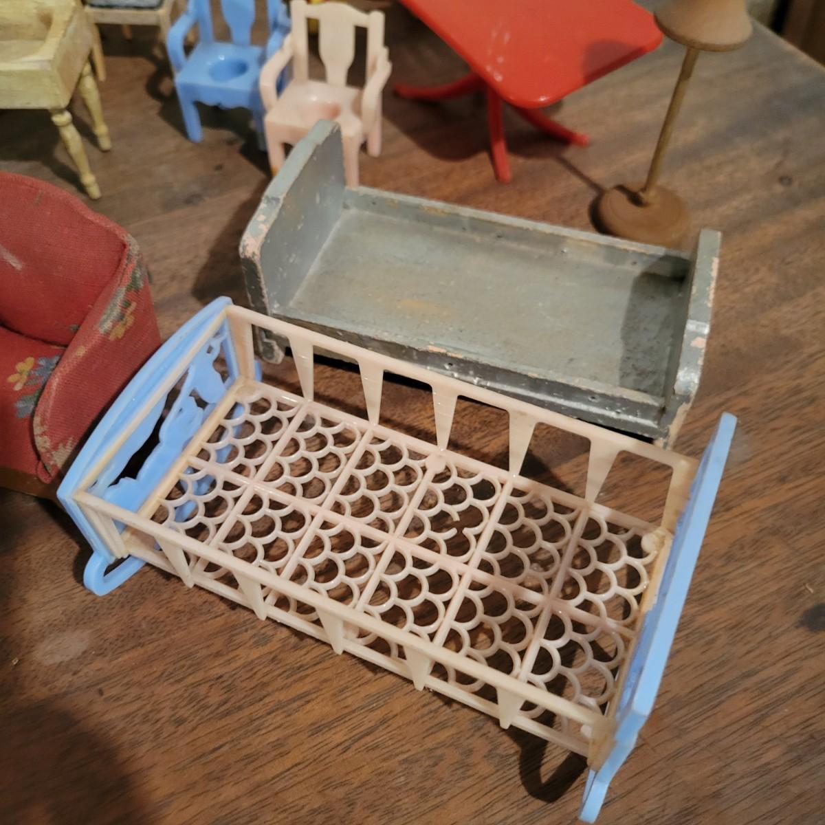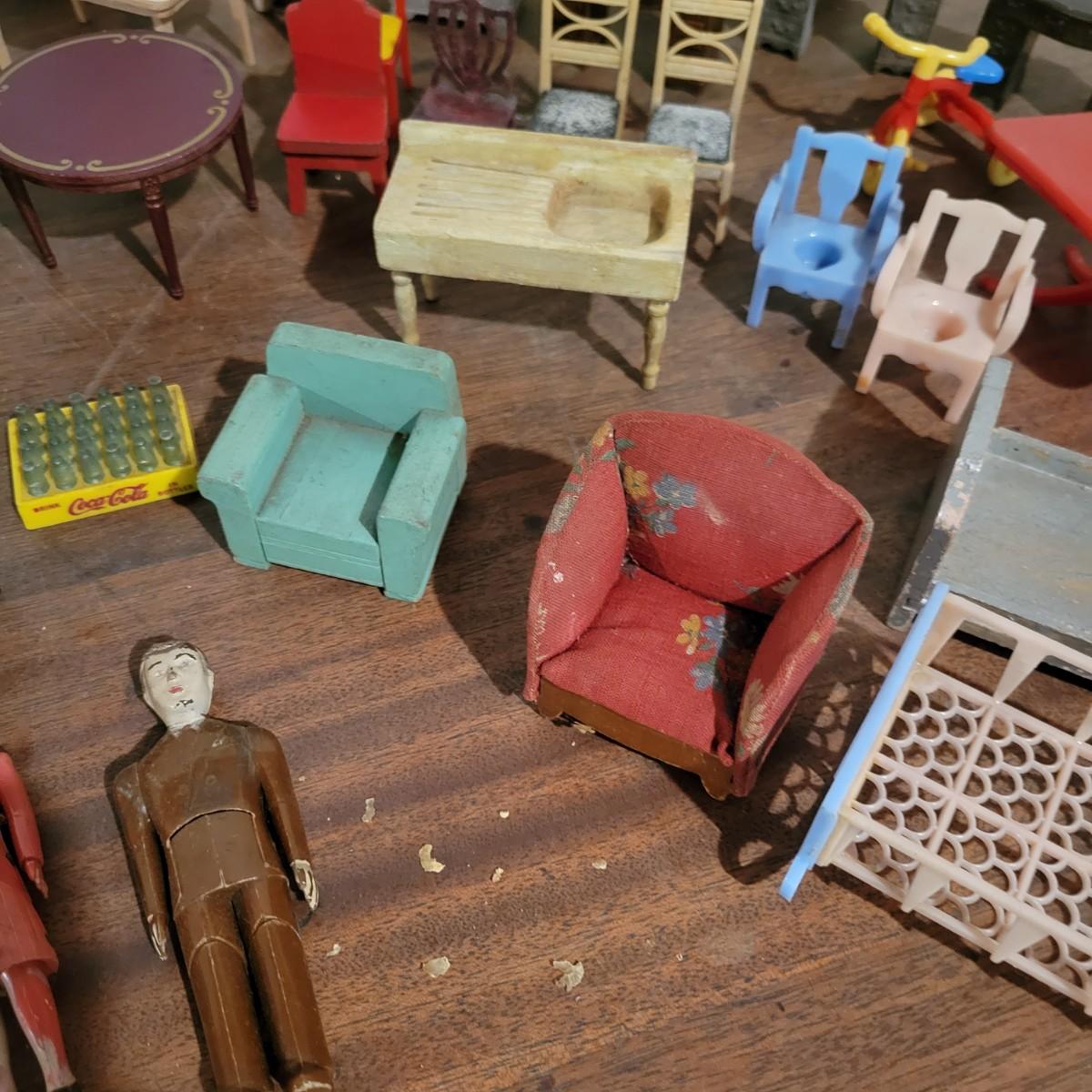 A large collection of assorted dollhouse accessories and items. Pieces are in fair to good condition from storage and use. Most items are plastic, but the bathroom set is ceramic and there are some wooden pieces. Shipping available.