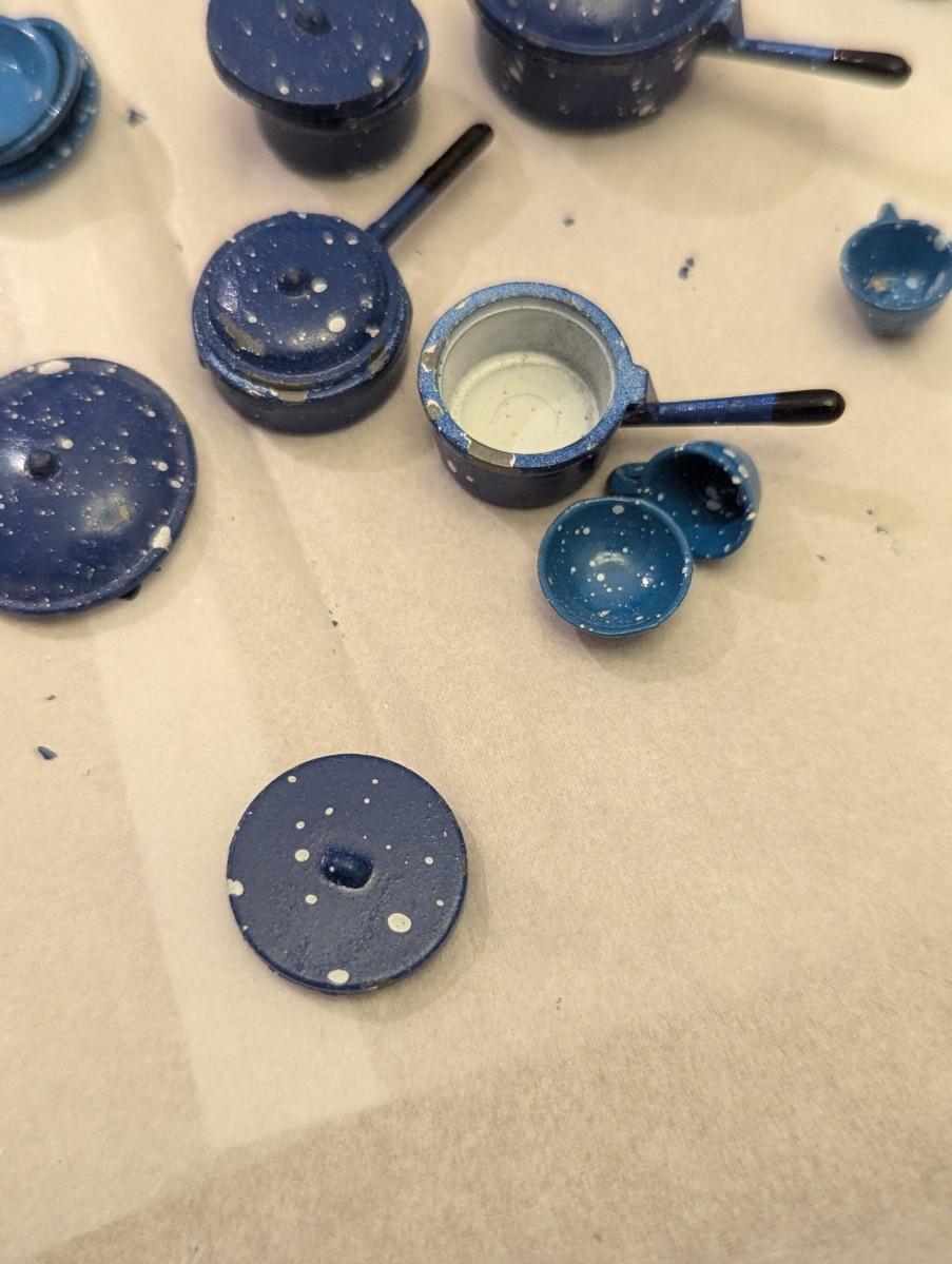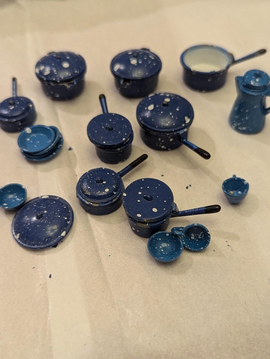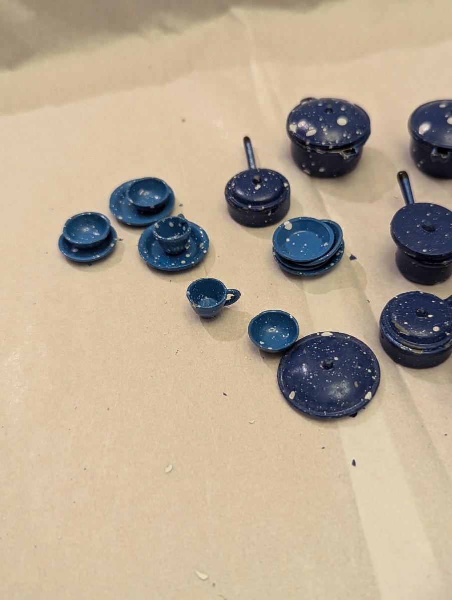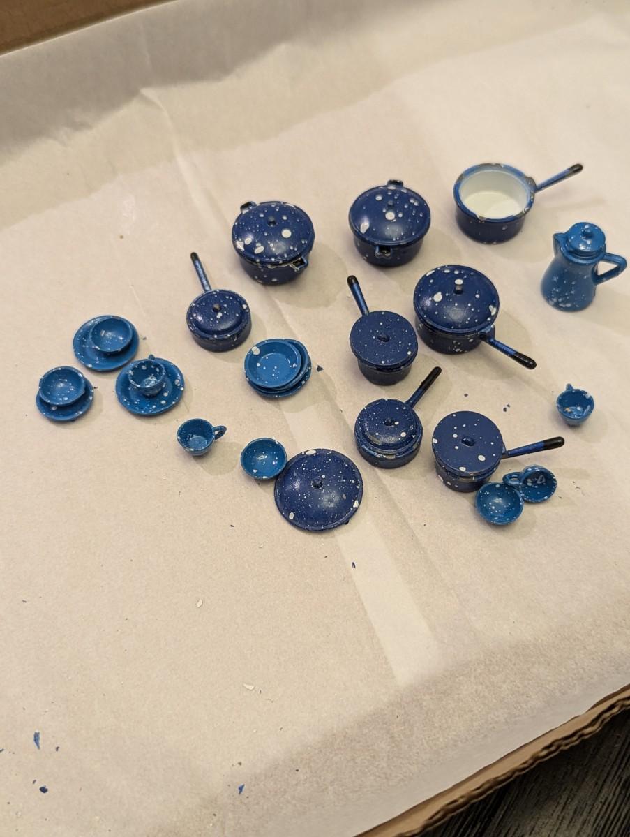 Vintage Dollhouse Miniature Blue Enamel Metal Dishes